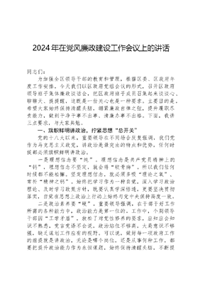 2024年在党风廉政建设工作会议上的讲话同志们:为加强全区领导干部的教育和管理,根据区委、区政府年度工作安排,今天我们以区政府党组会议的形式,召开区政府领导班子集体廉政谈话会,把区政府班子成员召集起来谈谈心、聊聊天、提提醒,这既是一份关心也是一种要求。主要目的是,希望大家始终保持清醒头脑,绷紧廉政自律之弦,提升履职尽责能力,做到干净干事不出事、清廉办事不出格。下面,我讲三点要求,与大家共勉。一、旗帜鲜明讲政治,拧紧思想总开关党的十八大以来,重要领导在不同场合反复强调,我们党作为马克思主义政党,讲政治是最突出的特点和优势,任何时候都必须旗帜鲜明讲政治。一是理想信念要纯。理想信念是共产党员精神上的钙,理想信念不坚定,就会得软骨病。所以我们任何时候都不能松懈。坚定理想信念,就必须多吸理论之氧、常补精神之钙。始终把学习作为一种自觉,深入学习政治理论、及时学习政策方针,既要认真学深悟透,更要坚决贯彻落实,自觉在思想上政治上行动上始终与党中央保持高度一致。二是政治素养要硬。重要领导强调,在干部干好工作所需的各种能力中,政治能力是第一位的。工作中,个别领导干部因工学矛盾,放松了对党性修养的要求,应知应会知识不熟悉,党言党语不会说,政治站位不够高,大局意识不够强,缺乏谋划工作应有的视野。可以说,做好每一项政府工作的前提就是讲政治,无论是哪个岗位,还是从事何种工作,都要把提升政治能力作为永恒课题,始终保持清醒头脑,不断提高政治判断力、政治领悟力、政治执行力。三是工作作风要实。某位领导曾说过,坐在办公室碰到的都是问题,下去调研看到的全是办法。这就要求我们转变工作作风,做到立说立行。大家要在严于律己上坚持最高标准,要求别人做到的,自己率先做到,要求别人不做的,自己坚决不做,以实际行动体现担当作为。带头力戒形式主义,端正工作作风、扑下身子实干、大兴务实之风,主动与群众沟通交流,自觉接受群众监督,让改革发展成果惠及更多群众。二、清正廉洁守底线,筑牢事业安全堤在今年的国务院和省市政府系统廉政工作会议上,各级领导都告诫我们,当前政府系统反腐败斗争形势依然严峻复杂,一些重点领域和关键环节廉政风险突出,违反中央八项规定精神、贪污腐败、履职不力等问题依然多发频发。为此,我们要自我警示、全面警醒、高度警惕,千万不能松了廉洁自律这根弦。一要算好三本账。即:利益账、法纪账、名誉账。遇事算好三本账,练就一身清正廉洁的真功夫,做到无欲则刚,挡住糖衣炮弹。大家要用自己的行动,回答好我是谁、为了谁、依靠谁的人生考卷,警钟长鸣、严于自律,在利益面前多想想是否合情合理、合法合规,在法纪面前多想想行不行、值不值、碰不碰,在名誉面前多想想现在的工作、身后的家庭、身边的朋友,老老实实做人,干干净净做事,万不可做出一失足成千古恨的事来。二要念好三字经。即:念好始微独三字经。俗话说,小节失守,大节难保;小洞不补,大洞难堵。贪腐往往是从一餐饭、一包烟、一瓶酒开始,如同温水煮青蛙一样,让我们逐渐地放松警惕,最后不可自拔。要时刻明法纪、知敬畏、存戒惧,职位越高、权力越大,越要如履薄冰、如临深渊,决不能无法无天、无所顾忌;要时刻增强自制力,心存敬畏、手握戒尺,从小节防起,从独处时防起,从细微处防起,文可居文库——海量学习资料,手机电脑均可下载www.wenkeju.com努力做到为政以廉、为政以德、为政以民。三要把好三条线。即:法律底线、纪律红线、思想高线。要时刻用国家的法律规定、党的规章制度、社会的道德准则约束自己,在做人做事上有原则、有底线、有规矩。只有不逾越法律底线、不触碰纪律底线,才能守住自己的政治生命线,守住党和人民交给自己的政治责任;只有离高线越近,才会离底线越远。要带头敬法畏纪、遵规守矩,主动在思想上筑牢防线、在行为上明确界限,常思贪欲之害,常弃非分之想,守得住清贫,耐得住寂寞。特别是要严格执行请示报告制度,该请示的请示,该报告的报告,决不能拿政治纪律和政治规矩当儿戏。三、率先垂范作示范,当好廉政领头雁区政府班子成员都是关键少数,必须以更加强烈的政治担当,把党风廉政建设主体责任履行好、落实好、示范好。具体讲就是做好三个表率。一要当好守土尽责的表率。牢固树立抓好党风廉政建设是本职,不抓党风廉政建设是失职,抓不好党风廉政建设是不称职的理念,把党风廉政和反腐败工作与分管工作同谋划、同部署、同推进,敢抓敢管,敢于批评,督促分管部门负责人耕好自己的责任田,看好自己的门,管好自己的人,切实履行党风廉政建设主体责任。二要当好廉洁从政的表率。带头遵守党纪国法和廉洁自律各项规定,做到坚守正道、坚持原则,清白做人、清正廉洁。坚决贯彻落实民主集中制、严格执行三重一大集体决策、重大事项请示报告