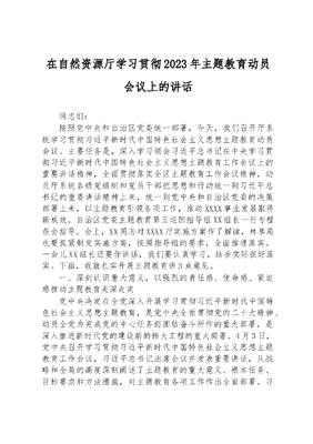 在自然资源厅学习贯彻2023年主题教育动员会议上的讲话同志们:按照党中央和自治区党委统一部署,今天,我们召开厅系统学习贯彻习近平新时代中国特色社会主义思想主题教育动员会议。主要任务是,深入学习领会习近平总书记在中央学习贯彻习近平新时代中国特色社会主义思想主题教育工作会议上的重要讲话精神,全面贯彻落实全区主题教育工作会议精神,动员厅系统各级党组织和党员干部把思想和行动统一到习近平总书记的重要讲话精神上来,统一到党中央和自治区党委的决策部署上来,以主题教育引领各项工作,推动XXXX事业发展取得新成效。自治区党委主题教育第五巡回指导组XX组长一行专程莅会指导。会上,XX同志对XXXX厅实施方案作了解读,林草局也要抓紧制定实施方案,按照指导组的要求,全面推进落实。一会儿XX组长还要作讲话,我们要认真学习,结合实际抓好落实。下面,我就扎实开展主题教育讲3点意见。一、深刻认识重大意义,以强烈的责任感、使命感、紧迫感推动主题教育走深走实党中央决定在全党深入开展学习贯彻习近平新时代中国特色社会主义思想主题教育,是党中央全面贯彻党的二十大精神、动员全党为完成党的中心任务而团结奋斗所作的重大部署,是深入推进新时代党的建设新的伟大工程的重大部署。4月3日,党中央召开学习贯彻习近平新时代中国特色社会主义思想主题教育工作会议,习近平总书记出席会议并发表重要讲话,从战略和全局的高度深刻阐述了主题教育的重大意义、根本任务、目标要求和方法措施,对主题教育各项工作作出全面部署。习近平总书记的重要讲话高屋建瓴、视野宏阔,精辟深邃、内涵丰富,具有很强的政治性、思想性、指导性,为全党开展主题教育提供了根本遵循,是一篇马克思主义纲领性文献。4月9日,自治区党委对标看齐跟进,统筹部署全区主题教育工作,言顺书记就扎实开展主题教育提出具体要求,为我们做好各项工作理清了思路、明确了方法、划出了重点。厅系统各级党组织和党员干部要提高政治站位,深刻认识开展这次主题教育的重大政治意义、理论意义和实践意义,切实把思想和行动统一到习近平总书记重要讲话精神上来,统一到党中央和自治区党委决策部署上来,以强烈的政治担当、饱满的政治热情、严肃的政治态度,积极投身主题教育,确保取得实效。(一)要站在坚定拥护两个确立、坚决做到两个维护的政治高度,深刻认识开展主题教育的重大意义。团结统一是党的生命,是党的力量所在。思想上的统一是党的团结统一最深厚、最持久、最可靠的保证。党的十八大以来,在以习近平同志为核心的党中央坚强领导下,在习近平新时代中国特色社会主义思想科学指引下,我们党汇聚比铁还硬、比钢还强的团结之力,以党有核心、万众一心的奋进之志,赢得了彪炳史册的历史性胜利。实践证明,两个确立是国家富强、民族复兴、人民幸福的定盘星和压舱石,两个维护是保证党团结统一、坚强有力的关键所在,必须倍加珍惜、坚定维护、长期坚持。开展主题教育,就是要坚持不懈用党的创新理论统一思想、统一意志、统一行动,教育引导党员干部从思想上正本清源、固本培元,深刻领悟两个确立的决定性意义,增强四个意识、坚定四个自信、做到两个维护,高高举起总书记怎么说、我们就怎么做的鲜明旗帜,始终在思想上政治上行动上同党中央保持高度一致。(二)要站在全面贯彻党的二十大决策部署、全面建设社会主义现代化美丽新XX的全局高度,深刻认识开展主题教育的重大意义。党的二十大描绘了以中国式现代化推进中华民族伟大复兴的宏伟蓝图,这是一项开天辟地的开创性事业,必然会遇到前所未有的全新课题、难以预料的风险挑战、惊涛骇浪的重大考验。前进道路上,只有紧跟习近平总书记,坚持不懈用习近平新时代中国特色社会主义思想凝心铸魂,才能展真理之旗、掌时代之舵、扬复兴之帆,不断赢得优势、赢得主动、赢得未来。站在新时代新征程,我们唯有以胸怀国之大者的气魄和定力,找准职能定位,才能站位全局、融入新局;唯有保持锐意进取、迎难而上的奋斗姿态,才能在全面建设社会主义现代化美丽新XX伟大实践中展作为、开新局。当下,XXXX工作在服务高质量发展方面仍有一些制度机制上的短板需要补齐,一些影响制约规划落实、耕地保护、生态修复的瓶颈问题需要继续攻坚,群众关心关切的不动产登记办证难、土地征收程序不规范、补偿不到位等问题亟待解决,在助推乡村全面振兴、推动土地权改革等重大领域还大有可为,这都需要我们从习近平新时代中国特色社会主义思想这一重大理论中明方向、明思路,找方法、找路径。开展主题教育,就是要带领系统党员干部学思想、见行动,树立正确权力观、政绩观、事业观,不断提高推动高质量发展、服务群众、防范化解风险本领,以争先领跑、担当有为的精气神,在建设美丽新XX伟大实践中展现新担当、作出新贡献。(三)要站在牢记两个永远在路上、一刻不停推进全面从严治党的战略高度
