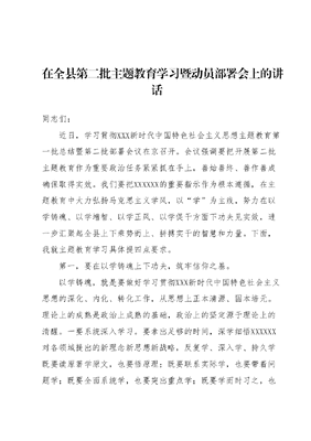 在全县第二批主题教育学习暨动员部署会上的讲话同志们:近日,学习贯彻XXX新时代中国特色社会主义思想主题教育第一批总结暨第二批部署会议在京召开。会议强调要把开展第二批主题教育作为重要政治任务紧紧抓在手上,善始善终、善作善成确保取得实效。我们要把XXXXXX的重要指示作为根本遵循,在主题教育中大力弘扬马克思主义学风,以学为主线,努力在以学铸魂、以学增智、以学正风、以学促干方面下功夫见实效,进一步汇聚起全县上下乘势而上、拼搏实干的智慧和力量。下面,我就主题教育学习具体提四点要求。第一,要在以学铸魂上下功夫,筑牢信仰之基。以学铸魂,就是要做好学习贯彻XXX新时代中国特色社会主义思想的深化、内化、转化工作,从思想上正本清源、固本培元。理论上的成熟是政治上成熟的基础,政治上的坚定源于理论上的清醒。一要系统深入学习。要拿出足够的时间,深学细悟XXXXXX对各领域提出的新理念新思想新战略,反复学、深入学、持久学既要读原著学原文,也要悟原理;既要联系实际学,也要带着问题学;既要全面系统学,也要突出重点学;既要学而时习之,也要学而恒用之,做到融会贯通、烂熟于胸。二要做到知行合一。XXX新时代中国特色社会主义思想作为当代中国马克思主义、21世纪马克思主义,蕴含着为历史和时代所证明的真理力量和实践伟力,必须全面掌握其科学体系、精髓要义、实践要求,把对党忠诚的要求内化于心、外化于行,始终做到在党爱党、在党言党在党忧党、在党为党。第二,要在以学增智上下功夫,提高发展之能。以学增智,就是要从党的科学理论中悟规律、明方向、学方法、增智慧,把看家本领、兴党本领、强国本领学到手。要从新时代中国特色社会主义思想中汲取奋发进取的智慧和力量,熟悉掌握其中蕴含的领导方法、思想方法、工作方法,不断提高履职尽责的能力和水平。一要掌握破解难题的思维方法。坚持好、运用好贯穿于XXX新时代中国特色社会主义思想的立场观点方法,坚持人民至上,坚持自信自立,坚持守正创新,坚持问题导向,坚持系统观念,坚持胸怀天下,才能把思想方法搞对头,认识问题才站得高,分析问题才看得深,我们的各项工作才能做得更好,才能推动X建设行稳致远。二要提升专业素养和能力。面对艰巨繁重的X建设任务,面对可以预料和难以预料的各种风险挑战,需要我们锤炼本领增长才干,加快构建与之相适应的专业知识和专业能力体系,持续增强推动高质量发展本领、服务群众本领、防范化解风险本领,立足岗位,坚持干什么学什么、缺什么补什么,在补短板、强弱项中提高履职尽责、破解难题的能力水平。第三,要在以学正风上下功夫,筑牢防变之墙。学正风,就是要自觉用XXX新时代中国特色社会主义思想改造主观世界,接受政治体检,打扫政治灰尘,纠正行为偏差,当好良好政治生态和社会风气的引领者、营造者、维护者。一要勇于自我革命。要把解决问题贯穿主题教育全过程,对标对表,把自己摆进去、把职责摆进去、把工作摆进去,系统梳理调研发现的问题、推动发展遇到的问题、群众反映强烈的问题,一项一项制定整改措施,能改的马上改,一时难以解决的要盯着不放、一抓到底,发挥好关键少数以上率下示范作用,努力创造经得起历史和人民检验的实绩。二要坚持清正廉洁。要深入学习领会XXXXXX关于全面从严治党的重要论述,对照要求、对准目标,找一找自己在知敬畏、存戒惧、守底线方面存在哪些差距,强化自我修炼、自我约束、自我改造,勤掸思想尘、多思贪欲害常破心中贼,涵养廉洁自律的道德修为,坚守精神高地,做到公正用权、依法用权、为民用权、廉洁用权。第四,要在以学促干上下功夫,展现工作之绩。以学促干,就是要坚持学以致用、知行合一,深化理论学习强化成果运用,把XXX新时代中国特色社会主义思想转化为坚定理想、锤炼党性和指导实践、推动工作的强大力量,在新征程上创造新的历史伟业。一要在担当作为中惠及民生。坚持把所有精力都用在让老百姓过好日子上,问计于民、问需于民,紧紧围绕就业、教育、医疗、托幼、养老等人民群众急难愁盼问题,实施更多有温度的举措、落实更多暖民心的行动,把惠民生、暖民心、顺民意的工作做到群众心坎上,不断增强群众的获得感、幸福感安全感。二要在实践实干中推动高质量发展。善于运用XXX新时代中国特色社会主义思想观察和把握发展形势,锚定本县战略框架完整、准确、全面贯彻新发展理念,加快构建开放型生态型创新型现代产业体系,强化科技创新驱动,促进区域城乡协调融合,奋力推动X建设成型起势、在高质量发展上取得突破性进展。各单位各部门在开展主题教育的过程中,要杜绝形式主义、拒绝走过场,具体我再就本次主题教育工作提四点意见。一、理清路子,在方向上不能有偏差。知之愈明,则行之愈笃。要透彻领悟党的最新理论、路线方针政策和党中央关于开展第二批主题教育的最新决策部署,准确把握党中央在关心什么、强调什么,本地区的重点任