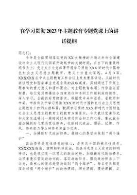 在学习贯彻2023年主题教育专题党课上的讲话提纲同志们:今年是全面贯彻落实党的XX大精神的开局之年和全面建设社会主义现代化国家开局起步的关键时期,在当下的重要时间节点上,党中央在全党部署开展学习贯彻XXX新时代中国特色社会主义思想主题教育,意义十分重大深远。4月3日,XXXXXX在中央主题教育工作会议上发表重要讲话,从新时代新征程党和国家事业发展全局的战略高度,深刻阐述了开展主题教育的重大意义和目标要求,对主题教育各项工作作出全面部署。每位党员都要结合自身岗位和本职工作做到深刻领悟、深入学习,全面抓好贯彻落实。根据党中央和省委、省政府和市委、市政府关于学习贯彻XXX新时代中国特色社会主义思想主题教育工作的安排部署,按照学习贯彻XXX新时代中国特色社会主义思想主题教育主题教育方案要求,今天我以党课形式和大家交流研讨一段时间以来学习体会和工作心得,重点就全面加强新时代党员党性修养,在新时代政治、理论、纪律、作风、修养能力等五种修养方面下功夫。一、加强新时代政治修养,最核心的是坚决做到两个维护政治修养是党性修养的核心,是党员干部的根本性修养。XXXXXX指出,旗帜鲜明讲政治,既是马克思主义政党的鲜明特征,也是我们党一以贯之的政治优势。加强新时代政治修养,必须着重在坚定政治方向、落实政治任务、强化政治担当上下功夫,最核心的要求是坚决做到两个维护。每名党员都要深刻领悟两个维护的政治逻辑、历史逻辑、理论逻辑、实践逻辑,把做到两个维护作为最高政治原则和根本政治规矩,作为政治修养的首要任务和根本准绳,贯彻到履职尽责各方面全过程,使自己在政治上更成熟、更坚定、更有为。始终强化两个维护的行动自觉。做到两个维护,是知行合一的过程,关键看行动,最终看效果。要自觉在思想上政治上行动上同以XXX同志为核心的党中央保持高度一致,做到党中央提倡的坚决响应、党中央决定的坚决照办、党中央禁止的坚决杜绝,严守党的政治纪律和政治规矩。始终强化两个维护的政治担当。要坚持把应对重大风险挑战作为带头做到两个维护的政治担当,牢固树立底线思维,拿出更多防范的先招、应对的实招、制衡的硬招,有效防范灰犀牛、黑天鹅,打好化险为夷、转危为机的战略主动战,以敢于斗争、善于斗争的实际行动为党和国家事业发展保驾护航。始终强化两个维护的制度意识。近年来,中央连续出台党内政治制度,从《关于新形势下党内政治生活的若干准则》到《中国共产党政法工作条例》,以党内基本法规形式,对党领导政法工作立规矩、定方圆。每位党员要严格执行各项政治工作条例制度,确保各项工作始终置于以XXX同志为核心的党中央集中统一领导下。二、加强新时代理论修养,最根本的是学懂弄通做实XXX新时代中国特色社会主义思想理论修养是党性修养的基石。XXXXXX指出,要练就金刚不坏之身,必须用科学理论武装头脑,不断培植精神家园。加强新时代理论修养,必须坚持用党的新时代最新理论成果武装头脑,不断提高马克思主义的理论素养和思想境界,提高用马克思主义立场观点方法分析解决实际问题的能力和水平。加强新时代理论修养,最重要的就是要用XXX新时代中国特色社会主义思想武装头脑,持之以恒往深里走、往心里走、往实里走。必须要真学,做到变要我学为我要学。XXX新时代中国特色社会主义思想是新时代最现实、最生动、最基础的教科书。要自觉潜心学,增强学习内生动力,多读原著、学原文、悟原理,从中收获真理力量。要深入系统学,掌握重要观点,做到融会贯通,力求由浅入深、由表及里,学深学透,掌握精髓真谛。要跟进持久学,第一时间学习贯彻XXXXXX最新重要讲话精神,力求持之以恒、日积月累、久久为功。必须要真懂,做到知其然更知其所以然。XXX新时代中国特色社会主义思想是博大精深的科学理论体系,必须在学懂弄通上下功夫,准确掌握党的XX大报告中指出的XXX新时代中国特色社会主义思想十个明确和十四个坚持的核心要义,深刻认识这一伟大思想的重大意义,深刻理解这一伟大思想的丰富内涵和精神实质,深刻把握这一伟大思想蕴含的马克思主义认识论方法论。必须要真信,做到坚信党的领导、坚信中国特色社会主义、坚信共产主义。XXX新时代中国特色社会主义思想揭示了中国特色社会主义最本质的特征是中国共产党领导,中国特色社会主义制度的最大优势是中国共产党领导,要深刻体悟蕴含其中的坚定理想信念和强烈历史担当,夯实增强四个意识、坚定四个自信、做到两个维护的思想根基,让理想信念更牢固、政治意识更强化、思想境界更高远。三、加强新时代纪律修养,最重要的是严守政治纪律纪律修养是党性修养的底线要求。纪律严明是我们党的优良传统和政治优势,也是我们党的力量所在。XXXXXX指出,党的政治纪律是打头抓总的,是管方向、管立场、管根本的总要求,是党的全部纪律的基础。加