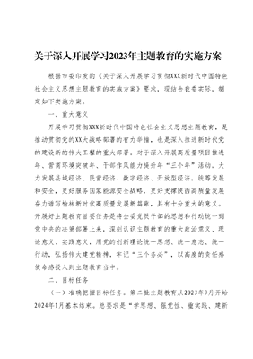 关于深入开展学习2023年主题教育的实施方案根据市委印发的《关于深入开展学习贯彻XXX新时代中国特色社会主义思想主题教育的实施方案》要求,现结合我委实际,制定如下实施方案。一、重大意义开展学习贯彻XXX新时代中国特色社会主义思想主题教育,是推动贯彻党的XX大战略部署的有力举措,也是深入推进新时代党的建设新的伟大工程的重大部署。对于深入开展高质量项目推进年、营商环境突破年、干部作风能力提升年三个年活动,大力发展县域经济、民营经济、数字经济、开放型经济,统筹发展和安全,更好服务国家能源安全战略,更好支撑陕西高质量发展奋力谱写榆林新时代高质量发展新篇章,具有十分重大的意义。开展好主题教育首要任务是将全委党员干部的思想和行动统一到党中央的决策部署上来,深刻认识主题教育的重大政治意义、理论意义、实践意义,用党的创新理论统一思想、统一意志、统一行动,弘扬伟大建党精神,牢记三个务必,以高度的责任感使命感投入到主题教育当中。二、目标任务(一)准确把握目标任务。第二批主题教育从2023年9月开始2024年1月基本结束。总要求是学思想、强党性、重实践、建新功,根本任务是坚持学思用贯通、知信行统一,把XXX新时代中国特色社会主义思想转化为坚定理想、锤炼党性和指导实践、推动工作的强大力量,使全党始终保持统一的思想、坚定的意志、协调的行动、强大的战斗力。要牢牢把握深入学习贯彻XXX新时代中国特色社会主义思想这一主线,突出政治之训、理论之训、实践之训、作风之训,坚持理论学习、调查研究、推动发展、检视整改、建章立制等重点措施有机融合、一体推进。具体达到以下目标。1.凝心铸魂筑牢根本。全面、系统、深入学习XXX新时代中国特色社会主义思想,完整准确掌握这一重要思想的主要内容,全面把握这一重要思想的世界观、方法论和贯穿其中的立场观点方法,深刻理解这一重要思想的道理学理哲理,推动党员、干部真学真懂真信真用,推动学习往深里走、往实里走、往心里走,提高思想觉悟,切实做到筑牢信仰之基、补足精神之钙、把稳思想之舵。2.锤炼品格强化忠诚。深刻领悟两个确立的决定性意义增强忠诚核心、拥戴核心、维护核心、捍卫核心的政治自觉、思想自觉、行动自觉,不断提高政治判断力、政治领悟力、政治执行力,始终忠诚于党、忠诚于人民、忠诚于马克思主义,真心爱党、时刻忧党、坚定护党、全力兴党。3.实干担当促进发展。突出实践导向,真抓实干、务求实效紧紧围绕新时代新征程党的中心任务,胸怀国之大者,牢固树立正确的权力观、政绩观、事业观,增强推动高质量发展本领服务群众本领、防范化解风险本领,敢于斗争、勇于负责,聚焦问题、知难而进,以时时放心不下的责任感、积极担当作为的精气神,不折不扣贯彻落实党中央决策部署和XXXXXX来陕考察重要讲话重要指示,认真落实省委十四届四次全会、市委五届四次和五次全会精神,深入推进三个年活动,谱写榆林高质量发展新篇章。4.践行宗旨为民造福。坚持人民至上,一切为了人民、一切依靠人民,始终同人民同呼吸、共命运、心连心,把为民办实事作为重要内容,以群众满意不满意作为根本评判标准,紧紧抓住人民群众最关心最直接最现实的利益问题,把惠民生、暖民心、顺民意的工作做到群众心坎上,不断增强人民群众的获得感、幸福感、安全感,让现代化建设成果更多更公平惠及全体人民。5.廉洁奉公树立新风。大力弘扬伟大建党精神,牢记三个务必,坚持不懈用延安精神教育广大党员、干部,坚持以党性立身做事,增强纪律意识、规矩意识,践行三严三实,严格落实中央八项规定及其实施细则和省委、市委实施办法,持续纠治四风,把纠治形式主义、官僚主义摆在更加突出位置,坚决反对特权思想和特权现象,做到公正用权、依法用权、为民用权、廉洁用权,推动形成清清爽爽的同志关系、规规矩矩的上下级关系、亲清统一的新型政商关系,当好良好政治生态和社会风气的引领者、营造者、维护者,树立求真务实、团结奋斗的时代新风。(二)全面落实重要要求。在以学铸魂中筑牢根本。做好学习贯彻XXX新时代中国特色社会主义思想的深化、内化、转化工作坚定理想信念、铸牢对党忠诚、站稳人民立场,从思想上正本清源、固本培元,筑牢信仰之基、补足精神之钙、把稳思想之舵。在以学增智中提升能力。坚持从党的创新理论中悟规律、明方向学方法、增智慧,引导党员干部不断提升政治能力、思维能力、实践能力,不断增强推动高质量发展、服务群众和防范化解风险的能力,切实把看家本领、兴党本领、强国本领学到手。在以学正风中解决问题。持续学习领会XXXXXX关于党风廉政建设和反腐败斗争的重要论述,引导党员干部牢记三个务必,坚持目标导向和问题导向相结合、学查改相贯通,对标党风要求找差距,对标党性要求查根源,对照党纪要求明举措,大兴务实之风、弘扬清廉之风、养成俭朴之风。在以学促干中取得实效。教育