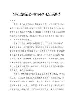 在局主题教育读书班集中学习会上的讲话同志们:今天,我们在这里举办主题教育读书班,动员全局党员集中学习XXX新时代中国特色社会主义思想,是贯彻落实党中央和省、市委决策部署的具体举措,是用XXX新时代中国特色社会主义思想武装头脑的迫切需要,也是提升干部队伍政治能力水平的务实之举,具有十分重要的意义。刚才,XX同志、XX同志分别领学了XXXXXX关于以学增智重要讲话精神、关于XX重要讲话和指示批示精神以及蔡奇同志在学习贯彻XXX新时代中国特色社会主义思想主题教育第一批总结暨第二批部署会议上的讲话要求;XX同志、XX同志也分别围绕以学增智开展了专题研讨,大家讲的都很好,很有针对性、建设性和可操作性,总的来看,今天的读书班达到了预期效果,大家要一如既往地认真借鉴、相互启发,不断提高运用党的创新理论指导实践、推动工作的能力。同志们,XXX新时代中国特色社会主义思想博大精深,学习永无止境,今天的读书班只是局主题教育工作的一个良好开端,希望大家紧扣学思想、强党性、重实践、建新功的总要求,沉下心来读原著、学原文、悟原理,做到持续跟进学、深入思考学联系实际学,确保全局上下理论学习不断进步、理论水平不断提高。下面,我再强调四点意见:一要细照笃行,持续做好内化文章。X月X日,全市召开了主题教育动员会,对全市开展第二批主题教育进行了部署安排,提出了明确要求和目标任务。X日,局党委召开党委理论学习中心组专题学习(扩大)会议,第一时间传达学习市委主题教育大会有关精神,动员部署全局主题教育工作。广大党员干部要坚定理想信念、站稳人民立场、强化责任担当,从理论学习中激发忠诚担当的勇气和锐气,既要明方向、立规矩、正风气,更要挑重担、打头阵、闯险滩,激发全局上下闯、创、干的蓬勃活力。二要真学真信,持续做好深化文章。磨刀不误砍柴工。全体党员干部要迅速对标学习任务,找准学习重点,梳理制定个人学习计划,增强理论学习的实效性。局领导班子成员要将XXXXXX关于主题教育的重要讲话和重要指示批示精神作为必修课,安排时间通读通学;全局党员干部要将《XXX新时代中国特色社会主义思想学习纲要》《XXX新时代中国特色社会主义思想专题摘编》《XXX著作选读》以及XXX对安全生产领域的重要讲话和有关文章作为自修课,结合职责分工,原原本本读原著、逐字逐句悟原理,不断在深入学习中改造思想、廓清迷雾、汲取营养,不断在思考研究中完善思路、破解难题、提升水平。三要知行合一,持续做好转化文章。学习贯彻XXX新时代中国特色社会主义思想,必须记在心上,印在脑中,落在行动上通过此次读书班,我们立足工作实际,结合新形势新任务,提出了许多颇有针对性、建设性的意见建议,还需在领悟和实践中不断去深化认识和把握,尤其是围绕在重大项目、重点企业的服务和监管上做文章,在小散乱污企业的管理、提升和清理上下功夫,把自己摆进去、把职责摆进去、把工作摆进去,真正把读书班精神总结好、运用好、提升好。四是效果导向,持续做好优化文章。要坚持边学边思、边学边用、边学边干,把理论学习同个人的思想作风、工作能力实际链接起来,同解决弱势短板和突出问题结合起来,同调查研究、检视问题、整改落实贯通起来,带着问题学,联系实际想,深入查摆检视,防止散光跑偏。特别是要抓好全市XX建设、加速推进XX更新改造、夯实XX队伍建设等弱势短板,真正把学习成果转化为对推动发展的力量源泉。同志们,主题教育是我们必须完成好的重要政治任务,我们务必要按照党中央和省、市委的决策部署和工作要求,抓实读书班这一难得的学习充电机会,知其然更知其所以然,以如切如磋、如琢如磨的态度,持续推动主题教育内化于心、外化于行不断提升政治能力、思维能力、实践能力,找到攻克难点堵点、解决矛盾问题、防范化解重大风险、推动事业高质量发展的答案力求学有所获、学有所得、学有所成,确保读书班收到实效。