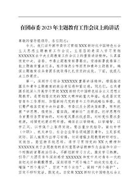 在团市委2023年主题教育工作会议上的讲话尊敬的督导组领导、各位同志:今天,我们召开团市委学习贯彻XXX新时代中国特色社会主义思想主题教育工作会议,主要目的是深入学习贯彻XXXXXX在中央主题教育工作会议上的重要讲话精神,认真落实党中央、省委、市委主题教育部署要求,安排部署我委第二批主题教育重点任务,有序推进全市团员和青年主题教育,确保主题教育在共青团系统取得扎扎实实的成效。下面,我提几点工作要求。第一,深刻学习领会XXXXXX重要讲话精神,增强推进团员和青年主题教育的政治责任感和紧迫感。同志们,在共青团系统深入开展学习贯彻XXX新时代中国特色社会主义思想主题教育,是贯彻落实党的XX大精神的重大举措,也是落实党管青年工作原则、加强新时代党的青年工作的战略性举措。我们要严格落实党中央和省委、市委以及全团决策部署,牢牢把握学思想、强党性、重实践、建新功总要求,把学思想作为首要任务贯穿始终,对标党风要求找差距,对标党性要求查根源,对照党纪要求明举措,确保在以学铸魂、以学增智、以学正风、以学促干上取得实效。要注重分类指导,面向中学(中职)、机关单位、社会企业等各领域团员青年,立足客观实际、因人施策作出学习安排,切实增强主题教育的针对性、实效性。要坚持系统思维,将学习贯彻党的XX大精神和XXXXXX关于主题教育的系列重要讲话精神作为当前和今后一个时期的首要政治任务,不断创新学习方式,激发学习热潮,引导广大团员青年深刻感受XXXXXX和党中央对青年一代的亲切关怀和殷殷厚望,深刻领悟两个确立的决定性意义,增强四个意识、坚定四个自信、做到两个维护,坚定不移听党话、跟党走,自觉做XXX新时代中国特色社会主义思想的坚定信仰者、积极传播者、忠实实践者。第二,始终坚持围绕中心、服务大局的工作主线,增强推进团员和青年主题教育的精准性和实效性。面向全市团员青年开展主题教育,目的就是更好地培养社会主义建设者和接班人、源源不断为党输送健康有活力的新鲜血液,充分激发新时代青年在谱写全面建设社会主义现代化国家新篇章中挺膺担当、建功立业,让青年智慧和力量在高质量发展中熠熠生辉。一是发动青年投身经济发展。大力实施新时代青年岗位建功行动,引导青年在共青团队、号、手、岗、赛等品牌工作中创先争优,在推动经济实现质的有效提升和量的合理增长中发挥作用,为我市实现总目标作出青春贡献。二是带动青年投身乡村振兴。深入推进乡村振兴青春建功行动,引入、培育、留住一批爱农兴农青年,积极参与农业农村现代化,积极参与推动产业振兴、人才振兴、文化振兴、生态振兴、组织振兴,汇聚起加快建设美丽乡村的青春力量。三是鼓励青年投身社会服务。以青年品牌为统领,积极开展青年志愿者行动,大力弘扬奉献、友爱、互助、进步的志愿精神,引导青年融入共同缔造青年助力行动,在社会治理现代化建设中积极作为,在急难险重任务中闻令而动、冲锋在前。第三,科学把握推进工作的方式方法,增强推进团员和青年主题教育的政治性和严肃性。按照上级安排,团员和青年主题教育面向全体共青团员和14-35岁的青年开展,在2023年9月至2024年1月集中进行,此后转入常态化、长效化学习教育,在此期间的工作,应注意以下四点:组织领导上,要坚持党建带团建,把坚持党的领导贯穿团员和青年主题教育全过程,以工作专班形式开展工作,不制发共青团系统工作方案,只结合本领域重点工作任务实化细化具化工作任务清单。工作方式上,坚持一切从实际出发,抓好规定动作,不搞不必要的形式创新,不随意增加自选动作,不对团员和青年写读书笔记、心得体会等作出硬性规定,不得提出打卡截图等留痕要求,坚决防止形式化、套路化、表面化,坚决防止低级红高级黑。宣传报道上,要严格落实宣传纪律,按照市委要求,未经同意,一律不刊发主题教育相关信息;工作简报要报统筹编发,不得自行编发。工作纪律上,不得照搬照抄,应结合实际,分层分类推进团员和青年主题教育工作,不搞一刀切,不层层加码、提过高要求;不得泛化内容,要防止把开展日常工作、履行正常职责都当成主题教育;不得借机营销,不借主题教育搞不当营商活动,党员干部不得参加以营利为目的的商业化培训等等。我就讲这些,谢谢!