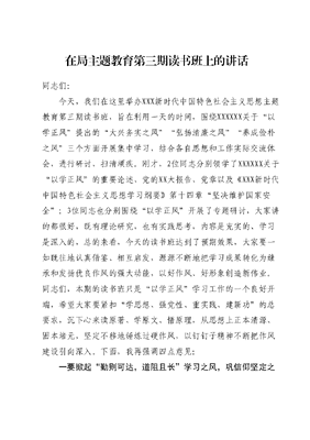 在局主题教育第三期读书班上的讲话同志们:今天,我们在这里举办XXX新时代中国特色社会主义思想主题教育第三期读书班,旨在利用一天的时间,围绕XXXXXX关于以学正风提出的大兴务实之风弘扬清廉之风养成俭朴之风三个方面开展集中学习,结合各自思想和工作实际交流体会,进行研讨,扫清顽疾。刚才,2位同志分别领学了XXXXXX关于以学正风的重要论述、党的XX大报告、党章以及《XXX新时代中国特色社会主义思想学习纲要》第十四章坚决维护国家安全;3位同志也分别围绕以学正风开展了专题研讨,大家讲的都很好,既有理论研究,也有实践思考,内容是充实的、学习是深入的,总的来看,今天的读书班达到了预期效果,大家要一如既往地认真借鉴、相互启发,源源不断地把学习成果转化为继承和发扬优良作风的强大动能,以好作风、好形象创造新伟业。同志们,本期的读书班只是以学正风学习工作的一个良好开端,希望大家要紧扣学思想、强党性、重实践、建新功的总要求,沉下心来读原著、学原文、悟原理,从思想上正本清源、固本培元,坚定不移地锤炼过硬作风,以钉钉子精神不断把作风建设引向深入。下面,我再强调四点意见:一要掀起勤则可达,道阻且长学习之风,巩信仰坚定之攻坚勇气。党的作风是党的形象,是观察党群干群关系、人心向背的晴雨表。XXXXXX强调,我们的干部要上进,我们的党要上进,我们的国家要上进,我们的民族要上进,就必须大兴学习之风,坚持做到学思用贯通、知信行统一。以学正风,就是要教育引导广大党员干部认真学习XXXXXX关于党章的一系列重要论述,做到经常对照党章规范自己的言行。作为一名党员干部,我们要做到克服精神懈怠,纾解本领恐慌等问题,途径唯有不断学习、深化学习、改造学习。新的时代征程上,要注重加强政治学习,把学习贯彻XXX新时代中国特色社会主义思想不断引向深入,从中获取不懈奋斗的源泉动力、增强学思践悟的政治智慧、筑牢拒腐防变的堤坝防线,进一步优化个人素质、增强斗争本领,确保在任何情况下都能坚定的做到政治信仰不变、政治立场不移、政治方向不偏。二要大兴不驰空想,不骛虚声务实之风,汲干事创业之昂扬锐气。执政之道在于安民,安民之道在于察其疾苦。新形势下存在众多无迹可寻的新情况和新挑战,需要广大干部抓实抓牢调查研究这个传家宝,做好精准、闭环、高质量调研,摸准人民群众聊的家长里短,找清人民群众想的急难愁盼,答好人民群众出的新题目。新征程赋予新使命,新使命呼唤新作为。党的XX大报告从党和国家事业发展战略全局出发,对推进国家发改委作出了战略部署,为推进我市改革发展指明了前进的方向,提供了根本的遵循。我们要全面聚焦项目审批、服务业发展、项目建设领域最突出最迫切的现实问题,围绕前期已确定的20个课题开展深入调研,真抓实干、务求实效,切实把调研成果转化为解决问题、改进工作的实际举措,以时时放心不下的责任感、积极担当作为的精气神,为党和人民履好职、尽好责,以新气象新作为推动高质量发展取得新成效。三要弘扬一身正气,两袖清风清廉之风,携清正廉洁之无私底气。廉者,政之本也。党风问题关系党的生死存亡,反腐败是最彻底的自我革命。为政清廉民信之,秉公用权得人心,倘若贪墨分毫,没有树立正确权力观,人民的立场就站不稳当。大家可以看到,新时代十年是党的历史上制度成果最丰硕、制度笼子最严密、制度执行最严格的时期,各项纪律规矩真正成为带电的高压线。作为一名党员干部特别是领导干部,我们要对标党风要求找差距、对表党性要求查根源、对照党纪要求明举措,紧密结合新形势新任务新职责,把学、查、改有机贯通起来,全面查找自身不足和工作偏差,守住政治关、权力关、交往关、生活关、亲情关,勤掸思想尘、多思贪欲害、常破心中贼,时刻警惕来自各方面的围猎,防止落入别人设置的陷阱,做一个一心为公、一身正气、一尘不染的共产党人。四要养成克勤于邦,克俭于家俭朴之风,秉艰苦奋斗之青衿志气。足国之道,节用裕民,而善臧其余。俭朴,始终是居安思危、赓续艰苦奋斗精神的外在表现与着力点。吃苦在前,享受在后是党章规定的党员义务,尚俭戒奢是《中国共产党廉洁自律准则》提出的明确要求。在主题教育中抓实以学正风、养成俭朴之风,必须坚持目标导向和问题导向相结合、学查改相贯通,把生活作风问题作为检视整改的重要内容,对作风之弊、行为之垢来一次大排查、大检修、大扫除,切实解决人民群众反映强烈的突出问题。作为一名党员干部,要坚持以检身若不及的自觉要求自己、反思自己,主动查找是否存在生活奢靡、贪图享乐、追求低级趣味等问题,形成克己奉公、戒奢尚俭、激浊扬清的理性自觉,确保在生活作风上清正廉洁、一身正气。以学正风,贵在坚持不懈,成于久久为功。让我们把思想和行动统一到XXX