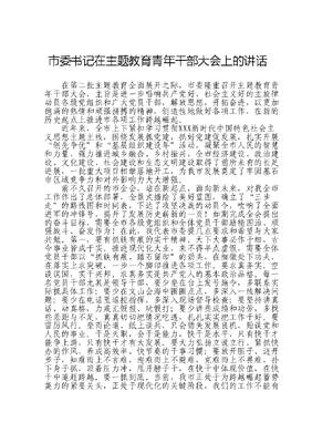 市委书记在主题教育青年干部大会上的讲话在第二批主题教育全面展开之际,市委隆重召开主题教育青年干部大会,主旨是进一步唱响共产党好、社会主义好的主旋律动员各级党组织和广大党员干部,解放思想,开拓奋进,以更加饱满的热情和顽强拼搏的精神,创造性地做好各项工作,在新的历史起点上推进市各项工作跨越崛起。近年来,全市上下紧扣学习贯彻XXX新时代中国特色社会主义思想主题主线,围绕发展抓党建,抓好党建促发展,扎实开展创先争优和基层组织建设年活动,凝聚全市人民的智慧和力量,强力推进城乡融合、乡村振兴,全市经济建设、政治建设、文化建设、社会建设和生态文明建设取得了前所未有的长足进展,一批重大项目相继落地开工,为我市发展奠定了牢固基石市区域竞争力和对外影响力大大增强。前不久召开的市全会,站在新起点,面向新未来,对我全市工作作出了总体部署,全景式描绘了美好蓝图,确立了三步走的路线图和时间表,下达了攻坚决战的动员令,吹响了全面进军的冲锋号,揭开了发展历史崭新的一页!如期完成全会提出的奋斗目标,需要全市各级党组织和全体党员干部励精图治、顽强战斗、奋发作为!在此,我代表市委提几点要求和希望与大家共勉。第一,要有抓铁有痕的实干精神。天下大事必作于细,古今事业皆成于实。推进现代化大业,来不得半点虚假,需要全体党员干部以抓铁有痕、踏石留印的劲头,在细微处下功夫,在落实上求突破,一步一个脚印推进各项工作。要求真务实。空谈误国,实干兴邦。求真务实是共产党人的基本政治品格。每一名党员干部尤其是领导干部,要少坐在台上发号施令,多联系实际抓具体工作;要少在文山会海中圈圈点点,多深入一线解决问题;要少在电话里遥控指挥,多深入现场督导检查;要坚持讲真话、动真格,力戒汇假报、玩假打;要少讲些成绩和功劳,多找些差距与不足,真真切切把情况吃透,扎扎实实把工作干好。要雷厉风行。坐而论道、纸上谈兵,只会错失发展良机,贻误党和人民的事业。干是天职,会干是能力,快干是水平,只有快干才能争上游,只有快干才有大发展。要大力弘扬立说立行、紧抓快办的作风,养成高效率、快节奏的干事习惯;要放开胆子、迈开步子,知难而上不言难,迎难而上不避难,克难而上不畏难,扑下身子抓,顶着压力冲,甩开膀子干,在快干中体现价值,在快干中追赶跨越。要一抓到底。当前,我市正处于为跨越崛起蓄势集力的紧要关头,正处于现代化的关键阶段,我们的工作不能有半点闪火。要俯下身、沉住气、向前看,对集体议定的事情不当品头论足的说客、冷眼旁观的站客,始终保持政令畅通、一杆到底;对正在做的事情,决不能瞻前顾后、裹足不前决不能虎头蛇尾、半途而废,必须善始善终、一抓到底,不达目的不罢休,确保真正见到实效。第二,要有过关斩将的拼搏精神。在市全面发展的新征程中我们必定会面临更多的矛盾和困难、承受更大的压力和挑战、付出更多的艰辛和汗水。全体党员干部必须保持昂扬的斗志,背水一战,砥砺前行,才能不断开创新局面、跃上新台阶。要有永不服输的拼劲。雄关漫道真如铁。我们还有很多的关口未攻破还有很多的困难未征服,要视落后为耻辱,勇担奋起直追的责任始终保持蓬勃向上、开拓进取的豪情锐气;要视困难为考验,增强敢于亮剑的勇气,敢出新招,善用奇兵;要视挑战为机遇点燃创业激情,迸发创新灵感,在应对挑战中实现跨越提升。要有不惧艰险的闯劲。无限风光在险峰。凡事因循守旧、中规中矩畏首畏尾,不敢想、不敢试、不敢闯,工作没有新进展,创业没有新路子,发展没有新局面,我们就会沦为守摊混饭的平庸之辈,永远看不到山巅的风光。要实现弯道超车、跨越崛起,树好我市的全新形象,必须坚持闯字当头,不怕冒险,不怕吃苦,不怕担责,用新理念深化认知,用新视野捕捉机遇,用新思维推进发展,奋力闯出一片新天地。要有锲而不舍的韧劲。事业永无止境,发展鲜有坦途。做学问打破沙锅问到底方能获取真知,干事业咬定青山不放松方能赢得成功,我市发展已经有了良好的开端,我们必须本着对人民负责、对事业负责、对历史负责,冲破重重阻力,承受超常压力,始终坚持不动摇、不懈怠、不折腾,不断积蓄和扩大发展优势,加快实现从原地起立迈向发展起跳。第三,要有与时俱进的创新精神。世界眼光、战略思维和创新精神,是共产党员和领导干部必备的现代素质。创新精神是时代意识的反映,是人类最具活力的行为,也是优秀领导者的显著标志。观念要有现代性。有时髦的穿着打扮不代表有先进的思想观念;思想观念的落后是我们最大的落后。各级党员干部必须把解放思想作为一场硬仗来打,自觉把思想认识从那些不合时宜的观念、做法和体制中解放出来,从对科学发展理论的教条式理解中解放出来,从主观主义和形而上学的桎梏中解放出来,使我们的头脑富有现代思维、手艺富有现代特质、作品富有现代气派。方法要有科学性。思路决定出路,方法决定绩效。面对新时代新要