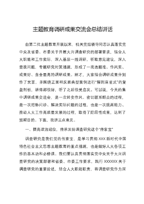 主题教育调研成果交流会总结讲话自第二批主题教育开展以来,机关党组领导同志认真落实党中央及省委、市委关于开展大兴调查研究的部署要求,结合人大职能和工作实际,深入基层一线调研,听取意见建议,深入查找问题,专题研究对策措施,形成了一批选题准、作风实、成果好、含金量高的调研成果。刚才,大家结合调研成果分别作了发言,并围绕正面和反面典型案例进行解剖麻雀式的复盘剖析,讲得都很好,听了之后很受启发。可以说,今天的集中调研成果交流会,是一次转变作风、密切联系群众的过程,是一次把脉问诊、解决实际问题的过程,也是一次提高能力、推动人大工作高质量发展的过程,取得了阶段性成果,达到了预期目的。下面,我讲三点意见。一、提高政治站位,传承发扬调查研究这个传家宝调查研究是我们党的传家宝,是学习贯彻XXX新时代中国特色社会主义思想主题教育的重点措施,也是做好人大各项工作的基本功和必修课。我们要认真贯彻落实党中央关于大兴调查研究的决策部署和省委、市委工作要求,践行XXXXXX关于调查研究的重要论述,结合人大职能职责,将调查研究作为深入开展主题教育的先手棋,努力在做深做实做细上下功夫。一要深入基层找准问题。班子成员要以身作则,坚持以XXX新时代中国特色社会主义思想为指导,把握好这一重要思想的世界观和方法论,坚持好、运用好贯穿其中的立场观点方法,把六个必须的科学方法贯彻体现到调查研究中,结合人大立法、监督、代表等工作,深入基层、深入群众,问所盼所需、问突出问题、问解题良方,切实摸基层实情,努力破解实际难题。二要问题导向提升实效。问题导向是调查研究的基础导向,抓准了问题,人大调研才不会挂空挡。要坚持问题导向,围绕市人大常委会全年工作一要点三计划,统筹运用多种调研方法,开展立法、监督、代表等工作调研,做好典型案例解剖式调研,解决人大工作遇到的难点堵点问题,使调查研究的过程成为向人民群众学习、增进同人民群众感情的过程。三要求真务实改变作风。严格执行中央八项规定及其实施细则精神,轻车简从,不搞扎堆调研,不搞层层陪同,不给基层增加负担。调查过程中,坚持实事求是的工作作风,力戒形式主义,不为调研而调研,用好蹲点调研解剖麻雀等方法,切实做到真发现问题,发现真问题。坚持求真务实,灵活运用四不两直调研、解剖麻雀式调研、蹲点调研等方式到基层听实话、摸实情。二、深化成果转化,切实做好调查研究后半篇文章文以载道,以用为贵。调查研究的目的重在运用,关键在解决问题。我们要以解决问题为根本目的,强化成果运用,扎实做好调查研究后半篇文章,努力形成更多解难题、破瓶颈、闯新路的真招实招硬招,让调研成果真正从纸上落到地上,成为推动人大工作高质量发展的重要支撑。一要坚持以调研促学习。把调查研究作为理论武装、学用结合的有力武器,从思想上正本清源、固本培元,不断提高政治判断力、政治领悟力、政治执行力,深刻领悟两个确立的决定性意义,增强四个意识、坚定四个自信、做到两个维护,始终在思想上政治上行动上同党中央保持高度一致。要自觉运用党的创新理论指导调查研究,运用贯穿其中的立场观点方法来研究问题、总结经验、探索规律,推动XXX新时代中国特色社会主义思想在人大落地生根。二要坚持以调研促实干。健全完善人大机关调研机制,进一步提升人大调查研究工作的规范化水平,以高质量的调查研究促进提升立法质量,增强监督刚性和实效,提高决定、决议的针对性、有效性,更好服务保障人大常委会履职行权。要把调查研究作为转变工作作风、密切联系代表群众的重要途径,统筹运用多种调研方法,做好典型案例解剖式调研,切实解决好人大工作中遇到的难点堵点问题,使调查研究的过程成为向人民群众学习、增进同人民群众感情的过程。三要坚持以调研促发展。把调查研究作为解决难题、改进工作的实际举措,对调研中发现的问题短板、提出的对策建议加强梳理分析,实行清单化管理,督促整改落实,使调查研究融入到立法、监督、代表和自身建设各项工作之中,为推进人大工作高质量发展提供切实有效的硬招实招,切实把调研成果转化为解决问题、促进发展的实际行动,为推动跨越式、高质量发展中贡献人大智慧和力量。三、加强以案促改,推动正反典型案例剖析走深走实正反案例剖析是主题教育的规定动作。从之前报送案例的情况来看,个别工委的重视程度还不够,检视剖析、查找差距不够深入具体,报送案例的数量未能达到要求。接下来,要以严的标准、严的要求、严的作风开展好正反案例剖析,注重正面典型引导和反面典型警示,巩固深化典型案例检视剖析的机制措施,以正反案例剖析成效带动人大工作全面提升。一要加强以案促改。将案例剖析与管党治党责任相结合,以案为鉴,深刻剖析、举一反三,自觉把自己摆进去、把职责摆进去、把工作摆进去,深刻交流认识体会,总结经验教训,检视存在问