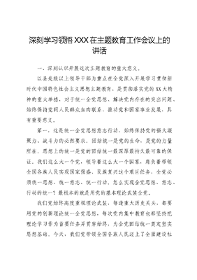 深刻学习领悟XXX在主题教育工作会议上的讲话一、深刻认识开展这次主题教育的重大意义。以县处级以上领导干部为重点在全党深入开展学习贯彻新时代中国特色社会主义思想主题教育,是贯彻落实党的XX大精神的重大举措,对于统一全党思想、解决党内存在的突出问题、始终保持党同人民群众血肉联系、推动党和国家事业发展,具有重要意义。第一,这是统一全党思想意志行动、始终保持党的强大凝聚力、战斗力的必然要求。团结统一是党的生命,是党的力量所在。思想上的统一是党的团结统一最深厚最持久最可靠的保证。我们这么大一个党,领导着这么大一个国家,肩负着带领全国各族人民实现国家强盛、民族复兴这个艰巨任务,全党必须统一思想、统一意志、统一行动。怎么实现全党思想、意志、行动的统一?最根本的就是用党的基本理论武装全党。我们党始终高度重视理论武装,每逢重大历史关头,都要用党的创新理论统一全党思想,每次党内集中教育也都坚持把理论学习作为首要任务并贯穿始终,为全党团结统一奠定坚实思想基础。今天,我们党带领全国各族人民迈上了全面建设社会主义现代化国家、全面推进中华民族伟大复兴的新征程,要更好肩负起新时代新征程党的使命任务,迫切需要用新时代中国特色社会主义思想武装头脑、指导实践、推动工作。党的十八大以来,伴随着新时代中国特色社会主义思想在实践中形成发展的历程,我们持续推动用党的创新理论武装全党,取得了明显成效。但是,理论武装的任务仍然艰巨。一方面,在真学真信真用、学懂弄通做实方面,还存在一些需要引起重视的问题。有的党员、干部理论学习兴趣不浓,学不进去,学习走形式装样子;有的学习不系统不深入,一知半解、浅尝辄止,知其然不知其所以然;有的学用脱节,学归学做归做,不善于把学习成果转化为干事创业的实际本领,等等。这些问题表明,党的理论武装工作不能搞形式,必须持续往深里走、往实里走。另一方面,党的创新理论在不断发展,党的XX大提出了一系列重大思想、重大观点,党的XX大以来在阐述党的XX大精神过程中又提出了一些新观点,特别是提出并系统阐述了中国式现代化这个重大理论和实践问题,进一步丰富了新时代中国特色社会主义思想。这方面的学习贯彻才刚刚开始。因此,在新征程开局起步之际,必须继续推动全党深入学习贯彻新时代中国特色社会主义思想。历史和现实表明,理论学习不深入不彻底,思想统一就没有基础,党的团结统一就会受到严重影响。这次主题教育,要在推动学习贯彻新时代中国特色社会主义思想走深走实上下功夫,教育引导党员、干部从思想上正本清源、固本培元,不断提高政治判断力、政治领悟力、政治执行力,增强四个意识、坚定四个自信、做到两个维护,始终在思想上政治上行动上同党中央保持高度一致,做到心往一处想、劲往一处使,共同把党锻造成一块攻无不克、战无不胜的坚硬钢铁。第二,这是推动全党积极担当作为、不断开创事业发展新局面的必然要求。全面建成社会主义现代化强国、实现第二个百年奋斗目标,以中国式现代化全面推进中华民族伟大复兴,是全党全国各族人民在新时代新征程的中心任务。这是前无古人的开创性事业,前进道路上,必然会遇到大量从未出现过的全新课题、遭遇各种艰难险阻、经受许多风高浪急甚至惊涛骇浪的重大考验。唯有始终保持锐意进取、敢为人先、迎难而上的奋斗姿态,积极担当作为、敢于善于斗争,才能胜利推进强国建设、民族复兴的历史伟业。我们党百年奋斗的伟大成就都是党团结带领全国各族人民拼出来、干出来的,要把党的XX大描绘的宏伟蓝图变成现实,仍然要靠拼、要靠干。总体来看,现在广大党员、干部的能力素质和精神状态是好的,但也要清醒看到,干部队伍中不愿担当、不敢担当、不善担当的问题还比较突出。有的为了不出事宁愿不干事,得过且过;有的碰到矛盾和难题绕道走,把自身责任往外推,不敢动真碰硬;有的光说不练,表态快、调门高,行动慢、落实差;有的德不配位、能力平庸,挑不起重担,打不开工作局面;有的瞻前顾后、畏首畏尾,在重大风险挑战面前底气不足、惊慌失措,等等。这些问题尽管存在于少数党员、干部身上,但任其发展,就会损害党的形象、贻误党的事业,必须认真加以解决。这次主题教育,要教育引导广大党员、干部学思想、见行动,树立正确的权力观、政绩观、事业观,增强责任感和使命感,不断提高推动高质量发展本领、服务群众本领、防范化解风险本领,加强斗争精神和斗争本领养成,提振锐意进取、担当有为的精气神。要采取有效措施,着力消除影响干部担当作为的各种消极因素,敢于为担当者担当、为负责者负责、为干事者撑腰,让愿担当、敢担当、善担当蔚然成风,推动广大党员、干部以满腔热忱奋进新征程、建功新时代。第三,这是深入推进全面从严治党、以党的自我革命引领社会革命的必然要求。治国必先治党,党兴才能国强。全面从严治党永远在路上,党的自我革命永远在路上,解决大党独有难题是一个长期而艰巨的过程,既需要常抓