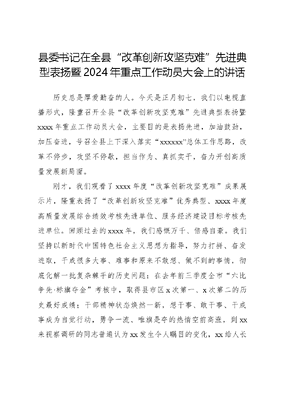 县委书记在全县改革创新攻坚克难先进典型表扬暨2024年重点工作动员大会上的讲话历史总是厚爱勤奋的人。今天是正月初七,我们以电视直播形式,隆重召开全县改革创新攻坚克难先进典型表扬暨xxxx年重点工作动员大会,主要目的是表扬先进,加油鼓劲,加压奋进,号召全县上下深入落实xxxxxx总体工作思路,改革不停步,攻坚不停歇,担当作为、真抓实干,奋力开创高质量发展新局面。刚才,我们观看了xxxx年度改革创新攻坚克难成果展示片,隆重表扬了改革创新攻坚克难优秀典型、xxxx年度高质量发展综合绩效考核先进单位、服务经济建设目标考核先进单位。回顾过去的xxxx年,我们感慨万千、倍感自豪。我们坚持以新时代中国特色社会主义思想为指导,努力打拼、奋发进取,干成很多大事、难事和原来不敢想、做不到的事情,彻底化解一批复杂棘手的历史问题;在去年前三季度全市六比争先·标旗夺金考核中,取得县市区x次第一、x次第二的历史最好成绩;干部精神状态焕然一新,想干事、敢干事、干成事成为自觉行动,勇争一流、唯旗是夺的热情空前高涨,到xx来视察调研的同志普遍认为xx发生令人瞩目的变化,xx给人长期落后的印象也一去不复返,xx的干部群众从来没有像今天这样自信豪迈。刚才发言的xx位同志,是各个方面、各条战线的优秀代表。他们敢抓敢管,真抓实干,带领镇街园区守牢底线、加快发展;他们以对xx人民负责、对历史负责的精神,千方百计争取政策、项目和荣誉;他们有担当、敢攻坚,成功化解一个又一个历史问题;他们拼上豁上,昼夜奋战,圆满完成县委、县政府交办的急难险重任务;他们攻坚一线、勤勉敬业,在平凡的岗位作出骄人业绩。在他们身上,集中展现了坚毅、敢当、实干、创新的新时代xx精神。刚才的成果展示片中,一行字、一个镜头、一项荣誉、一项政策背后,有多少人做出艰苦细致的努力,有多少人付出泪水汗水?我们需要更多的xx、xx,需要更多的马宁、李琳,需要更多的xx,需要更多的xx,需要更多的xx这样的同志,他们是xx发展的脊梁,应该为他们点赞。全县还有很多像他们一样的奉献者,在过去的一年里攻城拔寨、挥洒汗水,我们的鲜花、掌声、荣誉,还应该献给每一位为xx发展默默奉献的劳动者。xx的每一点变化、每一份成绩,都是靠大家拼出来的,每个人都很了不起,每个人都是不平凡的英雄!在此,我代表县委、县政府,向受到表扬的先进单位、优秀代表和杰出企业家,表示热烈的祝贺!向广大干部群众的辛苦付出,表示诚挚的感谢!历史青睐奋进者。今年是实现十四五规划的关键之年也是实现县第十五次党代会目标的攻坚之年。全县上下要按照xxxxxx总体工作思路,毫不动摇坚持四个第一,认真落实六个更加注重要求,高举改革创新大旗,再燃攻坚克难激情,吹响拼搏奋进号角,为xx的荣誉而干,为xx的未来而干,为xx老百姓的福祉而干,努力创造无愧于历史、无愧于人民的新业绩。下面,对新一年全县的工作,我讲四个方面的意见。第一、我们要以更大力度解放思想思想是行动的先导,思想一变天地宽。实现后发赶超、跨越发展,必须打开眼界、敢为人先、敢闯敢试,在解放思想中统一思想,在统一思想中加快发展。一要对标先进激发斗志。县域竞争的差距在于思想和眼界如果思想停留在过去时,就会落后于时代。刚才有的同志在发言中讲今天和昨天,不是今天和昨天之间的比较,而是一个时代和另一个时代的比较,就是数字化时代。大家要睁开眼看世界,积极走出去,向先进看齐,跟上时代步伐。要有拿来主义的气魄,把先进地区的发展经验、成熟做法,学以致用,为我所用。比如,浙江是数字化改革起始地,我们要全面系统学习,凡是能用数字技术解决问题的,都要进行数字化转型。还有浙江创造的千村示范、万村整治工程等经验,这些被实践反复证明的成功经验,就要坚持拿来主义,别人怎么干的,我们要结合xx实际大力度地干。解放思想不仅仅是哪一个人、哪一个部门单位的事,不仅领导干部要解放思想,而且要带动下级和基层每一名干部解放思想;不仅党员干部要解放思想,而且要带动企业家、创业者和人民群众解放思想,真正让解放思想体现到xx的每个角落。我们是儒家传统文化核心区域,有厚德载物、自强不息的优良传统,但是在新时代日趋激烈的县域竞争中,要想彻底摆脱贫穷落后的面貌,必须大力度解放思想。近期,要分批分领域组织大规模外出学习,以思想大解放引领观念大变革、工作大提升。同时,我们鼓励各个单位经常性组织外出学习,也鼓励同志们走出国门,到先进国家学习考察。二要大刀阔斧改革创新。把解放思想的落脚点放在解决实际问题上,敢想敢试,敢于破圈,海阔天空地想,脚踏实地地干。要围绕群众急难愁盼大胆改,我们从xxxx年开始,在全省率先实行大病商业补充医疗保险制度,每年xxx多名大病患者直接受益。群众的需求就是改革的切入点,要积极推进分级诊