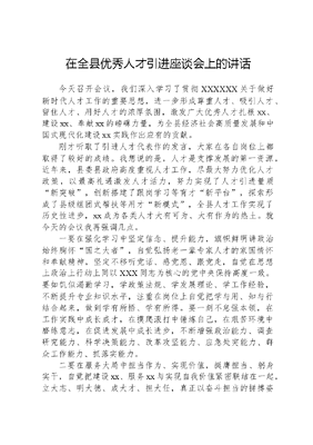 在全县优秀人才引进座谈会上的讲话今天召开会议,我们深入学习了贯彻XXXXXX关于做好新时代人才工作的重要思想,进一步形成尊重人才、吸引人才、留住人才、用好人才的浓厚氛围,激发广大优秀人才扎根xx、建设xx、奉献xx的磅礴力量,为全县经济社会高质量发展和中国式现代化建设xx实践作出应有的贡献。刚才听取了引进人才代表作的发言,大家在各自岗位上都取得了较好的成绩。我想说的是,人才是支撑发展的第一资源,近年来,县委县政府高度重视人才工作,尽最大努力优化人才政策,以最高礼遇激发人才活力,努力实现了人才引进量质新突破,创新搭建了跟岗学习等育才新平台,探索形成了县级组团式帮扶等用才新模式,全县人才工作实现了历史性进步,xx成为各类人才大有可为、大有作为的热土。就今天的会议我再强调几点。一要在强化学习中坚定信念、提升能力,旗帜鲜明讲政治始终胸怀国之大者,自觉弘扬老一辈专家人才的家国情怀和奉献精神,坚定不移听党话、感党恩、跟党走,自觉在思想上政治上行动上同以XXX同志为核心的党中央保持高度一致。要如饥似渴勤学习,学政策法规、学发展理论、学工作经验,不断提升专业知识水平,注重在岗位上自觉把学与用、知与行结合起来,做到学有所悟、学有所得。要一刻不怠强本领,在工作实践中成长成才,在摸爬滚打中锤炼自己,在艰苦环境中磨练意志,在促进发展中成长进步,不断增强政治能力、调查研究能力、科学决策能力、改革攻坚能力、应急处突能力、群众工作能力、抓落实能力。二要在服务大局中担当作为、实现价值,挺膺担当、躬身实干,自觉把建设xx、服务xx与实现自我价值紧密联结在一起,立大志、明大德、成大才、担大任,真正以奋斗担当的拼搏姿态赢得青春精彩。要敢于创新、勇于争先,紧紧围绕事业发展需要,发挥优势专长,调动智慧才华,面对矛盾问题敢于迎难而上、攻坚克难,面对技术难题善于创新创造、献计献策,面对急难险重任务勇于站出来、顶上去。要心存敬畏、守好底线,把纪律和规矩挺在前面,自觉扣好人生的第一粒扣子,慎独慎初慎微慎欲,养成积极健康的生活情趣,切实做到心不动于微利之诱,目不眩于五色之惑。三要在用心用情中强化保障、优化环境,坚持党管人才原则,进一步增强做好新时代人才工作的责任感、使命感和紧迫感,通过按需引才、平台聚才、政策留才、激励奖才,把人才服务延伸到最后一米。要提升人才的归属感,把人才优先发展战略体现和落实到工作全过程,严格落实领导干部联系服务专家人才制度,俯下身子和专家人才交朋友,深入了解他们的所思所想,切实为他们排忧解难。要提升人才的成就感,把搭建事业平台作为稳定人才、留住人才、用好人才的关键来抓,从注重管理向注重价值实现转变,从注重单向用才向注重多元培养转变,从统揽统管人才向服务成就人才转变,全力打造有利于各类人才创新创业、施展才华的平台。要提升人才的幸福感,加大对引进人才、培育培养人才、服务激励人才等方面的专项保障,用心用情做好引进人才后续服务,为各类人才营造更为舒心舒适、安全稳定的服务和生活环境,让尊重劳动、尊重知识、尊重人才、尊重创造在全社会蔚然成风。四要始终坚定建功xx的信心决心,带着蓬勃朝气和昂扬锐气,保持不懈奋斗的激情活力,把个人奋斗、价值追求融入到xx广阔的现代化建设事业中去。要不断提升人才服务发展效能,突出六个聚焦、实施六大行动,围绕生态环境保护、法治xx建设、医疗卫生服务等方面积极担当作为,不断提高人才服务高质量发展的贡献度。要持续构建人才发展良好环境,不断提高人才薪酬待遇,构建人才服务闭环,积极主动解决好周转住宿、编制保障、职称评定等关键小事,努力营造优待人才、求贤若渴的社会环境,公正平等、竞争择优的制度环境,鼓励创新、宽容失败的工作环境,待遇从优、保障有力的生活环境,确保高层次急需紧缺人才引得进、用得好、留得下。