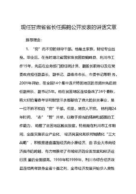 现任甘肃省省长任振鹤公开发表的讲话文章推荐理由:1.穷而不穷的领导干部。他是土家族,财经专业出身。毕业后,在当时湖北省国家级贫困县鹤峰县、利川市工作19年,先后在业务部门担任统计员、副股长职务以及在党委政府担任副县长、副书记、县级市市长、市委书记等职 务。2001年开始,在全国14个集中连片特困地区的恩施州先后担任副州长、副书记5年。他在贫困地区连续奋战了24个春秋,将大好的青春年华和智慧汗水都献给了伟大的扶贫事业,是一位不折不扣的穷干部。但是,地穷人不穷。 他利用24年时间,志智并举,以敢于担当的精神和超强的工作能力, 助推了贫困地区脱贫致富。特别是在利川市工作期间,全面实施农业产业化、 经济民营化和农村城镇化三大战略,积极推进由温饱经济向小康经济、由 农业大市向经济强市的跨越,有力地推动了市域经济的全面发展和经济运行质 量的全面提高。1998年和1999年,利川市综合经济效益连续两年跻身全省十强之列,全市经济发展开始步入良性运行的轨道。他对穷的生活和历练感触 很深,升任副省长后,他还多次回到恩施各县市考察调研,指导脱贫工作。2.土而不土的领导干部。土是指他作风务实深入,非常接地气 。他乐于开展调查研究,善于通过调研发现问题、分析问题、验证问题、解决问题,他的调研报告站位高、考量全、思考深、文风实,为推进实际工作开展提 供了有力的实践支撑。据收集整理,这些年来,他公开发表的调研报 告就有四篇之多,在领导干部中极为罕见。他推进工作的方法很土,但工 作理念绝对不土。现在比较热门的二次创业、一村一品等新鲜词汇,在2000年,他就已经提出并推广实施。同时,他的文章不土。自古荆楚多才俊, 他虽然不是文科专业,也没有一线文字工作经历,但从他的讲话文章来看,他 对国学经典和诗词曲赋有一定的积淀和研究,经常引经据典、信手拈来。他对 文字材料的要求标准也非常高,特别是对字词句的锤炼功夫更值得学习。3.慢而不慢的领导干部。2015年,他在基层工作33年后,升任湖北副省长,成为省部级官员,时年51岁,这在文可居文库——海量学习资料,手机电脑均可下载www.wenkeju.com人才辈出的副部级官员中显得很慢。但是,多年艰苦和丰富的基层工作经历,使他拥有起了厚重的思维和不凡的能 力。正如组织评价:任振鹤政治素质好,理论政策水平高,工作思路清晰, 领导经验丰富,驾驭全局和处理复杂问题的能力强,作风务实深入,推进工作 力度大,开拓创新精神强,处事果断,敢于担当,为人正派,自我要求严格。 也正是因为如此,他才进入了仕途快车道,2016年任湖北省委常委,2017 年任浙江省委组织部部长,2018年任浙江省纪委书记,2019年任江苏省委副书记,利用三年时间,完成了多个重要岗位的历练,而且都是在沿海发达地区。他在任职时,曾说过:朝受命、夕饮冰,昼无为、夜难寐。而今,这位穷而不穷、土而不土、慢而不慢的领导干部已主政一方,路径明朗,可谓:春风尚好,一路向阳。目录1998年文可居文库——海量学习资料,手机电脑均可下载www.wenkeju.com1.抓住机遇 发展山区经济…1 1999年2.把握规律 加大督查力度…4 3.发挥一把手在党风廉政建设责任制中的效应…7 4.加快小城镇建设步伐 推进贫困山区经济发展.10 5.围绕经济抓党建…14 6.依靠项目建设推动二次创业…..16 2000年7.加大督查力度 促进决策落实….19 8.领导干部要到一线抓落实…22 9.小村子大路子利川市特色专业村的调查…24 10.小品种 大产业关于家禽亿元产业建设的思考….29 2001年11.党员干部要做实现三个代表的模范..34 文可居文库——海量学习资料,手机电脑均可下载www.wenkeju.com12.湖北省利川市百家农户问卷调查:农民到底想什么 盼什么 愿什么……36 13. 试论政府如何应对入世40 14.突出发展主旋律 建设高山农业大市…44 2003年15.