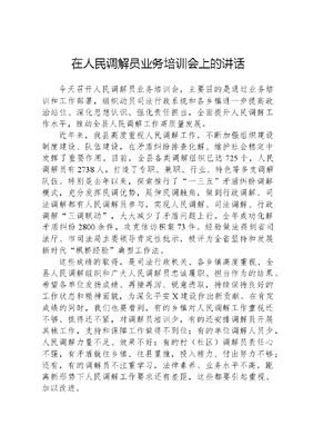 在人民调解员业务培训会上的讲话今天召开人民调解员业务培训会,主要目的是通过业务培训和工作部署,组织动员司法行政系统和各乡镇进一步提高政治站位、深化思想认识、强化责任担当,全面提升人民调解工作水平,推动全县人民调解工作高质量发展。近年来,我县高度重视人民调解工作,不断加强组织建设制度建设、队伍建设,在矛盾纠纷排查化解、维护社会稳定中发挥了重要作用。目前,全县各类调解组织已达725个,人民调解员有2738人,打造了专职、兼职、行业、特色等多支调解队伍。特别是去年以来,探索推行了一三五矛盾纠纷调解模式,充分发挥民调优势,延伸民调触角,做到行政调解、司法调解都有人民调解员参与,实现人民调解、司法调解、行政调解三调联动,大大减少了矛盾问题上行。全年成功化解矛盾纠纷2800余件,攻克信访积案73件。经验做法得到省司法厅、市司法局主要领导肯定性批示,被评为全省坚持和发展新时代枫桥经验典型工作法。这些成绩的取得,是司法行政机关、各乡镇高度重视、全县人民调解组织和广大人民调解员忠诚履职、担当作为的结果。希望各单位发扬成绩、再接再厉、锐意进取,持续保持良好的工作状态和精神面貌,为深化平安X建设作出新贡献。在肯定成绩的同时,我们也要看到,有的乡镇对人民调解工作重视还不够、抓得还不紧,对调解员培训少,有的还安排调解员开展其他工作,支持和保障工作做得不到位;有的单位调解人员少,人民调解力量不足、效果不好;有的村(社区)调解员责任心不强,有矛盾就往乡镇、往县里推,投入精力、付出努力不够;还有,有的调解员不注重学习,法律素养、业务水平不高,距离新形势下人民调解工作要求还有差距,这些都要引起重视、加以改进。今年省市大力开展高质量调解专项提升行动。我们要以专项行动为契机,进一步提升人民调解工作质效。刚才,X同志进行了专题授课,X同志作了工作安排。各乡镇、各调解组织要认真落实有关要求,推动人民调解工作深入开展并取得扎实成效,坚决以高质量调解服务维护高水平安全。下面,就做好人民调解工作,讲三点意见。一、提高站位、深化认识,以高度的政治责任感开展人民调解工作很多矛盾纠纷具有社会性、区域性、突发性的特点,纠纷双方并没有什么深仇大恨,往往由一些鸡毛蒜皮的小事引起,只要能够及时调解,矛盾很容易化解。但如果得不到及时调解,就有可能导致矛盾激化、纠纷升级,小纠纷演变成刑事案件,造成意想不到的严重后果,这样的案例并不少见。靠司法调解、行政调解来解决矛盾纠纷,需要履行法律程序,往往时间长、成本高,有的还难以执行,容易使双方当事人隔阂加深,引发新的矛盾。所以,诉讼并不是解决纠纷的最好方式。而人民调解是非诉讼解决纠纷的一种方式,对及时化解矛盾纠纷、维护社会和谐稳定有着积极作用。人民调解的力量来自基层,与当地的群众有着血肉联系,调解员能够充分发挥亲情、友情、乡情的优势,利用村规民约、居民公约的约束力,很多矛盾在短时间内就能达成调解协议,调解成功率比较高。因此,人民调解在有效化解矛盾上有着不可替代的作用。党的十八大以来,XXXXXX高度重视坚持和发展人民调解工作,作出了一系列重要论述,为新时代人民调解工作指明了方向,提供了根本遵循。2023年召开的全国调解工作会议、全省提升社会矛盾纠纷预防化解能力推进会议,都对人民调解工作的重要性进行了强调。市委也出台过专门文件,对人民调解工作提出具体要求。对此,司法行政机关、各乡镇、各调解组织要进一步提高认识、统一思想,切实把思想和行动统一到中央和省、市对人民调解工作的部署要求上来,做实做细做好人文可居文库——海量学习资料,手机电脑均可下载www.wenkeju.com民调解各项工作,为促进全县社会和谐稳定贡献力量。二、健全制度、夯实基础,全面提升人民调解规范化水平当前,社会矛盾纠纷日趋多元化、多样化、复杂化,要主动适应新形势、新需要,不断创新方式、拓展思路,不断探索矛盾纠纷多元化解机制,推动人民调解工作提档升级、提质增效。一要抓好能力提升,增强人民调解员综合素质。要抓好队伍建设。各级调解组织要不断强化调解员队伍建设,不断提升人民调解工作规范化、专业化、法治化水平,打造一支懂法律、讲政策、会调解的人民调解队伍,为在更深层次、更多领域发挥好调解的基础性作用打牢基础。要抓好业务培训。采取线上、座谈、观摩等方式,组织多种形式的培训,使调解员及时了解和掌握人民调解工作的新形势、新要求,提升解决矛盾纠纷的能力水平。要加强考核评估。建立完善的调解员考核和评估机制,根据工作实绩,对调解员工作进行定期评估,奖优罚劣,调动调解员工作积极性。二要抓实工作举措,创新人民调解工作方式。要突出调解重点。县大调委要发挥牵总作用,聚焦矛盾纠纷易发多发领域,合理分配调解资源;各乡镇调解组织要深入研究辖区矛盾纠纷产生原因、规律和特点,集中力量向重点领域、重点