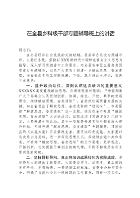 在全县乡科级干部专题辅导班上的讲话同志们:在全县经济社会发展的关键时期,县委举办这次专题辅导班,主要任务是,坚持以XXX新时代中国特色社会主义思想为指导,深入学习贯彻省市工作要求,对全县各单位主要负责同志进行专题辅导,动员广大党员干部进一步解放思想、奋发进取,全面掀起各项工作新热潮。下面,就办好此次培训,我讲三点意见:一、提升政治站位,深刻认识这次培训的重要意义XXXXXX高度重视解放思想,在湖南视察时强调:希望湖南广大干部群众认真贯彻创新、协调、绿色、开放、共享的发展理念,继续解放思想、奋发进取。省委抓住高质量发展的关键,向全省发出了解放思想、奋发进取的动员令。市委紧扣解放思想、奋发进取这一主题,决定在全市开展解放思想、奋发进取大讨论活动,目前活动《实施方案》已经下发,主要开展十项活动,其中一项就是开展党员干部素质大提升行动,积极开展解放思想、奋发进取专题辅导,目前我县的《实施方案》正在修改完善,要尽快印发实施。大家要以这次培训为契机,进一步深化思想认识,深刻领会党中央和省委、市委对解放思想、奋发进取的工作要求,更新观念、开拓创新,切实提振干事创业的精气神,不折不扣推动各项工作实现新突破。二、坚持目标导向,真正将培训成果转化为实际成效。新形势对大家提出了新要求,大家要边学习、边思考,真正做到学有所悟、学有所得。一要提高工作标准。省委全会和市委全会,明确了当前和今后一段时期的工作重点,同样一项工作,是争一流、还是过得去,结果截然不同。大家要以一流的目标谋划工作,发扬跳起来摘桃子的精神,放宽视野,高点定位,完善细化思路目标和具体措施。要以一流的业绩争先创优,逐条梳理承担的各项工作任务,强化预警监测,加强对上沟通衔接,扬优势、补短板、强弱项。要以一流的标杆激励自我,在全国、全省选定标杆,积极学习借鉴外地产业发展、项目建设、招商引资等方面的成功经验,找准工作着力点和突破口,确保各项工作取得扎实成效。二要增强工作本领。省委全会和市委全会紧紧围绕要求进行谋篇布局,对于在坐的各位领导干部来讲,高效推动经济社会发展,不仅要有担当的宽肩膀,还得有成事的真本领。要提高学习思考能力,养成研究的习惯,做到干一行爱一行、钻一行精一行。要提高应急处突能力,强化风险意识和底线思维,时刻保持如履薄冰的谨慎,做好应对各种黑天鹅灰犀牛事件的准备,认真抓好问题隐患排查,抓住要害、果断出手,牢牢掌握工作主动权。近期,山西煤矿爆炸事件的发生再次给我们敲响了警钟,大家要积极借鉴各地经验教训,及时弥补安全生产工作漏洞,切实消除风险隐患。三要转变工作作风。省委全会和市委全会都明确指出了一些干部思想观念和工作作风方面的不足,大家都要对照问题,主动认领,认真查摆,扎实整改。要知责尽责,县委把大家摆在这个位置,就是要大家干事的,对县委、县政府交办的工作任务,绝不能推诿扯皮、互相推脱,必须拿出务实管用的措施抓落实,把该挑的担子挑起来、该扛的责任扛起来。要攻坚克难,面对急难险重任务,既要居中指挥,更要冲锋在前,主动深入一线发现问题、解决问题,一级做给一级看、一级带着一级干,充分发挥领导干部头雁效应。要强化今天再晚也是早,明天再早也是晚的理念,安排的工作、定下的事情,马上就办、事不过夜,争分夺秒跑出发展加速度,真正体现鸡泽干部雷厉风行的作风。三、严守纪律规矩,确保学习培训取得明显成效。当前正文可居文库——海量学习资料,手机电脑均可下载www.wenkeju.com是我们争时间、补作业的关键时期,大家肩负的责任和压力都很重,但是磨刀不误砍柴工,在这样一个时间,县委能给大家创造这样一个机会来进行培训,可以说是下了很大的决心。大家要珍惜学习机会,集中思想、潜心学习,做到听课专心、思考用心、笔记精心。要端正学习态度,遵守学习纪律,维护课堂秩序,不随意走动,不看手机,认认真真地听课,确保学习质量和效果。文可居文库——海量学习资料,手机电脑均可下载www.wenkeju.com