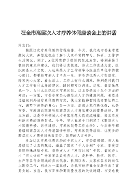 在全市高层次人才疗养休假座谈会上的讲话同志们:按照这次疗养休假的行程安排,今天,我代表市委来看望慰问大家,并借此机会了解下大家平常的学习、科研、工作和生活情况。刚才,x位同志作了很好的交流发言,特别是提了很好的意见和建议,我们将认真梳理,加大工作改进力度。组织部是人才之家,人社局是人才工作领导小组成员单位中的核心部门,都要经常到人才中走一走,和各类优秀人才交朋友,时常关心大家,看生活上、工作上有什么困难,特别是对我们人才工作有什么好的建议,随时都可以沟通。这里,我首先想说一下,为什么组织这次疗养休假。这主要是出于三个方面的考虑:一方面,市委非常关心高层次人才的健康问题,希望通过组织到外地疗养休假的方式,使大家能够暂时远离繁忙的工作,调节下疲劳的身心;另一方面,组织大家疗养休假,也是市委、市政府近距离听取高层次人才意见建议的重要途径。第三方面,这是不同领域人才专家思想火花交流碰撞,相互启发创造灵感的难得契机。今年,市人社局专门制定了《高层次人才国情研修、访学进修、疗养休假等工作办法》,今后每年都要组织高层次人才开展国情研修、疗养休假等活动,让更多的高层次人才感受到来自党委、政府的人文关怀。参加这次疗养休假活动的专家人才,市委组织部、市人社局经过了认真的甄选,涵盖了国家千人计划专家、享受国务院特殊津贴专家、省特支人才双百计划专家、省优秀人才百人计划专家等各类优秀人才,是科研、教学、医疗、生产等各行业领域的杰出代表。长期以来,大家在各自的岗位上勤奋工作,创造出一流业绩,为我市经济社会发展作出了重要贡献。当前,我市正推动高质量发展的关键时期,市委也提出了谱写新篇章的具体任务,实现战略目标,需要全市人民的团结拼搏,也需要广大人才贡献智慧和力量。借此机会,我想对大家提四点希望:一、要弘扬优良作风。XXXXXX曾经列举过几类人才肩负使命、服务社会、报效人民的榜样:当老师,就要心无旁骛,甘守三尺讲台,春蚕到死丝方尽,蜡炬成灰泪始干;做研究,就要甘于寂寞,或是皓首穷经,或是扎根实验室,板凳要坐十年冷,文章不写一句空;搞创作,就要坚持以人民为中心的创作思想,深入实践、深入群众、深入生活,努力创作出人民群众喜爱的精品力作。一个人才,不论在哪个行业、从事什么职业,也不论学历、职称、地位有多高,唯有胸怀理想,秉承优良传统,才能探究更多未知,才能获得更多真理,也才能为社会作出更大贡献。当前,我市进入了新的发展阶段,面临的机遇众多,前景无限美好,各类人才发挥作用、施展才华的舞台更加广阔。不管是外来人才,还是引进人才,大家现在都x地人。希望大家始终胸怀大局、心有大我,以强烈的主人翁意识、执著追求的奉献精神,将自己所学、所专、所长更好地融入改革发展的火热实践中,在服务发展、服务人民中实现人生价值的最大化。二、要坚持勤于学习。学习是一个古老而又崭新的话题。庄子曾说过吾生也有涯,而知也无涯。讲的就是,人要活到老,学到老。联合国教科文组织曾经做过一项研究,结论是:信息通信技术带来了人类知识更新速度的加速。在18世纪时,知识更新周期为80—90年;20世纪六七十年代,一般学科的知识更新周期为5—10年;而到了20世纪80—90年代,许多学科的知识更新周期缩短为5年;进入21世纪时,许多学科的知识更新周期已缩短至2—3年。大家过去通过奋发图强、努力学习、辛勤工作,获得了比较高的职务、职称、荣誉、头衔,这是上级组织对大家过去耕耘付出的的肯定,也是对大家的鼓励和鞭策。但过去优秀,不等于今天优秀;今天拔尖,不等于明文可居文库——海量学习资料,手机电脑均可下载www.wenkeju.com天拔尖。优秀人才的管理,也是优胜劣汰。所以,大家要在各个领域保持领先、拔尖的地位,要发挥更大的作用、作出更大的贡献,必须继续刻苦学习,潜心钻研,加快知识更新。三、要勇于开拓创新。勇立潮头、敢为人先,是高层次人才的优秀品格。不管是从事科研、教育、医疗,还是农林牧渔业生产经营,都应该提倡和发扬这种优秀品格。大家都知道,企业要想发展壮大,一定要有核心技术。XXXXXX也寄语广大民营经济人士,要练好企业内功,增强创新能力和核心竞争力。因此,我市的高层次人才要以顽强拼搏、百折不挠的进取精神,充分发挥学术技术上的优势,多出成果,出一流成果,努力抢占科技发展的制高点;加大对产业核心技术和关键技术的研发力度,坚持产学研相结合,着力提高科技成果的转化和应用水平;既尊重个人创造,发挥尖兵作用,又注重集体攻关,发挥合作优势;要坚持面向经济社会发展主战场、面向人民群众新需求,让创新成果更多更快造福社会、造福人民。四、要提携青年人才。青年是祖国的前途、民族的希望、创新的未来。青年一代有理想、有本领、有担当,科技就有前途,创新就有希望。在此,我也希望我市的高层次人才要关心和爱护