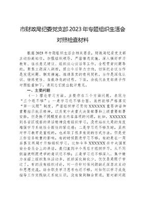 市财政局纪委党支部2023年专题组织生活会对照检查材料根据2023年专题组织生活会相关要求,财政局纪委党支部主动抬高站位,加强组织领导,严密推进实施,深入搞好学习教育、征求意见建议、组织谈心谈话等工作,全程贯穿问题导向,聚焦主题深入剖析,提出今后努力方向,切实把会议当作是发现问题、制定措施、推进落实的有利契机,当作是深化认识、锤炼党性、自我净化的过程。下面,由我代表支部班子作对照检查如下,请同志们提出批评意见。一、主要问题(一)理论学习方面。主要存在三个方面问题,表现为三个还不够:一是学习还不够全面,虽然能够严格落实第一议题制度,严密组织学习贯彻XXXXXX重要讲话和重要指示批示精神,以及党中央重大决策部署和上级重要部署安排,但是换不同程度存在内容落项的问题,比如,XXXXXX到各省区视察的讲话精神没有组织学习,没有站在大局的角度增强学习系统性全面性的紧迫感;二是学习还不够及时,虽然对学习教育是重视的,也采取了很多有效的方式方法,但是受工作任务较重的影响,有的时候跟进学习不够,有的是在一周后甚至两周才开始组织学习,比如今年XXXXXX在中央国家安全委员会上的讲话,我们直到半个月后才组织学习,从不同侧面说明跟进学的意识还不够;三是学习还不够深入,集中精力在面上组织集体活动多,抓好深化转化少,仅仅是局限于学过了,有的没有组织讨论,对一些针对性问题缺乏深层次互动和思想交流,结合职责学习思考也还不够,对如何以学习成效指导工作实践缺乏系统认识,没有做到融会贯通,面对新问题新挑战,运用理论指导实践、推动建设发展的能力还不足。(二)政治素质方面。主要存在三个方面问题,表现为三个还不足:一是政治能力还不足,虽然能够自觉深入学习,始终同党中央保持高度一致,但对政治理论知识还缺乏了解和理解,对国内外一些政治动态了解不足,还不能准确判断政治现象和事件背后因素和影响,在政治议题上缺乏独立思考和判断力,对政治决策、公共政策等问题缺乏关注,政治判断力、领悟力、执行力还有欠缺;二是领悟理解还不足,由于政治理论学习的不够扎实,对两个确立蕴含的历史逻辑、理论逻辑、实践逻辑理解和把握得不够充分、全面和深刻,导致部分党员干部的政治鉴别力难以适应现实需求,对鱼龙混杂的国际舆论、良莠不齐的国外思潮、社会上存在的错误言论缺少斗争精神和辨别能力;三是斗争精神还不足,政治领悟力不足往往对政治斗争的本质和规律缺乏深入的认识和理解,难以准确判断形势并采取有效的应对措施,特别是对一些问题斗争精神不够,多是会上讲的多,平时说的少,有时即使开展批评,多半是以建议代替批评,距离红红脸、出出汗的要求还有一定的差距,斗争的角度、尺度、力度把握得不够精准,常常采用正面驳斥的方法,斗争的效果不够好。(三)能力本领方面。主要存在三个方面问题,主要表现在三个还不强:一是深化思想还不强,虽然能够持续加强学习,注重转化深化,但对如何守正创新、走深做实缺乏深度思考,透过现象看本质的能力有待进一步提高,站在推动发展、服务大局的角度去思考问题的高度不够,安排得多、督促得少,宏观指导的多、扑下身子抓落实的少,缺少深入的调查研究,没有很好地深入一下研究问题、解决问题,特别是部分班子成员学习不深不透,不注重提升自身综合素质,导致存在干部履职能力不足、本领恐慌问题。二是能力素质还不强,虽然够认真履行职责,全力推进全面从严治党,抓好党风廉政建设,但在发挥党的领导核心作用,强化统筹调度上有差距,在一些工作推进落实上还没有真正做到抓底扣细,班子成员缺少时刻保持干一行、钻一行、精一行的恒心毅力,主动发现问题、靠前服务的意识还不够,不同程度存在按部就班、被动求稳的现象,有时会满足于现状,忽视在工作标准、能力素质还没有达到上级的要求。三是培养帮带还不强,当前上级好于下级、领导干部好于一般干部的现象比较突出,能力发展不平衡、不全面的问题亟待解决,班子对加强干部队伍专业能力建设的长期性、艰巨性认识不够深刻,在落实干部教育培育制度机制,加强谋划部署方面做得还不够,特别是针对性还不强,载体不够多,缺乏及时发现和解决自身存在问题的意识和能力。(四)担当作为方面。主要存在三个方面问题,主要表现在三个不够好:一是主动作为不够好,有时存在不求有功、但求无过、回避矛盾、避重就轻的现象,对一些疑难杂症缺乏担当意识,遇到矛盾、困难和问题,不去主动化解克服,工作原则性、战斗性不强,不同程度存在—停二看三绕开,没有真抓实干,攻坚克难,坚忍不拔,奋发有为的姿态,有的时候使小矛盾成了大矛盾、小问题成了大问题,比如在一件信访问题上,本来很容易化解,由于效率不高造成越级上访问题。二是务实求实不够好,有时感觉疲于应付,放松了对标准的要求,满足于不出错、过得去,很多情况下,任务要求时间紧、工作量大,积极向上、锐意拼搏的工作热情、主动