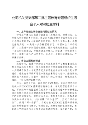 公司机关党支部第二批主题教育专题组织生活会个人对照检查材料一、上年组织生活会查摆问题整改情况针对上年度民主生活会查摆出了思想政治、精神状态、工作作风等方面的5个问题,我结合XXX新时代中国特色社会主义思想和党的XX大精神的学习贯彻,从五个方面入手,将整改落到实处:一是进一步加强理论学习,牢固树立四个意识;二是进一步加强党性锻炼,始终对党忠诚老实;三是进一步强化宗旨意识,持续改进工作作风;四是进一步强化责任担当,落实全面从严治党责任。五是进一步强化纪律观念,严格廉洁自律。二、参加主题教育情况通过学习,我进一步加深了对开展党史学习教育重大现实意义和深远历史意义、重点内容和工作要求的理解和把握,进一步明确了作为一名党员在党史学习教育中应该如何立足本职岗位,将党史学习教育过程中激发出来的信念信心、热情激情,凝聚成走在前、当表率、做示范的工作动力,转化为立足本职、干好工作的具体行动。作为一名党员干部,我将牢记XXX嘱托,坚决把思想和行动统一到XXXXXX重要讲话精神上来,学史明理把准学习方向,不断汲取和挖掘蕴藏在党史中丰富的政治营养和精神瑰宝,深刻感悟马克思主义的真理力量和实践力量,深刻把握贯穿其中的坚定信仰信念、鲜明政治立场、强烈责任担当、求真务实作风和科学方法论,切实增强四个意识、坚定四个自信、做到两个维护,自觉对表XXXXXX重要讲话精神,深刻接受党的初心使命、性质宗旨、理想信念的生动教育,更好地从党的百年伟大征程中汲取前进的智慧、奋进的力量,为企业高质量发展贡献一己之力。三、问题查摆情况(一)理论学习方面。一是学习方式方法单一,学习效果不明显。对党组织的学习安排比较重视,但方式方法比较单一,学习不系统、理解不深入、领会不深刻。二是学用结合不够到位。对XXX新时代中国特色社会主义思想蕴含的巨大实践价值、科学思想发展观及方法论领会还不到位,没有真正将学习成果转化为落实工作的有力举措。(二)政治素质方面。对XXX新时代中国特色社会主义思想的历史地位、哲学意蕴等深刻内涵的理解还不够透彻,把握得不够精准,对其指导工作实践思考得不够全面,研究得不够彻底,还存在浅尝辄止的情况,离学懂弄通做实的要求还有一定的差距。有重实践轻理论的倾向,精力多放在业务工作中,在理论研究投入偏少,自觉主动利用工作空闲和业余时间抽时间静下心来深学细研不够。(三)能力本领方面。一是做事情存在虎头蛇尾的问题。公司制订的重点工作、重要事项在落实过程中没有做到统筹兼顾、整体推进,对于一些解决难度大的工作缺少敢啃硬骨头的韧劲。二是存在形式主义的问题。对一些重点工作不重视具体协调跟踪督促落实,有停留于会议、文件层面,致使一些工作流于形式。(四)担当作为方面。一是改革创新意识还不强。面对党的二是大对工作的新要求新部署,结合自身工作标准化规范化上还存在创新勇气,工作思路不够宽不够高,闯劲不足。二是服务解难不够到位。面对制约工作开展的难点堵点、群众诉求,有时深入研究不够、帮难解困不够、倾力服务不够。(五)工作作风方面。一是对照先进典型高尚的道德情操,在守初心、讲奉献方面自觉看齐意识还不强,还没有真正把先进典型作为工作、学习、生活等方面的学习榜样。二是对照先进典型担当有为、奋发进取的作风形象,还缺乏追求卓越、勇于担当作为的进取精神,遇到艰难险阻还有退缩观望的念头,还缺乏自强奋进、永争第一的顽强作风。(六)廉洁自律方面。自己能自觉遵守党纪党规,树立红线意识和底线意识,认为只要自己不越雷池,不碰红线,就站得直、行得正,而没有将自己摆在正确位置上,没有充分发挥党员先锋模范作用,没有以一名优秀党员干部的高度去衡量、去引导和影响身边的同事,先锋模范作用发挥的还不够充分。四、问题原因剖析综合各方面提出的批评意见建议,经认真分析,个人认为自身存在问题的根源主要有以下几个方面原因。一是理论武装有所松懈。主要还是自己在深学、细学上做得不到位,总开关拧的不够紧,紧箍咒不常念,放松了自我净化、自我革新、自我完善、自我提高。二是宗旨意识树立不牢固。尽管2023年做了许多工作及努力,但干工作的精气神没有以往足了,服务意识有所淡化。想问题、办事情往往从本位出发,没有解决好我是谁、为了谁、依靠谁的问题。三是求真务实作风不够硬。没有完全把求真务实的本质要求贯穿到工作实践中,工作中自觉不自觉地表现出一定程度上的功利化倾向,干事情存在追求看得见摸得着的显绩,放松忽视长效性、难度大的潜绩的情况。四是自我约束有所放松。没有严格以党章来严格要求和检视自己的思想,更没有在党性党风党纪方面为自己树立一个更高标杆,防微杜渐、警钟长鸣的自觉性不强,心有所畏、言有所戒、行有所止的自律意识还不够坚定。五、整改措施针对查摆出来的问题,将结合XXX新时代中国特色社会主义思想和党的XX大精