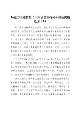 局党委主题教育民主生活会主持词和讲话提纲范文(1)这次局党委班子民主生活会,是在学习贯彻党的**大精神全面开局、中国式现代化建设提速加力推进的重要历史节点召开的,是推动学习贯彻XXX思想主题教育的重要举措,时机特殊,意义重大。特别是xx领导亲率工作组,对我们进行面对面帮带指导。这两天,听取了年度工作开展情况和民主生活会准备情况汇报,与我们常委同志进行个别谈话,审阅个人对照检查材料,今天亲自参加指导会议,为我们高质量开好这次民主生活会奠定了坚实基础。今天的会议,应到7人,实到7人,可以开会。会议主要有4项议程:一是听取2022年民主生活会整改措施落实情况报告,听取本次民主生活会征求意见情况;二是由我代表党委班子作对照检查;三是班子成员按照一人讲、大家评、逐个过的办法进行对照检查,相互开展批评;四是请领导作指示。会议过程中,请大家注意把握3点:一是聚焦会议主题。紧紧围绕明确的主题,统一思想、深化认识、凝聚意志,切实把握遵循和依据。二是突出问题导向。围绕落实讲政治、善创新、重实干、严自律等4个方面要求,认真检查自身存在的问题,深入剖析深层次原因,提出改进提高的措施打算。三是发扬斗争精神。自我批评要开门见山、直奔主题,相互批评要坦诚相见、见人见事,真正从思想和内心深处受到警醒触动。首先,进行第一项议程:听取情况报告。听取上次民主生活会整改措施落实情况报告和本次民主生活会征求意见情况。这2个情况报告,已经报常委同志审签,结合大家的意见,进行了修改完善,大家对照检查时要针对问题深入检视剖析。………………………………下面,进行第二项议程:由我代表党委班子作对照检查。………………………………关于加强班子建设问题,领导还要给我们作重要讲话,我们将结合学习贯彻指示精神,进一步研究加强和改进局党委班子建设措施。初步考虑,重点从以下4个方面加以改进提高:一要持续在讲政治固忠诚上带好头作表率。立魂塑形首先从常委同志做起,带头深学笃行XXX思想,特别是要深刻理解两个确立的决定性意义,严肃恪守两个维护这一最高政治原则,不断提高政治判断力、政治领悟力、政治执行力。二要持续在善创新求突破上带好头作表率。坚决贯彻落实习XXX抓创新就是抓发展,谋创新就是谋未来的指示要求,创新攻坚首先从常委同志做起,完整、准确、全面贯彻新发展理念,要把创新实践作用于单位建设发展的各领域全过程,特别是要运用创新性思维创造性落实上级要求,运用创新性思维创造性推进全面建设各项工作。三要持续在重实干促发展上带好头作表率。坚决贯彻落实习XXX脚踏实地,埋头苦干,不驰于空想,不骛于虚声的指示要求,担当实干首先从常委同志做起,进一步强化革命加拼命精神,以永不懈怠的精神状态和一往无前的奋斗姿态,紧盯向心凝聚的重大问题、向上发力的关键问题、向难攻坚的突出问题使劲用力,真抓实干、埋头苦干、紧张快干,让我们这一届班子在历史的接力跑中,跑出新状态、跑出加速度、跑出好成绩。四要持续在严自律正风气上带好头作表率。坚决贯彻落实习XXX越是领导机关,越是领导干部,越是主要领导,越要率先垂范、廉洁自律,带头诺廉践廉的指示要求,律己正身首先从常委同志做起,进一步强化严的自觉、立起严的导向、落实严的要求,带头接受教育管理监督,带头振奋精神状态,带头简朴公务、简约生活、简单交往,坚决防特权、防违纪、防逾规,使我们这个班子成为上级党委放心信任放手干、广大党员拥护信赖跟着干的好班子。下面,进行第三项议程:党委班子成员开展批评和自我批评。采取个人讲、大家评、逐个过的方式进行,我先给大家当靶子,请同志们放下顾虑向我开炮,我一定虚心接受、举一反三、坚决整改。下面,我先进行自我批评。………………………………下面,请大家向我开炮………………………………刚才,副书记和常委同志对我提的批评意见都很好,一共有12条,有领导能力的问题,有建设能力的问题,有性格修养的问题。大家相处时长比较长了,相互之间很了解,有些情况大家前期交流时指出来了,大家对我提出的批评意见都是有事实依据的。我也和同志们交心,在这里任职时间越长,越感到责任的重大,越有一种恐慌感,越感到首先更新自己、改造自己的极端重要性和紧迫性。所以,我虚心接受、坚决整改,恳请大家随时随地对我进行批评帮助,也真诚欢迎对我整改情况进行监督。领导,您看这样批评行不行?………………………………下面,让我们以热烈的掌声请领导给我们作指示。………………………………同志们,领导在工作这么繁忙的情况下,亲率工作组带着对我们一线广大党员的亲切关怀和特殊厚爱,对我们全面建设情况的深切期望,利用两天时间视察指导、看望大家,市区主要领导这么长时间这么关注一个单位是不多见的。几天来,领导聚焦挂钩帮建、参加指导党委班子民主生活会、调研有关重大问题,每一个点位领导都走到