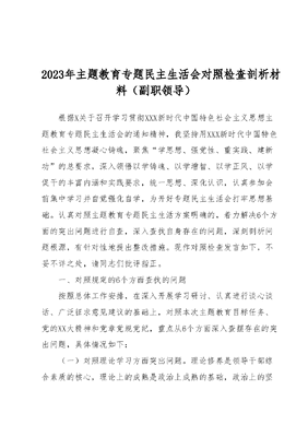 2023年主题教育专题民主生活会对照检查剖析材料(副职领导)根据X关于召开学习贯彻XXX新时代中国特色社会主义思想主题教育专题民主生活会的通知精神,我坚持用XXX新时代中国特色社会主义思想凝心铸魂,聚焦学思想、强党性、重实践、建新功的总要求,深入领悟以学铸魂、以学增智、以学正风、以学促干的丰富内涵和实践要求,统一思想、深化认识,认真参加会前集中学习并自觉强化自学,为开好专题民主生活会打牢思想基础。认真对照主题教育专题民主生活方案明确的,着力解决6个方面的突出问题进行自查,深入查找自身存在的问题,深刻剖析问题根源,有针对性地提出整改措施。现作对照检查发言如下,不妥不详之处,请同志们批评指正。一、对照规定的6个方面查找的问题按照总体工作安排,在深入开展学习研讨、认真进行谈心谈话、广泛征求意见建议的基础上,对照本次主题教育目标任务、党的XX大精神和党章党规党纪,重点从6个方面深入查摆存在的突出问题,具体情况如下:(一)对照理论学习方面突出问题。理论修养是领导干部综合素质的核心,理论上的成熟是政治上成熟的基础,政治上的坚定源于理论上的清醒。学思想是主题教育的首要要求,彰显了我们党始终重视思想建党、理论强党的鲜明导向。在新征程上面对更为艰巨的历史任务,需要党员干部深化理论学习、强化理论思维、注重理论转化,不断提高政治判断力、政治领悟力、政治执行力,做政治上的明白人、理论上的清醒人、行动上的领路人。对照该方面的要求,自身存在的差距主要有:一方面,理论学习上缺少巧劲,缺少管用有效的办法举措,导致学习按部就班对XXX新时代中国特色社会主义理解不深,浮于表面。另一方面,理论学习上缺少韧劲,还存在按时参加集体学习、按要求做好自觉就算成任务的思想,学习内容拘泥于规定内容,没有从解决工作实际问题、开拓工作思路的角度主动拓展学习内容,加深对学习内容的理解和把握。比如,在班子分工上,我长期负责X工作,对于工作内容、业务非常熟悉,无形中限制了创新开展工作的思路,自认为有丰富的工作经验,能够轻松应对各类问题。但是面对当前改革逐步深化、各项矛盾突出复杂,真正遇到新情况新问题时存在临时抱佛脚的情况,只求能够暂时应对,解决问题,很少能把遇到的新问题和新理论结合起来思考探索,没有有没有更好的、长久管用的办法。(二)对照政治素质方面突出问题。对党忠诚,是共产党人首要的政治品质。作为党员领导干部,要以身作则,做到以党的旗帜为旗帜、以党的意志为意志、以党的使命为使命,以真心爱党、时刻忧党、坚定护党、全力兴党的实际行动诠释对党绝对忠诚,定能创造无愧于党、无愧于人民、无愧于时代的业绩。对照该方面的要求,存在的主要问题有:一是锤炼党性修养的自觉性不够,存在盲目自信倾向,不自觉放松党性锻炼。比如,在落实日常谈心谈话制度方面,与分管处室、党员干部谈心谈话,多是针对具体事务,谈话内容也多是停留在业务层面,真正敞开心扉谈思想、讲问题较少。在虚心接受别人批评意见方面欠缺,没有主动利用谈心谈话的机会向分管处室负责人、党员干部征询自身在分管业务、处理事务方面存在的问题,谈心谈话泛泛而谈,不深刻不深入。二是政治敏感度不够,站在更高角度观察问题、分析问题的敏锐性仍需加强。对XXX新时代中国特色社会主义思想,往往只是从党的创新理论层面去理解,没有结合其治国理政的鲜明特征,将其放到时代大背景下,学习揣摩蕴含其中的治国理政的方法论,处理问题存在思维定势,习惯于凭经验做决定,不能做到推陈出新、游刃有余。比如,在安排布置分管领域工作时,更多的时候是从自身完成任务角度去分析问题,布置工作,没有时时站在更高的角度去考虑,导致工作完成与实际要求有差距。(三)对照能力本领方面突出问题。以学增智,就是要从中悟规律、明方向、学方法、增智慧,把看家本领、兴党本领、强国本领学到手,要通过理论学习提升政治能力、提升思维能力、提升实践能力,把XXX新时代中国特色社会主义思想的世界观、方法论和贯穿其中的立场观点方法转化为自己的科学思维方法,作为研究问题、解决问题的总钥匙。对照该方面,存在的主要问题是应对风险挑战的本领不够强,主动斗争的精气神不足,担当意识不够,应对风险挑战的能力还有差距。比如,有些分管工作满足于安排了、布置了,对于工作完成的进度、质量过问不多把关不严,导致工作推动缓慢、成效不明显。对于一些新问题存在本领恐慌,有等靠思想,更多是希望主要领导给予指导,自身在应对新问题时还没有必胜的信心,在应对急难险重任务时没有十足的底气。(四)对照担当作为方面突出问题。敢于担当是一种态度,也是一种精神,更是一种责任担当的表现。党员干部要进一步增强责任意识,主动担当作为,立足本职、勇挑重担、勤勉工作,敢于在大是大非面前亮剑,面对困难挺身而出,不绕道而行遇到挫折撑得住,关键时刻顶得住,以更大的勇气和智慧、以更强的意志品