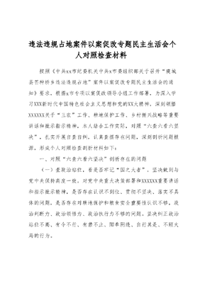 违法违规占地案件以案促改专题民主生活会个人对照检查材料按照《中共xx市纪委机关中共x市委组织部关于召开虞城县芒种桥乡违法违规占地案件以案促改专题民主生活会的通知》要求,根据x市专项以案促改领导小组工作部署,为深入学习XXX新时代中国特色社会主义思想和党的XX大精神,深刻领悟XXXXXX关于三农工作、耕地保护工作、乡村振兴战略等重要讲话和批示指示精神,本人结合工作实际,对照六查六看六坚决,扎实开展自查自纠,认真查摆存在问题,深刻剖析问题根源,形成个人对照检查剖析材料如下:一、对照六查六看六坚决剖析存在的问题(一)查政治站位,看是否牢记国之大者,坚决做到与党中央保持高度一致。对党中央重大决策部署和XXXXXX重要讲话和指示批示精神,是否存在认识不到位、贯彻不坚决、落实不具体的问题,是否存在对耕地保护和粮食安全重要性认识不够,政治判断力、政治领悟力、政治执行力不够的问题。坚决纠正政治站位不高、有令不行、有禁不止、阳奉阴违、自行其是、不顾大局的行为。经自我查摆剖析,在是否牢记国之大者,坚决做到与党中央保持高度一致方面。本人能够时刻关注党中央在关心什么、强调什么,提高政治站位,在思想上站得高、看得远,学会从中央的高度思考问题、理解政策。深刻领会什么是党和国家最重要的利益,什么是最需要坚定维护的立场,在重大原则、重大立场和重大利益做到心明眼亮。不存在政治站位不高、有令不行、有禁不止、阳奉阴违、自行其是、不顾大局的行为。但理论学习的连续性、系统性、全面性有欠缺,有时急学急用、现学现用,追求实用主义,对XXX新时代中国特色社会主义思想的精髓和内涵领会把握不深入、不全面,缺乏专研学、贯通学的专注精神和热情,融会贯通、举一反三做的不够。(二)查作风建设,看违法违规占地背后是否存在形式主义官僚主义和作风问题,坚决做到牢记初心担当使命。各级党员领导干部要牢记三个务必,勇于担当作为、积极履职尽责,认真查纠对违法违规占地问题实体性监督落空,审批监督文字对文字、电脑对电脑,流于形式问题。解决好层层转批、当甩手掌柜,以批示代替落实,责任心不强、作风不严不实、不作为的官僚主义、形式主义问题。经自我查摆剖析,在违法违规占地背后是否存在形式主义官僚主义和作风问题,坚决做到牢记初心担当使命方面。本人能够深刻领会三个务必的科学内涵和实践要求,牢记XXXXXX重要训词精神,牢记我们党为中国人民谋幸福、为中华民族谋复兴的初心使命。我作为领导干部,能够做到走在前、作表率,以功成不必在我的胸怀和功成必定有我的担当,攻坚克难、砥砺奋进,不存在以批示代替落实,责任心不强、作风不严不实、不作为的官僚主义、形式主义问题。(三)查为民情怀,看是否始终坚持人民至上,坚决维护人民群众切身利益。坚持全心全意为人民服务宗旨,坚持把人民至上作为一切工作的出发点与落脚点,用心用情用力解决人民群众急难愁盼问题,切实让人民群众看到变化、得到实惠,严厉查处群众身边腐败和不正之风。经自我查摆剖析,在是否始终坚持人民至上,坚决维护人民群众切身利益方面。本人能够牢记XXXXXX训词,凡是群众反映强烈的问题都要严肃认真对待,凡是损害群众利益的行为都要坚决纠正,能够始终坚持人民至上理念,把实现好、维护好、发展好最广大人民根本利益,作为平时工作的出发点和落脚点。为了把好事办实、实事办好,办到群众心坎上,本人积极发挥示范带动作用,主动下沉村居走访调研,听真话、摸实情、找问题,问需于民、问计于民,体察社情民意、了解群众诉求,解民忧、纾民困、化民忧、暖民心。但工作中有时会出现拖拉现象,没有做到立说立行、雷厉风行、立竿见影,对遇到的新困难和群众反映的新问题没能马上出台解决措施。(四)查监管执法,看是否履职尽责积极作为,坚决守牢耕地保护红线和粮食安全底线。排查违法占地、农田抛荒背后是否存在不作为、乱作为问题,监管部门是否存在日常监管不到位、监督执法不力问题,实施耕地网格化管理和田长制落实不到位问题,早发现、早报告、早处置工作机制和常态长效监管机制落实不到位问题,农田非农化、良田非粮化、违法违规占用耕地建房的问题等。经自我查摆剖析,在是否履职尽责积极作为,坚决守牢耕地保护红线和粮食安全底线方面。本人能够深入学习贯彻XXXXXX关于耕地保护和粮食安全的重要论述,认真贯彻落实党中央、国务院、省委省政府决策部署,市委市政府工作安排。严格履行责任,严守政策法规,坚决守住守牢耕地保护红线。自觉站在两个维护的高度,充分认识耕地保护的极端重要性,时刻紧绷耕地保护这根弦,严格落实耕地保护政策法规,不断健全完善土地执法监管体制机制,坚决把有限的耕地资源保护好、利用好。(五)查法规宣传,看是否做到普法宣传到基层,坚决严守法律底线不碰高压线。自然资源、农业农村等关部门,要认真查找土地政