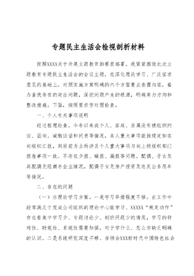 专题民主生活会检视剖析材料按照XXXX关于开展主题教育的要求部署,我紧紧围绕此次主题教育专题民主生活会的会议主题,在深化理论学习、广泛征求意见的基础上,对照实施方案明确的六个方面重点查摆内容,着力查找存在的突出问题,深挖问题产生的根源,明确努力方向和整改措施。下面,按照要求作对照检查。一、个人有关事项说明经过梳理检查,今年以来我个人、家庭、亲属没有被组织约谈、函询、诫勉谈话和问责等情况,本人重大事项能按规定如实向组织汇报,到目前为止所涉及个人重大事项与向上级组织部门报告事项一致,不存在少报、瞒报、漏报等问题。配偶、子女及其配偶无经商办企业情况,配偶子女无房产投资及违反公务用车等情况。二、存在的问题(一)在理论学习方面。一是学习举措强度不够。在工作中经常满足于完成公司组织的理论中心组学习、XXXXX规定动作存在着集中学习少、专题讨论少、剖析问题少的情况,学习的针对性、时效性、系统性需要加强,对于学什么、怎么学缺乏明确的认识。二是系统研究深度不够。在领会XXX新时代中国特色社会主义精神实质方面还缺乏一以贯之的自觉性,在一定程度上忽视了理论联系实际、理论指导实践的重要原则和根本作用,实际上所学的理论与具体工作脱节,没有起到理论指导实践的应有效果存在运用其包含的马克思主义立场、观点、方法破解公司经营发展难题不到位的问题。三是融会贯通力度不够。把XXX新时代中国特色社会主义思想中的工作规律与分管工作有效融合还不够到位用政治眼光观察和分析问题的水平还有待提高,主动服务和融入公司工作大局,围绕中心工作、重点工作履职尽责的政治自觉还不够。(二)在政治素质方面。一是对两个确立认识不足。虽然已经入党多年,但是政治素养方面还不够高,政治判断力、政治领悟力、政治执行力不够强。对意识形态领域工作重视不够,对两个确立中的理论逻辑、历史逻辑和实践逻辑,未能完全做到知行合一,忽视了意识形态领域的教育和管理。二是对政治纪律认识不够深。有时认为自己在行动上与党的要求保持一致就行了,思想认识不重要,对社会上一些错误的政治言论没有主动抵制,存在麻痹思想,对四个意识理解认识还需要进一步加强,在践行四个自信的自觉性上还有一定差距,政治敏锐性和政治洞察力还有待加强。三是党建工作抓得还不够紧。党建意识树得还不够牢,还存在思想认识误区,对于分管部门的党建工作责任链条拧得不紧、业务和党建融合还不够深。(三)在能力本领方面。一是工作思维还不够开阔。在工作当中新发展理念树立不够牢靠,工作中系统思维运用不够充分,没有以更加开阔的眼界、思路和胸襟,从推动公司发展大局的高度看待工作,对新形势新要求适应还不够快,在日常工作过程中凭经验靠制度循规蹈矩多,敢创新善创新锐意进取少,突出表现在XXX创新、XXX反馈机制执行方面还没有真正地建立长效机制。二是业务提升还不够明显。在落实上级重要部署要求的方法还不够务实管用,把握上级会议精神不够准确,推动落实上级议定事项不够及时、不够有力,业务能力没有做到与时俱进,把上级要求部署融入实践工作当中还有欠缺。三是斗争本领还有待提升。面对新形势新任务,缺乏政治敏锐性和政治洞察力,斗争本领还不够强,应对风险挑战的本领还有待进一步提升。在配合班子完成XXX工作,推进XXX工作,XXXX等方面下的功夫还不够大,硬的措施和实的招数不够多,特别在控本增盈上措施还不够多。(四)在担当作为方面。一是引领作用发挥还不够充分。作为公司班子成员,统筹作用发挥不够充分,系统性体系化抓大事谋大事还不够,对如何牢牢把握XXXXXX点的问题、教的方法、指出的路径,更好地融入工作服务大局,思考得还不够深,将XXXXXX重要讲话重要指示精神转化为干事不竭动力的具体措施、具体实践做得还不够到位。二是创新意识还有待提升。有时仅停留在确保完成各项重点工作任务和推进日常工作上。存在工作按部就班,想问题、做决策顾虑较多,开拓创新少,就工作干工作多,主动落实少,研究情况多,解决问题少,工作上缺乏新意,缺少亮点,习惯于用老方法解决新问题,对如何创新工作思路等方面缺乏系统深入的研究,对当前集团高质量发展的要求、公司可持续发展的需求缺乏探索创新的及时性、主动性。三是动真碰硬劲头还不够足。随着年龄的增长,干事创业的劲头有所减弱,在实际工作中,缺乏螺丝钉精神,距领导干部要事事带头、以上率下还稍有差距,容易造成深入一线少、深入岗点少,对各部门的XXX需求做到了及时协调、及时解决,但在后续使用效果上供应时效上缺乏深入,个别时候容易造成事与愿违的情形存在。(五)在工作作风方面。一是工作调研还不够深入。因为工作性质的原因,仅仅按照上级要求调研次数完成规定动作,由于调研时间较短,调研方向不准,导致调研质量并不高,通过深入调研发现职工群众急难愁盼问题,做得还不够到位。二是工作落实还没有形成闭环。对