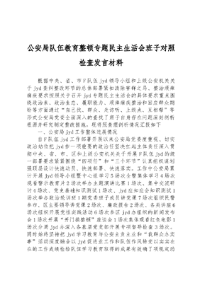 公安局队伍教育整顿专题民主生活会班子对照检查发言材料根据中央、省、市F队伍jyd领导小组和上级公安机关关于jyd查纠整改环节的总体部署紧扣清除害群之马、整治顽瘴痼疾要求按照关于召开jyd专题民主生活会的具体要求重点围绕政治素、政治生态、履职能力、顽瘴痼疾整治和回应群众期盼等方面通过自己找、群众、走访听、上级点、互相帮等形式公安局党委全面深入的查找了班子自身存在问题深刻剖析根源并研究制定整改措施。现将照查摆剖析情况汇报如下一、公安局jyd工作整体进展情况自F队伍jyd工作部署开展以来公安局党委度重视、切实政治站位把jyd作一项重要的政治任坚决扛起主体责任深入贯彻中央、省、市、区和上级公安机关关于开展F队伍jyd的统一部署要求紧紧围绕四项任和三个环节认真组织谋划强顶层设计快速动员、快速部署、快速落实。工作中公安局累计开展jyd领导小组暨中心组学习5场次全警集体学习4场次观看警示教育片2场次举办主题演讲比赛1场次、集中交流研讨4场次、党史基础知识测试1场次、jyd应知应会知识测试1场次举办政治轮训班1期党委班子成员讲党课7场次组织民警参市、区主要领导讲党课2场次、廉政报告2场次、各类讲座6场次组织开展党性实践活动6场次参区jyd办组织的新闻发布会1场次开展开门搞整顿座谈会1场次集体观看红色电影1场次分局jyd办深入各基层党支部开展专项督导检查3场次。同时始终坚持把jyd学习教育与公安主责主业和我群众办实事活动深度融合以jyd促进业工作和队伍作风转变以实实在在的工作成绩检验队伍学习教育取得的成果有效确了项规定动作全部落实到位学习教育环节与查纠整改环节有序衔、无缝。在查纠整改环节按照市F队伍jyd办和省公安厅关于队伍jyd查纠整改环节的总体部署要求结合落实市jyd办《关于落实项重点任做好迎中央督导组督导准备工作的通知》文件精神我局于月日召开队伍jyd工作推进会学习教育环节工作进行回顾总结并查纠整改环节工作进行安排部署。截至月日我局已完成了除外出办案、培训人员以外全体民辅警全覆盖的谈心谈话和第一次填写《民辅警自查情况报告表》共填写谈心谈话表余份、《自查情况报告表》份。二、存在的主要问题(一)思想政治建设方面。一是理论武装缺乏深入性和持续性。党委政治理论学习的效果与学懂、弄通、做实的要求还有差距。比如党委理论学习中心组学习片面强调完成学习任致使理论学习仍然停留在机械学习文件、要求的层面班子成员结合所学交流心得体会的相较少使学用结合打了折扣。二是贯彻落实上级决策部署还不够有力。从贯彻落实中央、省、市和上级公安机关决策部署情况来看与上级要求仍然存在一定差距。比如有时过于注重贯彻上级决策部署的及时性以学习新闻简讯替了原文学习导致所学习内容不全、不细、不精、不深。再比如在贯彻落实中通盘考虑还不够全面结合实际创造性开展工作还不够攻坚克难的勇气和决心还有待升在任完成的上离上级要求还有不小的差距。三是重点工作统筹协调还不够紧。结合公安工作实际实际创新工作方法举措方面做得不够好统筹推进的力度还不强。比如年初部署的一些重点工作进度相滞后各项工作虽有成绩但亮点不突出与上级确定的工作目标仍存在一定差距。四是作风建设上仍然存在短板。持之以恒、一抓到底的作风还不够扎实。比如事关全省公安机关一表考指标任的工作部署推动、要求的多因地制宜解决本地社会治安打、防、管、控问题的较少。再比如基层部门班子作风建设抓的不够实在抓基层班子的能力培养、素升上方法单一措施较少力度不够强导致基层班子全而不强的问题比较突出一些中层干部把自己等同于一般党员缺乏标准、严要求表率作用发挥不明显。(二)政治生态建设方面。一是党风廉政建设责任压力传导不到位。党委抓党风廉政建设的力度仍然不够抓作风建设的思路办法也不够多、不够实重业、轻廉政建设思想依然存在。比如2020年有几名民辅警违法违纪两名辅警更是越级上访根子在班子成员一岗双责落实不到位民辅警思想状况掌握不深中层干部压力传导不到位民辅警理想念有缺失。二是推进基层党建标准化进程还需进一步快。党委在系统谋划、统一实施基层党建标准化建设上做得还不够抓的不够严致使基层党的党的政治建设工作有所弱化、虚化。比如个别党支部落实党内政治生活不严、不实主题党日固定党日活动形式单一个别支部开展批评与自我批评不认真、不严肃。三是执纪监督问责力度还有待强。面基层工作中出现的违纪违规现象监督问责的尺度把握的不够紧有时看似护了干部实则纵容了违法违纪行。比如交警、刑侦、治安等关键岗位工作人员监管不够严格于一些苗头性、倾向性问题没有做到早醒、早救治致使一些民警、辅警触犯了法律和纪律底线被处理。(三)履职能力建设方面。一是民主集中制具体实践运用还有不足。民主集中制的基本理论、基本方法学习不够系统深入导致班子成员整体参与组织建设和党内事的识还
