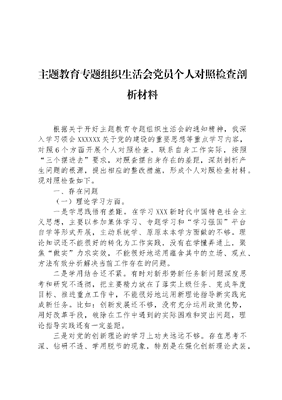 主题教育专题组织生活会党员个人对照检查剖析材料根据关于开好主题教育专题组织生活会的通知精神,我深入学习领会XXXXXX关于党的建设的重要思想等重点学习内容,对照6个方面开展个人对照检查,联系自身工作实际,按照三个摆进去要求,对照查摆自身存在的差距,深刻剖析产生问题的根源,提出相应的整改措施,形成个人对照检查材料。现对照检查如下。一、存在问题(一)理论学习方面。一是学思践悟有差距。在学习XXX新时代中国特色社会主义思想,主要以参加集体学习、专题学习和学习强国平台自学等形式开展,主动系统学、原原本本学方面做的不够。理论知识还不能很好的转化为工作实践,没有在学懂弄通上,聚焦做实力求实效,不能很好地运用蕴含其中的立场、观点、方法有效分析解决当前工作存在的问题。二是学用结合还不紧。有时对新形势新任务新问题深度思考和研究不透彻,把主要精力放在了落实上级任务、完成年度目标、推进重点工作中,不能很好地运用新理论指导新实践完成新任务。比如:创新发展还不够,没有充分运用政策优势,用好改革手段,破除在工作中遇到的实际困难和突出问题,理论指导实践还有一定差距。三是对党的创新理论的学习上功夫远远不够。存在思考不深、钻研不透、学用脱节的现象,特别是在强化创新理论武装,融会贯通、学以致用,指导实践、推动工作上还缺乏深度、广度和力度,存在一开始紧锣密鼓,后来逐渐松懈,碎片式学习、选择性读原著的问题,将学习研讨成果转化为决策,推动解决突出问题、加快发展还不够到位。(二)政治素养方面。一是政治素养还需加强。本人能够牢牢把准政治方向,不断增强四个意识、坚定四个自信。但对照要求反思自身,在时刻对标对表党中央精神把准工作方向、调整工作节奏上做的还不够好,工作中发现的一般性问题背后的政治根源剖析不够,对苗头性倾向性问题背后的政治端倪判断力还需提升。二是政治上不够清醒。有时看得不够清,政治站位低、政治视野窄,准确识变、科学应变、主动求变意识不强。有时把得不够准,政治意识不强,对共产主义缺乏信仰,对中国特色社会主义缺乏信心,精神空虚。有时站得不够稳,在大是大非问题面前摇摆,在形形色色的政治挑衅面前态度不坚决。三是政治能力有差距。落实XXXXXX提出的把握方向把握大势把握全局的能力不足,保持政治定力驾驭政治局面防范政治风险方面还有差距。比如,在当今世界百年未有之大变局中,对西方国家利用技术优势、话语优势和舆论霸权以各种隐秘方式,极力宣扬散布西方普世价值观等错误思潮缺乏高度政治敏锐性和有效应对措施,从政治角度观察、分析和处理复杂问题的时候少,缺乏透过现象看本质的政治判断力、对中央精神融会贯通的政治领悟力和不回避矛盾、不掩盖问题、敢于承担责任的政治执行力。(三)能力本领方面。一是在风险中学习的能力不足。自己在风险预警、风险研判、风险防控的过程中,把坏事变成为好事,把教训变成财富的意识和能力不足,未能及时有效地从风险挑战中学习改进,对于在应对风险中发现和体会到的事物发展的科学性和趋势性规律,没有及时提炼总结成经验,也没有开展经常性的反思、查摆和梳理工作中的风险点,未能把应对风险所形成的经验,有效地变成提高自身认识问题、分析问题、解决问题水平的能力。二是在科学决策能力上有差距。对分管工作中出现的一些新情况和新问题,缺少全面系统的研究,获取决策的重要信息不足,信息不对称,听取意见建议也不够广泛,综合分析,权衡利弊、科学研判得不够及时深入,导致对一些工作的目标、问题、方案、举措、效果、过程未能做到全面掌控,精准精确,在做决策时,未能真正做到透过现象看本质,也没有准确充分地把握规律、看清态势,厘清思路、抓住关键,作出的决策虽然也取得了成效,但距离科学化、高质量的要求,距离行家里手、内行领导的标准,还有存在一定的差距。三是斗争策略不够科学。对斗争所需的法律规范、决策部署、群众诉求和专业知识没有做到深入了解和精准掌握,对社会上、工作中、网络里的杂音,实事求是地讲,有时只有能力制止,而没有能力批驳,斗争的知识体系还不够牢固。斗争的艺术有所欠缺,不善于在复杂多变的斗争中找准规律,把握时机(四)担当作为方面。一是攻坚克难的主动性、积极性不强。存在畏难情绪和求稳怕乱的心理,面对改革转型的新形势、新变化、新要求,存有局限心理,思路不宽、探索不深,固守田园的思维在还不同程度存在。二是贯彻执行上级决策部署不到位。在执行上级决策部署时,对纳入考核的工作、能够立竿见影的工作关注得多、抓得多,而对与考核无关的工作、需要长期坚持的工作,关注得少、用力不足。比如,对纳入考核的XX工作,高度重视、认真部署、定期调度、多次检查,而对志愿服务队伍建设贯彻得不坚决、执行得不到位。三是主动担当作为意识不强。开展工作时,存在以会议贯彻会议、以文件落实文件的情况,认为