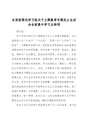 在党组理论学习组关于主题教育专题民主生活会会前集中学习主持词同志们:学习贯彻A新时代中国特色社会主义思想主题教育,对全党既是一次大学习大动员,更是一次大体检大改进。主题教育开展以来,局党组坚决贯彻落实AXXX重要讲话精神和党中央决策部署,牢牢把握学思想、强党性、重实践、建新功的总要求,坚持学思用贯通、知信行统一,自觉运用党的创新理论分析形势、查摆问题、研究对策、推动落实,全力解决人民群众急难愁盼,努力把惠民生、暖民心、顺民意的工作做到群众心坎上。当前,主题教育已进入收尾阶段,开好主题教育专题民主生活会是对学习成效、工作成绩进行全面梳理总结,对今后如何更好开展工作进行深入反思,对班子成员之间、党员干部之间进行互相提醒、增进团结的重要手段。我们要坚持用A新时代中国特色社会主义思想凝心铸魂,深入领悟以学铸魂、以学增智、以学正风、以学促干的丰富内涵和实践要求,统一思想、深化认识,以扎实的理论学习为开好专题民主生活会打牢思想基础,确保主题教育取得实效。参加今天会议的有X党组理论学习中心全体成员,第X纪检监察组组长X同志,各处室负责人列席会议。主题教育领导小组第X指导组同志也到会指导,请大家以热烈掌声表示欢迎。今天会议共有四项议程,一是请局党组X同志领学相关学习内容;二是请部分党组成员作重点交流发言,其他成员作书面交流发言;三是请指导组组长X同志作点评讲话;四是由我作总结讲话,并对开好主题教育专题民主生活会提要求。下面会议依次进行。首先,进行会议第一项议程,请X同志领学相关学习内容,包括AXXX关于主题教育的重要讲话、重要指示精神,《关于新形势下党内政治生活的若干准则》《县以上党和国家机关党员领导干部民主生活会若干规定》等党内法规,以及在主题教育中推动树立和践行正确政绩观等相关要求。请大家认真学习,做好笔记。(学习毕)下面,进行会议第二项议程,请X、XX、XX同志依次作重点交流发言,其他同志作书面交流发言,相关材料已发放到给为手中。(发言毕)下面,进行会议第三项议程,请指导组组长X同志作点评讲话。(点评毕)下面进行会议第四项议程,由我作总结发言,并对开好专题民主生活会提几点要求。自主题教育开展以来,在主题教育第X指导组的悉心指导下,局党组坚持全面系统深入学习贯彻A新时代中国特色社会主义思想,牢牢把握学思想、强党性、重实践、建新功的总要求,以强化理论学习指导发展实践,以深化调查研究推动解决发展难题,扎实开展各项工作,取得了较好的成效。主要有以下几个方面:一是高标准制订学习方案。成立由党组书记任组长的主题教育领导小组,专题研究制订《X学习贯彻A新时代中国特色社会主义思想主题教育实施方案》,统筹业务工作与教育学习、统筹课题研究与调查研究,明确目标要求,细化计划安排,丰富学习方式,层层压实责任,将主题教育与业务工作同谋划、同部署、同落实、同检查,切实推进学习与业务深度融合。二是高要求部署学习任务。专题召开主题教育全体干部职工动员大会,切实把思想和行动统一到党中央决策部署上来,深刻领悟两个确立的决定性意义,增强四个意识、坚定四个自信、做到两个维护。及时购买指定书籍,各部门、各党支部每周组织开展集中学习,每月组织学习交流活动、读书班、专题研讨等多种形式,引导干部职工准确把握主题教育的总要求,系统掌握A新时代中国特色社会主义思想的科学体系,不断夯实政治思想理论根基。三是高标准推进主题教育取得实实在在的成效。不划阶段、不分环节,统筹理论学习、调查研究、推动发展和检视整改,扭住重点任务,压实工作责任,注重统筹兼顾,形成齐抓共管合力,有序有效推动各项工作有机融合、稳步开展。组织成立X个专项调研课题,收集整理本领域难点问题X余个,积极研究对策方法,破难题、促发展、办实事、解民忧。聚焦党建工作、业务工作、党风廉政建设和干部队伍建设方面,深刻剖析,及时整改,切实将主题教育根本任务贯穿科研工作全过程,着力破解长期悬而未决的瓶颈难题,提高主题教育针对性和指导性。开展学习贯彻A新时代中国特色社会主义思想主题教育,是今年党的建设的重大任务。我们要善始善终、慎终如始推进主题教育,扎实做好会前理论学习准备,开好专题民主生活会。下面我提三点意见:第一,抓实理论学习,打牢思想基础,学深悟透A新时代中国特色社会主义思想精髓要义。要深刻认识到,开展主题教育,坚持不懈用A新时代中国特色社会主义思想凝心铸魂,切实加强党的思想建设,是统一全党思想意志行动、始终保持党的强大凝聚力战斗力的必然要求,是推动全党积极担当作为、不断开创事业发展新局面的必然要求,是深入推进全面从严治党、以党的自我革命引领社会革命的必然要求。学深悟透A新时代中国特色社会主义思想的精髓要义,就要深刻把握这一思想的道理学理哲理,做到知其言更知其义、知其然更知其所以然,自觉内化于心、外