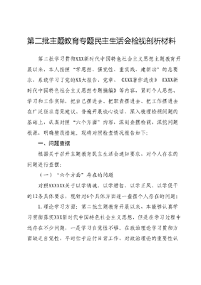 第二批主题教育专题民主生活会检视剖析材料第二批学习贯彻XXX新时代中国特色社会主义思想主题教育开展以来,本人按照学思想、强党性、重实践、建新功的总要求,系统学习了党的XX大报告、党章、《XXX著作选读》《XXX新时代中国特色社会主义思想专题摘编》等内容,紧盯个人思想、学习和工作实际,把自己摆进去、把职责摆进去、把工作摆进去在广泛征求意见建议、普遍开展谈心谈话、深入梳理检视问题的基础上,认真对照六个方面内容,深刻查摆检视,深挖问题根源,明确整改措施。现将对照检查情况报告如下:一、问题查摆根据关于召开主题教育民主生活会通知要求,对个人存在的问题进行查摆:(一)六个方面存在的问题对照XXXXXX关于以学铸魂、以学增智、以学正风、以学促干的12条具体要求,现针对6个具体方面逐一查摆个人存在的问题:1.理论学习方面:第二批主题教育开展以来,本能够认真学习贯彻落实XXX新时代中国特色社会主义思想,但是在学习过程中还存在不少问题,一是学习自觉性不够。在政治理论学习贯彻方面缺乏自觉性,平时忙于应付日常工作,对政治理论的重要性认识不足。有重业务、轻理论的思想,还没有真正认识到扎实的理论基础是政治上坚定的基础,政治判断力、政治领悟力、政治执行力有待提高。认为业务是实的东西,能看得见摸得着,政治理论是虚的东西,看不见摸不着,政治理论水平再高不如实实在在干点事。工作中缺乏系统科学的理论指导,难免出现这样或那样的问题。二是学习深度不够。作为纪委书记,理论学习多是满足于完成规定动作,结合新时期纪检监察工作实际创新学习方式较少,学习党的新理论、新论断存在碎片化现象,深度、广度跟不上新理论的更新速度;对两个确立的理论体系和思想精髓、丰富内涵理解把握得还不够系统,对两个永远在路上的理解还不够深刻,缺乏主动研究思考,还未能精准把握党风廉政建设和反腐败斗争中出现的新特点新变化,在学思践悟、融会贯通上仍存在差距。三是学用结合不好。通过学习,明确从严治党要抓关键少数和管绝大多数相统一,但是不能够很好的将二者区分开来,那些人为关键少数,那些人为绝大多数,也不知道如何去抓这些关键少数和管理绝大多数2.政治素质方面:一是理想信念还不够坚定。总是觉得自己作为一名年轻干部,从事纪检监察工作,政治方面应该是过硬的理想信念应该是坚定的,还没有从坚定理想信念的高度去考虑自己工作存在的困难不足,没有从加强党性锻炼的角度分析自己理想信念方面存在的突出问题,还没能够做到常怀远虑、居安思危一定程度产生了满足懈怠思想,导致自己在行动上找不准方向、盯不准目标,逐渐弱化了战胜困难的信心和决心。二是政治敏锐性不强。作为纪检监察干部,在查处违纪违法典型案件时,往往容易陷入本本主义,不能从思想等理想信念的事业解剖麻雀导致案件警示教育功能未能有效显现。工作中缺乏系统科学的理论指导,难免出现这样或那样的问题。纪检监察机关是政治机关审视问题应该立足政治视角,但作为纪委书记,在查处违纪违法典型案件时,往往容易陷入本本主义,不能从思想等理想信念的事业解剖麻雀,导致案件警示教育功能未能有效显现。三是贯彻党中央决策部署和省委工作要求还不够彻底,服务保障推动高质量发展成效仍不够明显。仍存在对产业发展出现的新情况、新特点把握不准,对权力运行规律认识不够到位等问题,运用所学所思所悟指导工作、解决问题、推动发展的能力还要提升,监督方式仍无法做到与时俱进,发现问题能力仍旧不足,对问题线索处置与上级要求仍存在差距,监督保障执行、促进完善发展作用还需进一步强化。3.能力本领方面:一是新发展理念树的不牢。对新发展理念先导性认识不够,在中国式现代化、五大发展理念的系统性和辩证性的学习上领悟还不够深刻,认为创新、协调、绿色、开放、共享等理念早已经提过,在与工作领域深度结合的空间和契合点的寻找上,还欠缺耐心和定力,在推进事业高质量发展上,贯彻新发展理念还不够深入。二是服务群众意识不够强。对人民就是江山、江山就是人民的重要论断,对全心全意为人民服务的宗旨意识,仍没有真正落到实际行动上。如,在维护参保群众切身利益方面,下气力还不足,没有聚焦群众反映强烈的突出问题,选取小切口来开展专项整治,往往上级安排部署什么就开展什么,导致一些突出问题没有得到及时有效解决。4.担当作为方面:一是抓实抓细斗争精神还有差距。对如何增强分管干部的斗争精神,缺少系统性的思考研究,思想政治工作做得不够细致、不够到位,一些分管干部将斗争精神简单地理解为快对快、硬碰硬,缺少以柔克刚的韧劲和一辈子办成一件事的执着。二是创新突破精神不足。有的面对改革发展任务,不敢啃硬骨头,缺乏攻坚克难的志气、敢闯敢试的锐气、大胆负责的勇气,没有先例的事不敢干,不敢越雷池半步,缺少大刀阔斧,奋力开拓的精神头,有的面对困难和矛盾