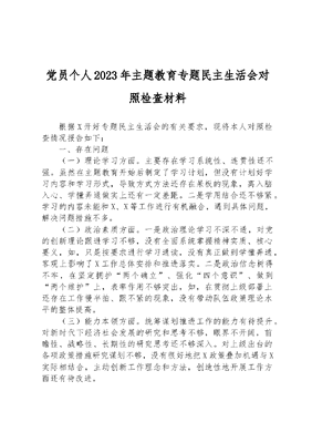 党员个人2023年主题教育专题民主生活会对照检查材料根据X开好专题民主生活会的有关要求,现将本人对照检查情况报告如下:一、存在问题(一)理论学习方面。主要存在学习系统性、连贯性还不强。虽然在主题教育开始后制定了学习计划,但没有计划好学习内容和学习形式,导致方式方法还存在呆板的现象,离入脑入心、学懂弄通做实上还有一定差距。二是学用结合还不够紧。学习的内容未能和X、X等工作进行有机融合,遇到具体问题,解决问题措施不多。(二)政治素质方面。一是政治理论学习不深不透,对党的创新理论跟进学习不够,没有全面系统掌握精神实质、核心要义,如,只是按要求进行学习通读,没有真正做到学懂弄通,客观上影响了X工作总体安排和推进落实。二是政治信念树得不牢,在坚定拥护两个确立、强化四个意识、做到两个维护上,表率作用不够突出,如,在贯彻上级部署上还存在工作慢半拍、跟不紧的现象,没有带动队伍政策理论水平的整体提高。(三)能力本领方面。统筹谋划推进工作的能力有待提升。对新时代下经济社会发展的研究和思考不够,眼界不开阔,前瞻性、战略性、长期性的研究思考还不够深入。对上级出台的各项政策措施研究谋划不够,没有很好地把X政策叠加机遇与X实际相结合,主动创新工作理念和方法,创造性地开展工作方面还有待改进。(四)担当作为方面。干事创业精气神不足,在推进X工作中有时候碰到难题,有绕道走,当甩手掌柜的想法。党员的先锋模范带头作用没有充分发挥,没能用党员的标准要求自己,在履行党员的责任和义务方面,坚定理想信念,尽职尽责为民办实事方面做得还不够。(五)工作作风方面。一是创新进取意识不够强,满足于现有的成绩,固守原有的做法,没有开拓创新地开展工作。二是服务群众思路方法不够新。只停留在群众提出需求,按需求去满足,而不能主动换位思考,超前谋划。三是实际调查研究不够深。深入基层和百姓当中搞调查研究比较少,导致X、X工作的针对性和实效性不强。(六)廉洁自律方面。一是对纪律执行纠治力度还不够大。工作中,有时认为只要把握住大的方向不偏离就可以,对分管部门和联系乡镇的党员干部强调工作纪律、工作要求多,在纪律执行和专题性学习上约束不够严格。二是表率作用发挥的还不够。有时潜意识认为自己受党教育多年,组织纪律观念较强,有一定的政治觉悟,只要工作生活中坚守党纪国法和道德底线就合格了,缺乏站在表率和模范的高度去自觉进一步提升自我。二、产生问题的原因分析(一)理论学习认识不足。对理论学习的重要性认识不够,尤其是对XXX新时代中国特色社会主义思想的学习紧迫感不强,新理论新精神的学习经常受各种事务性工作影响,导致新理论学习不透彻,掌握不全面,应用不够准确。集体组织学习多,个人自学少,对新理论新政策的学习抓得不紧不实、掌握不多,导致自身理论水平跟不时代和工作的要求。(二)理想信念不够坚定。作为一名党员干部,能够坚定拥护两个确立,树牢四个意识,坚决做到两个维护,认真贯彻执行党中央的各项方针政策,在大是大非面前头脑清醒,旗帜鲜明,立场坚定,但在一些具体事情上自我要求还不够高。面对新形势新变化,没有持续不断地加强政治理论、道德情操、思想文化和专业知识等修养充电,放松了对党性锻炼的要求和保持党员先进性纯洁性的追求,直接影响了自己思想的进步。(三)工作作风不够扎实。有些工作浮于表面,流于形式,不够精益求精,处理问题有畏难情绪,瞻前顾后、患得患失,忽视了工作的积极性、主动性、创造性,降低了工作标准。(四)党风廉政建设责任意识不强。对第一责任人的责任认识不清,平时有重业务工作、轻党风廉政建设工作的现象,对党员干部尤其是自身在党风廉政建设方面的学习教育不深刻不系统,对机关党风廉政体制机制方面的建设抓的不到位。三、今后的努力方向和改进措施(一)强化创新理论学习。下一步学习要有目标、有计划,合理安排学习内容和学习时间。严格按照支部、党小组和个人制定的学习计划,完成学习任务,要及时跟进党的创新理论,做到常学常新。做到学习不流于形式,做到活学活用,融汇贯通。加强理论学习的同时学习好业务知识,开拓视野,拓展知识面,更好指导和促进工作。(二)坚定理想信念。我将把坚定理想信念作为党内政治生活的首要任务,坚定拥护两个确立,牢固树立四个意识,坚定四个自信,做到两个维护,勇于担当作为,认真学习领会贯彻XXX新时代中国特色社会主义思想,用新思想新战略武装头脑、指导实践、推动工作。增强政治意识,坚定政治立场,坚持围绕中心,服务大局,把中心工作放在X的决策部署中去谋划,围绕X去谋划、落实各项工作。坚定道路自信,以是否符合基本路线来检验自己的工作,在工作中要有敢打,敢拼,敢闯的精神。坚定理论自信,深入学习探讨马克思主义理论,自觉按照马克思主义的世界观和方法,结合实际情况论分析问题、研究问题、解决问题。坚定