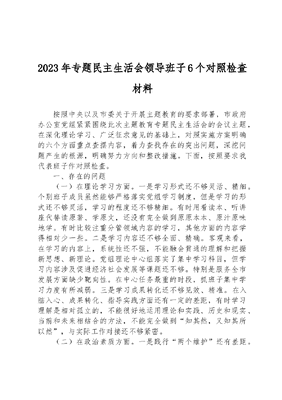 2023年专题民主生活会领导班子6个对照检查材料按照中央以及市委关于开展主题教育的要求部署,市政府办公室党组紧紧围绕此次主题教育专题民主生活会的会议主题,在深化理论学习、广泛征求意见的基础上,对照实施方案明确的六个方面重点查摆内容,着力查找存在的突出问题,深挖问题产生的根源,明确努力方向和整改措施。下面,按照要求我代表班子作对照检查。一、存在的问题(一)在理论学习方面。一是学习形式还不够灵活、精细。个别班子成员虽然能够严格落实党组学习制度,但是学习的形式还不够灵活,学习的程度还不够精细。有时用看读本、听讲座代替读原著、学原文,还没有完全做到原原本本、原汁原味地学。有时比较注重分管领域内容的学习,其他方面的内容学得相对少一些。二是学习内容还不够全面、精确。客观来看,在学习的内容上,系统性还不强,不能融会贯通的理解和把握新思想、新理论。党组理论中心组落实了集中学习科目,但学习内容涉及促进经济社会发展等课题还不够。特别是服务全市发展方面缺少靶向性。在中心任务最重的时段,抓班子集中学习力度有所减弱。三是学习成果转化还不够见效、精准。在入脑入心、成果转化、指导实践方面还有一定的差距,有时学习理解是相对孤立的,不能很好地运用理论和实践、历史和现实、当前和未来相结合的方法,不能完全做到知其然,又知其所以然,与实际工作对接还不够紧密。(二)在政治素质方面。一是践行两个维护还有差距。主要表现在个别班子成员还不善于在大局中找定位、定目标,不能从政治高度、大局角度综合考虑问题,如,在综合办公、贯通协调、上传下达等过程中,与市委市政府战略部署结合不够紧密,在政治素养方面还不够高,政治判断力、政治领悟力、政治执行力不够强,缺乏政治的敏锐性和洞察力。二是政治能力还有所欠缺。主要表现个别班子成员在运用政治眼光观察和分析问题的能力不够强,从综合办公中体现政治导向、政治要求做得还不到位,对标增强八种本领、提高七种能力要求还有差距。如,在深入分析办公运转、上下联动、办文办会、事务管理等方面产生问题原因上还存在工作研究不透、规律把握不准的问题,透过业务工作发现政治问题端倪的能力还需提升。三是谋划党建工作思路不够宽阔。个别班子成员在谋划部署党建工作过程中,缺少对于党建工作前瞻性的谋划,虽然也召开了多次会议研究党建工作,但是深入系统研究的时候不多,把一些新的理论、新的举措运用到工作中来效果不明显,对于如何丰富党建工作的载体、创新党建工作的举措没有进行深度思考,仅满足于常规动作的开展,对于结合市政府办公室工作的实际没有及时推陈出新。(三)在能力本领方面。一是思想解放不深入。对新形势下市政府办公室工作如何守正创新、走深做实缺乏深度思考,透过现象看本质的能力有待进一步提高,导致学习领会上级政策文件精神还不够精准,思想认识与新时代全市发展要求还有一定差距。站在综合办公职能作用的发挥以及全市经济社会发展大局去思考问题的高度不够,对改革突破的方向和着力点找得不准,从而影响了工作质效。二是能力不济不会为。部分班子成员不重视学习,学习不深不透,不注重提升自身综合素质,导致存在干部履职能力不足、本领恐慌问题,没有干一行、钻一行、精一行的恒心毅力,对自己负责工作必需的业务知识,浅尝辄止,满足于一知半解,工作不求过得硬、只求过得去。有时,面对纷繁复杂的工作理不清头绪,找不到解决问题、实现目标的路径。把市政府办公室工作成效至于全国的坐标系内进行衡量做得还不够到位,对于其他市市先进的经验做法缺少积极借鉴、消纳吸收的主动性。三是业务培养方法不多。当前,我室干部存在能力发展不均衡、不全面的问题,这说明对加强干部队伍专业能力建设的长期性、艰巨性认识还不够深刻,谋划制定提升干部综合能力的方法还不够具有针对性,载体不够丰富,效果不够明显,导致面对新形势新任务时,应对风险挑战的本领还有待进一步提升,缺乏及时发现和解决自身存在问题的意识和能力。比如,在运用网络手段提升办公室文秘人员文稿写作水平上,室里不少同志要求办理年度会员一事,因各种原因,一直未落实。(四)在担当作为方面。一是主动创新意识不够强。部分班子成员在实际工作中创新意识不强,视野不够开阔,不能跳出小圈子看问题,不能站在全局谋思路,有的面对实际困难和问题拿不出新办法新举措,凡事找依据、等上面、看外边,文件没说的不敢说、以前没干的不敢干。二是善于斗争本领还不够强。主要表现在面对新时代、新矛盾、新目标、新部署,班子成员还没有完全适应,未能做到把个人的理想信念、价值追求充分融入到工作事业中。面对各项艰巨的任务,缺乏敢于斗争的勇气和舍我其谁的魄力,缺乏以钉钉子精神抓落实的韧劲。三是攻坚克难缺少务实管用招法。当前提升综合办公质效作为我们工作的重中之重,难中之难,党组班子成员对于督办落实这块硬骨头还没有完全啃下来,在推动重大事项