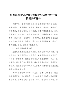 在2023年主题教育专题民主生活会六个方面检视剖析材料根据中央,省委和XXX召开XXX主题教育专题民主生活会的通知要求,紧紧围绕学思想、强党性、重实践、建新功的总要求,在学习讲话、研讨交流、调查研究的基础上,采取征询意见、谈心交心、自我反思等方式,对照理论学习、政治素质、能力本领、担当作为、工作作风、廉洁自律6个方面深入剖析自身不足和工作短板,进一步认清了问题差距、理清了整改方向。下面,由我做个检视剖析。一、存在问题和具体表现为把这次年度民主生活会开好,积极与班子成员交流,消除了大家查浅了怕这次过不了关、查深了怕今后难以过关批轻了影响集体、批重了影响自己等思想顾虑,校正了认识误区。通过自己查、领导指、群众提和谈心谈话、发放征求意见表、设立意见箱等方式对个人存在的问题进行了深度查找,共收集意见建议18条。(一)在理论学习方面。一是在学懂上有差距。我虽然能够积极通过中心组学习、个人自学等方式加强对党的创新理论学习,但是学习还不够全面、深入,学习只浮在表面,学习方法单一,精力不够集中,常常以工作忙、没时间为借口放松了学习要求,对XXX思想的核心要义、丰富内涵、精神实质理解还不够。二是在弄通上有差距。作为XXXX,虽然对XXX思想进行了学习和研读,但XXX,且初次接触XXX,对XX管理工作了解相对较少,平时把主要精力放在经营管理工作上,存在一定的重工作、轻学习的现象。三是在做实上有差距。由于XXXX特点,XXX主要依赖XXX,开展工作更多的是拼人缘、靠积累、凭经验;对标XXX、XXX,在创新XXX、推动XXX度、xxxx等方面做得还不够,理论学习和实践运用结合不够紧密;解决老旧遗留问题、重大问题时,思维不够开阔,招数办法还不多,没有体现新思路。(二)在思想政治方面。一是政治敏锐性不强。在政治立场上是坚定的,但对一些政治敏感性、坚定性很强的问题,没有很好的讲从政治的高度去认识和把握实际问题,对社会上一些错误言论辨别力不强,对社会上、网络上出现的一些错误言论,不能及时给予制止,对歪风邪气斗争不够。二是贯彻执行不到位。对一些重要工作、重大事件,缺乏主动性、预见性,在贯彻落实中央,省委和XXXX决策部署时,对标执行不够到位不够精准,安排部署的多,缺乏抓落实的实招,工作标准不够高、要求不严,特别是在落实中碰到困难时,积极主动协调、想办法克服的少。三是大局观念不够强。没有正确处理好民主与集中的关系,对民主与集中的统一性、整体性把握不准,有时片面地、过分地强调民主,忽视集中领导的主导地位。研究讨论问题、发表意见事先沟通少,容易出现因意见不一致产生矛盾、影响团结;有时对自己分管的工作不善于提出见解,多数是没意见,议事决策民主氛围不浓。(三)在能力本领方面。一是聚焦重点抓落实的狠劲韧劲不够。在解决XXXX、XXXX/开发新的经济增点以及解决XXXX,XXXX、XXX,XXXXX,XXX等方面上推进不够快,力度还不够大,硬的措施和实的招数不够多。二是自我约束不严。自觉接受政治纪律、组织纪律、廉洁纪律、生活纪律的标准还不够高,没有自觉用党的政治纪律、组织纪律、廉洁纪律、生活纪律严格要求自已,规范自己方行,存在被动接受监督多,主动接受监督少,八小时内接受监督多,八小时外接受监督少的现象。三是创新精神还有待加强。XXXX提出争取XXX的要求的还有差距,带领班子在积极挖潜增效、提高创收能力上力度还不够大、办法还不够多、措施还不够明显。在XXXX问题上下功夫、使气力气还不够足。在解决制约XXX发展的人才队伍建设上办法还不够灵活,人才流失问题还没有得到根本性改观,对XXX发展排忧解难思谋不够多、想得不够远。(四)在担当作为方面。一是工作标杆还有待提高。在任务重、压力大的时候,首先想到是怎么样尽快完成工作任务,存在着以应付求过关的想法,工作计划做的不够及时和周密,不能很好的指导工作,工作完成后思考总结不到位,导致工作成效不明显。只求过的去,不能从尽善尽美、时时处处争一流的标准上去把握。二是创新精神还有待加强。在具体工作中,开展工作的方式创新不够,对上级安排的工作虽然也保质保量的完成了,但是没有新意,对xxx经济运行和管理存在专业知识缺乏,管理手段单一,来xxx时间较短,对xxx日常经营和管理没有形成完整的工作思路和打算。三是主动作为不够。在具体工作中,开展工作的方式过于保守,力度上不够,思路创新不够。对于上级安排部署的工作按部就班,没有新意,不能够做到创造性的完成工作。特别是安全维稳、服务保障等工作方面,下的功夫不够。(五)在工作作风方面。一是宗旨意识不牢固。在抓工作、谋发展时,考虑短期效益多,急于出成绩、走捷径,站在群众立场思考少,以人民为中心思想不够牢,倾听群众的意见和呼声不够多,对基层情况的了解和把握也不够全面准确。二