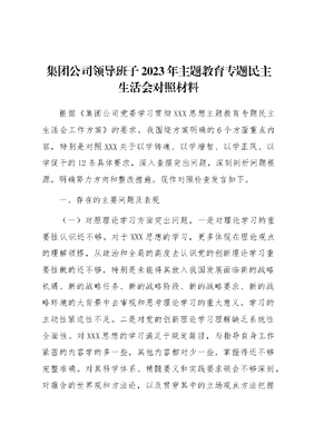 集团公司领导班子2023年主题教育专题民主生活会对照材料根据《集团公司党委学习贯彻XXX思想主题教育专题民主生活会工作方案》的要求,我围绕方案明确的6个方面重点内容,特别是对照XXX关于以学铸魂、以学增智、以学正风、以学促干的12条具体要求,深入查摆突出问题,深刻剖析问题根源,明确努力方向和整改措施。现作对照检查发言如下。一、存在的主要问题及表现(一)对照理论学习方面突出问题。一是对理论学习的重要性认识还不够。对于XXX思想的学习,更多体现在理论观点的理解领悟,从政治和全局的高度去认识党的创新理论学习重要性做的还不够,特别是未能将其放入我国发展面临新的战略机遇、新的战略任务、新的战略阶段、新的战略要求、新的战略环境的大背景中去审视和思考理论学习的重大意义,学习的主动性紧迫性不足。二是对党的创新理论学习理解缺乏系统性全面性。对XXX思想的学习满足于规定篇目,与指导自身工作紧密的内容学的多一些,其他内容相对少一些,掌握得还不够完整准确。对其科学体系、精髓要义和实践要求领会不够深刻,对蕴含的世界观和方法论,以及贯穿其中的立场观点方法把握得还不够全面,学习质效打了折扣。三是加强理论学习成果转化还不够。把XXX思想中的世界观和方法论与推动集团公司高质量发展深度融合还不够到位,从政治和全局高度观察形势、分析问题的能力水平有待加强,主动服务和融入全市新发展格局,围绕贯彻落实市委市政府战略决策部署,运用党的最新理论指导推动水务事业创新发展结合得不够。(二)对照政治素质方面突出问题。一是政治能力还要不断提高。胸怀国之大者,心系民之大计,立足全局、放眼长远,善于从政治和大局上分析问题、解决问题的政治能力有待进一步提高,特别是在观察分析形势时把握政治方向、谋划推动工作时落实政治要求、处理解决问题时防范政治风险上还要下硬功夫,需要持续不断提升政治判断力、政治领悟力、政治执行力。二是政治敏感度还要不断增强。还不善于用马克思主义的政治眼光和对党对人民高度负责的精神,敏锐洞察和鉴别社会经济、政治和思想文化等领域的各种现象,特别是面对当前各种社会思潮不断交织,集团干部职工接受信息的渠道多,容易出现分不清好坏、辨不清是非,随波逐流、迷失航向的现实情况,还不能完全透过现象,抓住本质,洞察其可能带来的社会政治后果,加强正面宣传引导,做到防微杜渐。三是政治担当还要不断强化。虽然能够紧紧围绕全市发展大局,坚决贯彻落实市委市政府的部署要求,创新性抓好工作落实,创造性推动事业发展,但有时在具体工作中,从集团自身发展角度、从维护企业利益方面考虑问题比较多。比如,对企业和群众关注度高的急难愁盼问题,也努力加以解决,但思想上认为集团是公益类企业,自身财力有限,资金投入需要依赖财政补贴,解决问题的力度、动力不足,没有完全扛起应尽的责任,体现出应有担当。(三)对照能力本领方面突出问题。一是推动高质量发展的能力还要增强。有完整、准确、全面贯彻新发展理念的思想自觉和行动自觉,但对丰富的理论内涵和重大实践意义理解掌握的还不够系统深入,特别将创新、协调、绿色、开放、共享重要思想观点融会贯通,有机结合,充分运用到指导实践,推动发展上,在保障城市安全供水、加快供排一体发展、推动新兴产业布局,持续提升服务我市新发展格局的战略能力等方面需提升。二是破解服务群众难题的能力还要增强。在打通为民服务最后一公里,全面提升服务质量方面还有差距。比如,在员工上门进行用水维修时,缺乏服务礼仪、服务用语、服务流程的规范,特别是一些戴工牌、穿鞋套等服务细节上抓得不实不紧,影响了市民百姓在用水服务方面优质体验感,对树立企业形象也不利。三是防范化解风险挑战的能力还要增强。比如,当前经过3年疫情冲击,国内经济尚处在缓慢恢复阶段,在财政补贴资金收紧的情况下,集团维持生产运营、加强投资建设等方面资金压力逐步增大,还要在这方面多花心思研究,尤其是如何确保资金合理使用,如何做到有效预警监管等方面,需要拿出具体招法和举措,坚决防范企业发生金融风险,确保集团经济健康平稳发展。(四)对照担当作为方面突出问题。一是斗争精神有所弱化。有时过多考虑风险影响,有瞻前顾后、有求稳怕乱的思想,对一些历史遗留问题、难啃的老大难问题缺乏敢于担当的勇气和善于斗争的魄力。比如,在处理应收账款,解决资金紧张的问题上,在年初制定考核方案时,加大了各企业的欠款清收工作的考核权重,也积极解决一些清欠难度比较大问题,但成效还不到预期效果。二是改革创新拼劲不足。在集团深化综合改革过程中,存在按部就班、四平八稳的想法,想问题、做决策还有思想顾虑。比如,推动三项制度改革方面,如何结合集团实际,就打破干部铁饭碗,实现能上能下方面缺乏新意,习惯于用传统思维、过往经验解决新问题,缺乏探索创新的主动性自觉性。三是政绩观树立和践行得不够。对树什么样的政绩