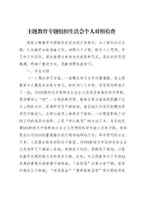 主题教育专题组织生活会个人对照检查根据主题教育专题组织生活会的文件要求,本人紧扣会议主题,扎实做好会前准备工作,对照六个方面,联系个人思想、学习和工作实际,深刻查摆自身存在的差距和不足,深刻剖析思想根源,明确了整改方向。现做对照检查如下:一、存在问题(一)理论学习方面。一是理论学习水平还需增强。在主题教育中主要是参加集中学习,挤时间个人自学、逐字逐句研读少了一些,对XXX新时代中国特色社会主义思想没有做到常学常新、常补精神之钙,对党的新思想、新路径等方面深度把握不足对上级的方针、政策研究还不够透彻,结合XX工作实际的理性思考还不够深入,在学以致用上做得还不够好,一定程度影响了对XX工作的深层次指导。二是学以致用的办法不多。在系统把握XXX新时代中国特色社会主义思想的科学内涵上还有欠缺,特别是在运用XXXXXX重要指示批示精神指导XX工作,科学管用的方法不多。三是理论联系实际还不紧密。对XXX新时代中国特色社会主义思想学习不够深入系统,领悟还不到位,理解还不透彻,以理论指导实践的能力依然有些欠缺。比如,对主题教育关于支持XX发展的重要论述把握不够精准,放管服改革力度不够,营商环境优化不彻底,信息孤岛重审批轻监管等问题依然存在。(二)政治素养方面。一是政治素养站位不够高的问题。作为一名党员领导干部,自觉主动向党中央、向XXXXXX看齐,坚决维护党中央权威。对中央的大政方针衷心拥护,对省委和市委的重要决策,第一时间抓学习、抓贯彻、抓落实。但从严对照,对一些具体政策站在大局的角度去思考、理解还不够自觉,比较习惯从自己所处的地方实际去看问题。有时由于领会理解方面还不够到位,导致谋划工作、考虑问题、推动落实有所偏差,执行中有时没有达到应有的效果。二是在科学认知和把握两个确立上有差距。未能完全从两个确立是引领党和人民在前进道路上应对风险挑战的政治法宝,是应对国内、国际复杂局势和风险挑战的制胜法宝,这两个高度上科学认知和宏观把握两个确立的决定性意义,有时把学习和体悟的重点聚焦在文字和思想认识层面上,没有全面地将两个确立放到统筹两个大局的时代背景与根本要求的大形势下进行把握和考量,对于风险挑战越严峻,使命任务越艰巨,就越需要领导核心掌舵领航,越需要科学理论指引方向的重要意义体悟不够深刻,使自己在把两个确立内化为政治信仰、自觉追求、行动纲领时,没有实现快人一拍和事半功倍。三是政治能力不够强。缺少认清和把握世界、国家以及地方发展形势的自觉性和积极性,主观上认为只要干好自己的本职工作就可以了,就是讲政治了。因此,在如何增强自身政治能力方面谋划不够多,也不够积极主动,透过现象看本质的方法和本领提升不快,在把握大势防范政治风险的政治大背景下,缺少草摇叶响知鹿过、松风一起知虎来、一叶易色而知天下秋见微知著的政治能力。(三)能力本领方面。一是创新意识欠缺。没有充分发挥主观能动性,守业意识强,但创新发展意识不够,局限于上级布置什么做什么,有时产生的新想法也只是停留于心动而无行动的状态。对XX工作的长远发展出谋划策不够,不敢打破原有框框,求稳怕难,与群众的期望还有较大差距。二是领导能力和知识水平需要进一步提高。虽然自己平时注重把理论学习与XX的实际相结合,积极探索新形势下做好各项工作的新方法、新思路,努力追求工作的创造性和实效性。但是对照要求,有时忙于工作和各种事务,仍存在以干代学、以忙挤学的现象,理论学习还不够深入系统,特别是对新理论、新知识、新技能的学习还不够,理论创新、制度创新、实践创新不足。三是创新方法破解矛盾问题不够在工作中创新理念、创新意识不强,面对新情况、新问题还存在依靠老办法、老经验的倾向。在处理重大风险问题上,自觉运用新思想、新手段创造性破解突出矛盾和问题的方法不多。比如在做好XX工作中监督方法单一、针对性不强,监督靶向成效不明显(四)担当作为方面。一是落实上级决策部署有偏差。对一些上面看得重、抓得紧、来得快的工作落实得快一些,相对而言其他工作稍微推进得慢一些,工作出现不平衡,特别是一些涉及利益调整、影响面广的敏感问题,有时会行动慢些、抓得松些。二是大局观念不强。有时对上级重大决策部署把握不全面、理解不深刻、执行无力度、落实不到位,在结合实际创新上不用心、不扎实,工作中随意性大,东一榔头西一棒槌,使决策的意图难以实现,执行的效果大打折扣。三是主动担当、积极进取的态度不够坚决。思想上求稳有余、进取不足,特别是近年来持续强化XX工作,取得一些成绩之后,有时产生了自满情绪,前进动力有所减退,争创一流的斗志有所淡化。在面对急难险重任务时习惯讲客观、找理由,缺乏迎头赶上、克难攻坚,敢于啃硬骨头的决心信心,缺少事争一流的勇气和担当。对一些重点工作难度大的工作,不愿积极主动承担,缺乏紧