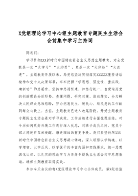 X党组理论学习中心组主题教育专题民主生活会会前集中学习主持词同志们:学习贯彻XXX新时代中国特色社会主义思想主题教育,对全党既是一次大学习大动员,更是一次大体检大改进。主题教育开展以来,局党组坚决贯彻落实XXXXXX重要讲话精神和党中央决策部署,牢牢把握学思想、强党性、重实践、建新功的总要求,坚持学思用贯通、知信行统一,自觉运用党的创新理论分析形势、查摆问题、研究对策、推动落实,全力解决人民群众急难愁盼,努力把惠民生、暖民心、顺民意的工作做到群众心坎上。当前,主题教育已进入收尾阶段,开好主题教育专题民主生活会是对学习成效、工作成绩进行全面梳理总结,对今后如何更好开展工作进行深入反思,对班子成员之间、党员干部之间进行互相提醒、增进团结的重要手段。我们要坚持用XXX新时代中国特色社会主义思想凝心铸魂,深入领悟以学铸魂、以学增智、以学正风、以学促干的丰富内涵和实践要求,统一思想深化认识,以扎实的理论学习为开好专题民主生活会打牢思想基础,确保主题教育取得实效。参加今天会议的有X党组理论学习中心全体成员,第X纪检监察组组长X同志,各处室负责人列席会议。主题教育领导小组第X指导组同志也到会指导,请大家以热烈掌声表示欢迎。今天会议共有四项议程,一是请局党组X同志领学相关学习内容;二是请部分党组成员作重点交流发言,其他成员作书面交流发言;三是请指导组组长X同志作点评讲话;四是由我作总结讲话并对开好主题教育专题民主生活会提要求。下面会议依次进行。首先,进行会议第一项议程,请X同志领学相关学习内容,包括XXXXXX关于主题教育的重要讲话、重要指示精神,《关于新形势下党内政治生活的若干准则》《县以上党和国家机关党员领导干部民主生活会若干规定》等党内法规,以及在主题教育中推动树立和践行正确政绩观等相关要求。请大家认真学习,做好笔记(学习毕)下面,进行会议第二项议程,请X、XX、XX同志依次作重点交流发言,其他同志作书面交流发言,相关材料已发放到给为手中(发言毕)下面,进行会议第三项议程,请指导组组长X同志作点评讲话(点评毕)下面进行会议第四项议程,由我作总结发言,并对开好专题民主生活会提几点要求。自主题教育开展以来,在主题教育第X指导组的悉心指导下,局党组坚持全面系统深入学习贯彻XXX新时代中国特色社会主义思想,牢牢把握学思想、强党性、重实践、建新功的总要求,以强化理论学习指导发展实践,以深化调查研究推动解决发展难题,扎实开展各项工作,取得了较好的成效。主要有以下几个方面:一是高标准制订学习方案。成立由党组书记任组长的主题教育领导小组,专题研究制订《X学习贯彻XXX新时代中国特色社会主义思想主题教育实施方案》,统筹业务工作与教育学习、统筹课题研究与调查研究,明确目标要求,细化计划安排,丰富学习方式,层层压实责任,将主题教育与业务工作同谋划、同部署、同落实、同检查,切实推进学习与业务深度融合。二是高要求部署学习任务。专题召开主题教育全体干部职工动员大会,切实把思想和行动统一到党中央决策部署上来,深刻领悟两个确立的决定性意义,增强四个意识、坚定四个自信、做到两个维护。及时购买指定书籍,各部门、各党支部每周组织开展集中学习,每月组织学习交流活动、读书班、专题研讨等多种形式,引导干部职工准确把握主题教育的总要求,系统掌握XXX新时代中国特色社会主义思想的科学体系,不断夯实政治思想理论根基。三是高标准推进主题教育取得实实在在的成效。不划阶段、不分环节,统筹理论学习、调查研究、推动发展和检视整改,扭住重点任务,压实工作责任,注重统筹兼顾,形成齐抓共管合力,有序有效推动各项工作有机融合、稳步开展。组织成立X个专项调研课题,收集整理本领域难点问题X余个,积极研究对策方法,破难题、促发展、办实事、解民忧。聚焦党建工作、业务工作、党风廉政建设和干部队伍建设方面,深刻剖析,及时整改,切实将主题教育根本任务贯穿科研工作全过程,着力破解长期悬而未决的瓶颈难题,提高主题教育针对性和指导性。开展学习贯彻XXX新时代中国特色社会主义思想主题教育,是今年党的建设的重大任务。我们要善始善终、慎终如始推进主题教育,扎实做好会前理论学习准备,开好专题民主生活会。下面我提三点意见:第一,抓实理论学习,打牢思想基础,学深悟透XXX新时代中国特色社会主义思想精髓要义。要深刻认识到,开展主题教育,坚持不懈用XXX新时代中国特色社会主义思想凝心铸魂,切实加强党的思想建设,是统一全党思想意志行动、始终保持党的强大凝聚力战斗力的必然要求,是推动全党积极担当作为、不断开创事业发展新局面的必然要求,是深入推进全面从严治党、以党的自我革命引领社会革命的必然要求。学深悟透XXX新时代中国特色社会主义思想的精髓要义,就要深刻把握这一思想的道理学理哲理做到知其言更知其义、知其