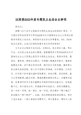 XX党委2023年度专题民主生活会主持词同志们:按照《关于召开主题教育专题民主生活会的通知》要求,今天我们召开XX党委学习贯彻XXX新时代中国特色社会主义思想主题教育专题民主生活会,局党组对此次会议非常重视,XXX、XXX亲临会议指导,让我们以热烈的掌声表示欢迎和感谢!今天会议应到班子成员X名,实到X名,符合规定人数,可以开会。这次民主生活会的主题是:紧紧围绕学习贯彻XXX新时代中国特色社会主义思想主题召开专题民主生活会,聚焦学思想、强党性、重实践、建新功总要求,对照凝心铸魂筑牢根本、锤炼品格强化忠诚、实干担当促进发展、践行宗旨为民造福、廉洁奉公树立新风具体目标,深入学习领悟以学铸魂、以学增智、以学正风、以学促干的丰富内涵和实践要求,检视问题、深刻剖析,着力从思想根源上解决问题。精准把握发扬党内民主、加强党内监督、依靠领导班子自身力量解决矛盾和问题的功能定位,检视差距不足,进行党性分析,开展批评和自我批评,抓好问题整改,进一步统一思想、统一意志、统一行动,坚定拥护两个确立坚决做到两个维护。会前,我们按照局党组通知要求,进行了充分准备。一是认真组织专题学习。通过党委会、理论中心组学习会、个人自学等形式认真组织开展了专题学习,认真学习领会XXXXXX关于党的建设的重要思想,学习XXXXXX关于严肃党内政治生活的重要讲话和重要指示批示精神,学习XXXXXX关于以学铸魂、以学增智、以学正风、以学促干等重要论述,学习XXXXXX关于XXX工作的重要讲话和重要指示批示精神,学习党章、新形势下党内政治生活若干准则、县以上党和国家机关党员领导干部民主生活会若干规定等党内法规,进一步统一思想、深化认识,打牢开好民主生活会的思想基础。二是积极开展谈心交流。党委正副书记、班子成员之间、班子成员与分管处室负责人、班子成员与组织关系所在支部党员代表之间进行了面对面、一对一的谈心交流,虚心听取意见建议。三是深入查摆剖析问题。围绕6个方面重点剖析内容和反面典型案例,我们坚持真刀真枪,见筋见骨,严肃认真撰写班子和个人对照检查材料,反复修改,数易其稿,努力做到查摆问题深刻、分析根源准确、整改措施具体。为确保这次民主生活会开出质量、开出实效,我提两点建议:一是自我批评要开门见山、直奔主题,不谈成绩、只讲问题;二是相互批评要开诚布公、不遮不掩,实事求是地提出批评意见,帮助分析原因,提出改进建议。下面,我们进行第一项议程,请XX同志通报2022年度专题民主生活会整改落实情况。………………下面进行第二项议程,我代表XX党委作班子剖析。………………以上对照检查材料已在会前送班子成员审阅,征求过大家的意见,XX党委会也专门进行了审议。大家看看还有没有什么补充………………下面进行第四项议程,开展批评与自我批评。党委班子成员逐个进行剖析发言,开展批评和自我批评。每名同志发言后,其他同志对其进行批评,提出意见和建议,进行表态发言。下面按照我、XX、XX、XX、XX、XX、XX的顺序依次进行剖析。时间关系大家的整改措施选取纲目式、重点性的工作进行汇报。首先,我带个头,作自我剖析。(自我批评结束后)我的发言结束,对于没有谈到或者谈得不深不透的地方,请同志们批评指正。………………(各委员批评结束后)感谢同志们对我的批评,我一定虚心接受,并在今后的工作中坚决加以改正。下面请XX同志发言。………………(自我批评结束后)我对XX同志的意见是:······(其他委员开展批评)……下面请XX同志发言。………………(自我批评结束后)我对XX同志的意见是:······(其他委员开展批评)……下面请XX同志发言。………………(自我批评结束后)我对XX同志的意见是:······(其他委员开展批评)……下面请XX同志发言。………………(自我批评结束后)我对XX同志的意见是:······(其他委员开展批评)……下面请XX同志发言。………………(自我批评结束后)我对XX同志的意见是:······(其他委员开展批评)……下面请XX同志发言。………………(自我批评结束后)我对XX同志的意见是:······(其他委员开展批评)……………………(XX同志表态后)其他同志是否还有补充意见?没有,好。刚才,大家进行了自我剖析和相互批评,彼此之间都能开诚布公、敞开心扉、直奔主题,比较好的达到了交流思想、增进团结的目的。民主生活制度是我们党的传家宝,是自我净化、自我完善、自我革新、自我提高的锐利武器。我们每参加一次会议,都是一次检视心灵、洗涤灵魂的过程。希望大家珍惜这次难得的机会,真正通过参加这次会议,进一步转变观念、转变思路、转变作风。下步,一要虚心接受。同志们的批评意见,都是抱着对班子、对同志关心负责的态度提出的,我们要认真对待消化,积极研究解决。二要彻底整改。大家自我剖析和相互批评中指出的问题,要分门别类,逐