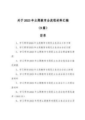 关于2023年主题教育全流程材料汇编(9篇)目录1.学习贯彻2023年主题教育专题民主生活会工作方案2.学习贯彻2023年主题教育专题民主生活会会议议程3.学习贯彻2023年主题教育专题民主生活会筹备情况通报4.学习贯彻2023年主题教育专题民主生活会意见征求情况通报5.学习贯彻2023年主题教育专题民主生活会会议主持词6.学习贯彻2023年主题教育专题民主生活会班子对照检查材料7.学习贯彻2023年主题教育专题民主生活会个人对照检查材料8.学习贯彻2023年主题教育专题民主生活会批评意见清单(1841条)9.学习贯彻2023年思想主题教育专题民主生活会会议召开情况通报学习贯彻XXX思想主题教育专题民主生活会工作方案根据学习贯彻XXX思想主题教育办公室部署要求,按照《关于开好学习贯彻XXX思想主题教育专题民主生活会的通知》安排,结合实际,现就召开专题民主生活会提出如下方案。一、会议主题县处级以上党员领导干部要根据XXX在学习贯彻XXX思想主题教育会议上的重要讲话精神和《县以上党和国家机关党员领导干部民主生活会若干规定》要求,按照主题教育有关规定,此次民主生活会以坚持不懈用XXX思想凝心铸魂,切实加强党的思想建设,对于推动全党更加深刻领悟两个确立的决定性意义,更加自觉增强四个意识、坚定四个自信、做到两个维护,始终在思想上政治上行动上同以XXX同志为核心的党中央保持高度一致。二、对照检查内容要聚焦民主生活会主题,围绕学思想、强党性、重实践建新功的要求,把自己摆进去、把职责摆进去、把工作摆进去,重点从以下6个方面进行对照检查。(一)对照理论学习方面突出问题。(二)对照政治素质方面突出问题。(三)对照能力本领方面突出问题。(四)对照担当作为方面突出问题。(五)对照工作作风方面突出问题。(六)对照廉洁自律方面突出问题。三、会前准备(一)持续深入学习。党组要通过召开党组扩大会议,组织党员领导干部深入学习领会XXX思想和党的XX大届精神。重点学习党的XX大报告和党章,学习《XXX著作选读》《XXX思想专题摘编》等,全面学习领会XXX思想的科学体系、核心要义、实践要求,把握好这一重要思想的世界观和方法论,坚持好、运用好贯穿其中的立场观点方法。结合工作实际和职责任务,深入学习XXX关于本地区本部门本领域的重要讲话和重要指示批示精神,跟进学习XXX最新重要讲话和文章。认真学习中国式现代化理论,围绕统筹推进五位一体总体布局和协调推进四个全面战略布局,有侧重地进行研读,突出对贯彻新发展理念、构建新发展格局、推动高质量发展的理解掌握。(二)广泛征求意见。采取实地走访、发放征求意见函等方式,县处级以上党员领导干部要积极征求上级相关部门及下属党组织对个人以及本行业本部门本领域工作的意见建议,并通过座谈等形式,广泛听取机关各科室、属各单位干部的意见建议,在征求意见的基础上发现问题、查摆问题、开展批评与自我批评。(三)开展谈心谈话1.坚持做好四必谈。一是主要负责同志与班子每个成员必谈;二是班子成员相互之间必谈;三是班子成员与分管科室、属单位负责人之间必谈;四是班子成员与支部普通党员干部必谈。2.谈话内容紧扣主题。一是突出重点。根据此次会议主题,重点聚焦思想政治、履职尽责、干部作风、全面从严治党四个方面,以提出问题、找出差距为目的,既谈工作问题,也谈思想问题,既谈自身差距,也提醒对方不足,真正把问题谈开、把道理谈透、把思想谈通。二是注重谈话方式。谈话要一对一、面对面,敞开心扉、坦诚相见,抛开层级关系、抛开个人面子,深入交谈,达到沟通思想、增进了解、化解矛盾的目的。(四)认真准备检视剖析材料1.对照标准。领导班子对照检查材料和个人发言提纲在撰写时要分为三个部分,即第一部分为查摆出的主要问题,聚焦对照检查六个方面内容,深入查找自身存在的差距和不足;第二部分为分析问题产生原因,要对照第一部分查找出来的问题多角度、多方面、逐条逐项进行深刻剖析;第三部分为今后努力方向和整改措施,要对照问题,逐条逐项提出改进措施,措施要具有可行性、合理性,确保能取得实实在在的效果。2.材料审核把关。主要负责同志要主持起草领导班子对照检查材料,并对参会人员发言提纲逐一进行审阅把关,提出具体修改意见,重点审核查摆问题是否具体、原因剖析是否深刻、改进措施是否可行,材料是否全面、符合个人实际。帮助提高深化认识、反复修改,达不到要求坚绝不放过。四、会议安排(一)时间:2023年8月中旬(二)地点:第X会议室(三)参会人员:邀请上级主题教育领导小组有关领导参加指导会议;党组班子及县处级以上党员领导干部。(四)会议议程:会议由党组书记、局长XXX同志主持。1.书面通报本次民主生活会征求意见情况;2.XXX同志代表党组班子进行对照检查;3.县处级以上党员领导