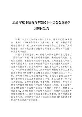 2023年度主题教育专题民主生活会会前的学习研讨发言近期,本人通过集中学习和个人自学,再次对党的XX大报告、党章、《XXX著作选读》(第一卷、第二卷)等相关内容进行了再学习,对XXX新时代中国特色社会主义思想有了更深的感悟,为开好民主生活会打牢了思想基础。结合工作实际,和大家做个交流:一要学理论悟思想。XXX新时代中国特色社会主义思想以两个结合为根本途径推动理论创新,是顺应时代大势、适应实践所需、根植文化沃土的科学真理,以马克思主义中国化时代化新的飞跃,引领新时代党和国家事业取得历史性成就、发生历史性变革。作为党员干部,我们要抓住学习教育这个根本,持之以恒学懂弄通做实XXX新时代中国特色社会主义思想,坚定不移用XXX新时代中国特色社会主义思想统领XXX一切工作,始终保持XXX工作正确政治方向。要矢志不渝做XXX新时代中国特色社会主义思想的坚定信仰者、忠实实践者,带头学习政治理论,坚持带着崇敬、带着感情、带着信仰、带着责任使命深学细悟XXX新时代中国特色社会主义思想。要全面学习领会XXX新时代中国特色社会主义思想的科学体系、精髓要义、实践要求,用XXX新时代中国特色社会主义思想的强大真理力量锤炼党性作风、强大实践力量破解工作难题、强大精神力量振奋精气神,切实把学习成果转化为纵深推进XXX工作高质量发展的具体行动和实际成效。二要重实践办实事。理论的价值在于指导实践,理论的说服力、感召力从根本上说源于在科学指导实践中展现的真理力量。自学习贯彻XXX新时代中国特色社会主义思想主题教育开展以来,我们以更高标准、更严要求、更实措施,引导和推动全体党员把学习贯彻XXX新时代中国特色社会主义思想引向深入,引导和推动全体党员大兴调查研究之风,引导和推动全体党员以深查实改的成效取信于民,引导和推动全体党员把工作抓实、抓深,确保主题教育方向不偏、力度不减,努力取得实实在在的成效。党员干部担负着治党兴国的重任,要提高抓落实能力,把求真务实精神贯穿其中,以敢担当、敢作为的魄力抓落实,以抓铁有痕、踏石留印的恒心抓实践。空谈误国,实干兴邦,实现新时代的新使命,实践是根本,抓落实是硬道理,要在工作中出实招、求实效,在实践中增才干、强本领,狠抓落实不松劲,奋发有为不懈怠,真正在担当赶超主旋律中谱写自己的人生乐章。作为XX领导,当下重点发展是解决一切问题的基础和关键。我将带XXX全体人员,坚定不移地把发展作为第一要务,牢固树立新发展理念,持续推进产业转型升级,全面对标五个XXX目标建设,统筹推进经济社会发展,做好六稳工作,落实六保任务,锐意改革,攻坚克难,努力提升我市高质量发展水平。三要懂规矩严自律。无规矩则殆,家无规矩则败,国无规矩则衰。重规矩、讲规矩,已经深深渗透到每一个中国人的血脉之中。没有规矩不成其为政党,更不成其为马克思主义政党。我们党的党内规矩是党的各级组织和全体党员必须遵守的行为规范和规则。党的规矩既包括党纪法规硬杠杠,也包括道德操守软约束。XXXXXX强调:把懂规矩、守规矩作为衡量一个干部是否合格的重要标准。党的XX大提出,从现在起,中国共产党的中心任务就是团结带领全国各族人民全面建成社会主义现代化强国、实现第二个百年奋斗目标,以中国式现代化全面推进中华民族伟大复兴。奋进新征程,要进一步加强懂规矩教育,强化党员干部讲规矩意识,真正把纪律和规矩立起来、严起来、执行起来。只有用纪律和规矩把全党凝聚成一块坚硬的钢铁,才能团结带领全国各族人民完成好党的中心任务,实现全面建成社会主义现代化强国的奋斗目标。作为XX党员领导干部,我将认真履行党风廉政建设主体责任,严格遵守政治纪律和政治规矩,带头落实廉洁从政的各项规定,管好亲属和身边工作人员,堂堂正正做人,清清白白做官,干干净净做事,树立为民务实清廉的人民公仆形象。
