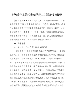 县级领导主题教育专题民主生活会发言提纲按照《中共××县纪委机关中共××县委组织部中共××县委学习贯彻XXX新时代中国特色社会主义思想主题教育领导小组关于认真学习贯彻XXXXXX重要讲话精神开好主题教育专题民主生活会的通知》(×委组〔2024〕1号)要求,我紧扣主题教育主线,结合思想和工作实际,认真查摆自身不足,深入剖析问题根源,明确问题整改措施,现将对照检查情况汇报如下。一、问题查摆(一)对照六个方面检视查摆问题1.学习贯彻XXX新时代中国特色社会主义思想方面。一是学习主动性不强。虽然能够按照主题教育的要求开展学习,但仅仅满足规定动作,个人自学较少,缺乏主动性。二是学习不够深入。对XXX新时代中国特色社会主义思想的深刻内涵未能深入掌握,在学深弄懂悟透上还有差距,缺乏深度和广度,例:选择性学习多系统学习少,划线标注多,深入研读少。三是学用结合不够紧密仅仅满足学了看了,就学习而学习,未能将主题教育所学所悟的政治理论成果与民政工作实际有机融合,从而转化成解决问题瓶颈的有效措施,对分管领域的养老事业发展、项目建设中存在的深层次问题缺乏以政治的思维和高度去深谋远虑,存在两张皮现象。例:审计反馈整改的××敬老院、××敬老院整改进度严重滞后,总以×××××等客观理由一拖再拖,导致不能按期整改可能被省市通报的政治风险。2.维护党中央权威和集中统一领导方面。一是政治站位有待提高。自认为长期接受党的教育,历经多个岗位,政治立场、政治意识是坚定的,但深入剖析还有差距,工作中偏重于业务思考缺乏政治考量,极易引发业务问题上升到政治问题,给我县民政事业带来负面影响。例:××敬老院项目在××××,后在审计中发现该问题造成负面影响。二是大局意识有待提升。谋划工作缺乏全局考量,局限于自已分管领域,更多考虑如何从本部门去抓落实,完成分管领域的各项考核指标,未能从全局乃至全县角度思考。三是意识形态警惕性不高。日常工作生活中,面对部分群众非议上级组织决策,发表有损党和政府形象的言论时,自已未能坚决抵制和制止,缺乏政治敏锐性。3.践行宗旨、服务人民方面。一是主动服务意识有待加强。民政部门履行民生保障职责,解决人民群众急难愁盼问题,但日常工作中基本是按计划去开展工作,被动接受完成各项目标任务在主动作为上缺乏主观能动性。例:开展农村互助养老工作以抓点、抓现场会为主,在抓点扩面惠及更多老年人群上缺乏思考,主动服务意识有差距。二是为民办实事的力度有待提升。工作中能够对分管领域各项工作研判部署,但由于事务繁多,缺乏跟踪督导问效。例:适老化改造项目实施过程中,因该项目实施户数较多,且较为分散,日常检查仅仅对××××××进行抽查,对×××××××实施情况掌握不够,该项目产生的社会效果,发挥的社会作用如何缺乏全面系统掌握和深度研判。4.求真务实,狠抓落实方面。一是责任意识有待加强。工作中偏重于抓重点工作,其他日常工作存在重安排轻督导,甚至安排了之,当甩手掌柜,后续跟踪督导不够,责任意识缺乏。二是攻坚克难锐气不足。日常事务中存在好干的工作干得多一点,快一点,不好干的工作存在畏难情绪,绕着干、拖着干,甚至不干例:审计反馈问题整改项目因××××××,导致整改进度严重滞后,面临被上级部门通报风险,对如何解决资金缺口,加快手续办理缺乏攻坚克难的信心和解决问题的有效途径。三是压力传导不够。工作局限于安排部署,对如何抓好落实上压力传导不够存在好人主义倾向,怕说重了话影响同志之间的感情。5.以身作则、廉洁自律方面。自己多年从事检察、纪检工作对法的威严,纪的敬畏有深刻的认识,日常工作生活中能够严格要求自己,时刻以党纪国法衡量自己一言一行的标尺,以身作则作好示范,并严格要求分管领域的各位同志。但也还存在一些不容忽视的问题,一是上下班纪律要求不严,存在迟到早退现象;二是在不违背原则的情况下,偶尔存在接受他人宴请的情况。6.履行全面从严治党政治责任方面。一是党风廉政建设一岗双责履行有差距。平时工作存在重业务、轻党建现象,对分管股室和部门的党员干部谈心谈话少,监督力度不够,党建工作标准不高,活动不够经常。二是党内监督作用发挥不到位。工作中虽然做到班子成员相互补台不拆台,有效推动民政工作上台阶但缺乏较真碰硬的斗争精神,对一些倾向性苗头性的问题缺乏及时提醒和有效监督,存在好人主义倾向。(二)对照树立和践行正确政绩观检视剖析的问题。1.树立和践行正确政绩观方面。民政为民、民政爱民,关心群众疾苦,解决群众急难愁盼问题就是最正确的政绩观。日常工作生活中,我始终坚守为民谋福祉的底线,不沽名钓誉,不贪大求洋,树立正确的政绩观。但还存在一些问题。一是思想认识有待进一步提高。对工作成绩停留在领导及上级主管部门的认可上,对群众是否满意缺乏认知。例:农村互助养老现场会虽受到市县领导认可,但现场会后该项工作后