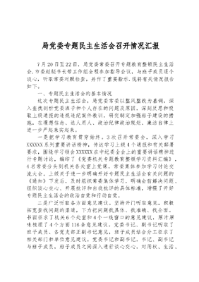 局党委专题民主生活会召开情况汇报7月20日至22日,局党委常委召开专题教育整顿民主生活会.市委赵秘书长带工作组全程参加指导会议,与班子成员逐个谈心,听取常委对照检查,并作了重要指示.现将有关情况报告如下。一、专题民主生活会的基本情况这次专题民主生活会,局党委常委以整风整改为基调,深入查找剖析党委班子和个人存在的问题及原因,深刻反思和吸取上级通报的违规违纪案件教训,研究制定加强班子建设的措施,在理想信念、选人用人、政治纪律政治规矩、廉洁自律上进一步严起来实起来。一是把学习教育贯穿始终。3次召开常委会,深入学习XXXXXX系列重要讲话精神,传达学习上级4个通报和有关部署要求,围绕学习领会XXXXXX在中纪委全会上的重要讲话精神进行专题讨论,编印了《党委机关专题教育整顿学习资料汇编》,4名常委分头到机关各处室上党课,常委集体参加学习讨论交流大会。上级关于进一步明确开好专题民主生活会有关问题的《通知》下发后,及时组织常委集体学习,明确会前解决问题、组织谈心交心、开展批评和自我批评的具体标准,增强了开好专题民主生活会的政治自觉和行动自觉。二是广泛听取各方面意见建议。坚持开门听取意见,积极拓宽查找问题的渠道,下力把问题找具体、找准确、找全面。书面征求了机关6个处室和4个一线窗口的意见建议,原汁原味梳理了4个方面116条意见建议。党委书记、副书记听取了班子成员、各党支部正副书记意见,班子成员结合分工征求了相关部门和单位意见建议。党委书记和副书记,书记、副书记与班子成员,班子成员之间深入进行谈心交心,对用权、生活、交往等方面的问题,大家都敞开心扉、坦诚交流,本着对班子建设高度负责的态度诚恳指出、拉拉袖子。三是认真落实会前说清楚的要求。党委常委围绕三个说清楚,采取当面和书面形式向组织汇报有关情况,如实填报《领导干部个人有关事项报告表》和《参加党的组织生活情况调查表》,向党交心、向组织交明白账。常委主动说清楚在家属子女和身边工作人员情况,从特权思想和严守规矩纪律上深入剖析问题,都表示坚决按上级有关规定要求办。四是以整风精神开展批评和自我批评。坚持三评一诺的做法,采取个人自评、大家互评、领导点评、本人作出公开承诺的方式,一个人一个人地过,书记、副书记打头炮,在批评和自我批评上与过去比有突破。自我批评开门见山、直奔问题,敢于触及思想、触及灵魂、触及实质性问题。有的深刻剖析了政治敏感性不强、在选人用人上把关不严的教训;有的认真检讨了解决历史遗留问题缺乏主动担当精神,存在新官不理旧账、遇到矛盾绕道走的思想;有的深入查摆了推荐使用干部投感情票,对说情风、打招呼抵制不力的问题;有的全面剖析了廉洁自律方面的差距,深挖特权和贪图安逸思想。相互批评见人见事、真刀真枪,不评功摆好、不放空炮、不以提希望建议代替批评。有的批评正副书记对个别干部带病提拔是负有责任的,有的批评班子成员请示报告制度落实不好,有的批评班子成员较真碰硬不够、遇到硬骨头有等待观望心理,有的批评班子成员缺乏责任担当、落实工作慢,有的批评班子成员在工作指导、工作作风上还有形式主义的东西,共提出90条批评意见,对每名同志的批评意见都在7条以上,大家都红了脸、出了汗,真正批出了党味、辣味、火药味,党的优良传统得到了很好恢复和弘扬。常委一致感到,批评和自我批评这种好传统好氛围必须保持好、经常化。二、对正风肃纪反腐的认识和反思党中央英明决策坚决正风肃纪防腐,彰显了作风建设永远在路上的决心意志和使命担当,局党委坚决拥护常委同志通过认真学习习XXX重要指示,联系实际反躬自省,对贪腐的严重危害性和深刻教训的认识不断加深。一是坚持从政治上全局上认识。反腐败斗争触及的是重大政治原则和大是大非问题,是彻头彻尾的政治问题。选人用人的腐败,任人唯亲唯利严重破坏党的干部路线和党管干部原则,搞团团伙伙结党营私严重冲击党内团结统一,说一套做一套严重损害广大党员干部信仰信念,践踏法制日无法纪严重影响依法治国从严治党进程。腐败流毒就像政治上的埃博拉,对政治生态造成严重破坏。二是充分认清危害是全面的深层次的。腐败问题的损害是源头污染、上风雾霾,是内伤甚至是致命伤,搞乱了思想,涣散了组织,践踏了法纪,败坏了作风,造成有的同志办事找人成为惯性、当官花钱成为套路、圆滑世故成为本事,甚至有千里马止步、老黄牛寒心、老实人吃亏、两面人得意的不良现象,释放的信号是会干不如会跑,导致大官跑、小官也跑,干得不好的跑、干得好的也跑。甚至搞团团伙伙,存在浓厚的家天下色彩,使跟党走不如跟人走、进班子不如进圈子成为不少人的为官哲学。三是坚决打好整肃治理这场硬仗。我们在开好专题民主生活会的基础上,下一步重点抓好4件事:(1)常态搞好警示教育,引导各级深刻认识贪污腐败的严重危害性,使广大党员干部真正受警醒、明底线、知敬畏。(2)围绕在