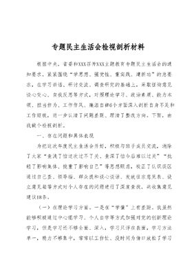 专题民主生活会检视剖析材料根据中央,省委和XXX召开XXX主题教育专题民主生活会的通知要求,紧紧围绕学思想、强党性、重实践、建新功的总要求,在学习讲话、研讨交流、调查研究的基础上,采取征询意见谈心交心、自我反思等方式,对照理论学习、政治素质、能力本领、担当作为、工作作风、廉洁自律6个方面深入剖析自身不足和工作短板,进一步认清了问题差距、理清了整改方向。下面,由我做个检视剖析。一、存在问题和具体表现为把这次年度民主生活会开好,积极与班子成员交流,消除了大家查浅了怕这次过不了关、查深了怕今后难以过关批轻了影响集体、批重了影响自己等思想顾虑,校正了认识误区通过自己查、领导指、群众提和谈心谈话、发放征求意见表、设立意见箱等方式对个人存在的问题进行了深度查找,共收集意见建议18条。(一)在理论学习方面。一是在学懂上有差距。我虽然能够积极通过中心组学习、个人自学等方式加强对党的创新理论学习,但是学习还不够全面、深入,学习只浮在表面,学习方法单一,精力不够集中,常常以工作忙、没时间为借口放松了学习要求,对XXX新时代中国特色社会主义思想的核心要义、丰富内涵精神实质理解还不够。二是在弄通上有差距。作为XXXX,虽然对XXX新时代中国特色社会主义思想进行了学习和研读,但XXX,且初次接触XXX,对XX管理工作了解相对较少,平时把主要精力放在经营管理工作上,存在一定的重工作、轻学习的现象。三是在做实上有差距。由于XXXX特点,XXX主要依赖XXX,开展工作更多的是拼人缘、靠积累、凭经验;对标XXX、XXX,在创新XXX、推动XXX度、xxxx等方面做得还不够,理论学习和实践运用结合不够紧密;解决老旧遗留问题、重大问题时,思维不够开阔,招数办法还不多,没有体现新思路。(二)在思想政治方面。一是政治敏锐性不强。在政治立场上是坚定的,但对一些政治敏感性、坚定性很强的问题,没有很好的讲从政治的高度去认识和把握实际问题,对社会上一些错误言论辨别力不强,对社会上、网络上出现的一些错误言论,不能及时给予制止,对歪风邪气斗争不够。二是贯彻执行不到位。对一些重要工作、重大事件,缺乏主动性、预见性,在贯彻落实中央,省委和XXXX决策部署时,对标执行不够到位、不够精准,安排部署的多,缺乏抓落实的实招,工作标准不够高、要求不严,特别是在落实中碰到困难时,积极主动协调、想办法克服的少。三是大局观念不够强。没有正确处理好民主与集中的关系,对民主与集中的统一性、整体性把握不准,有时片面地、过分地强调民主,忽视集中领导的主导地位。研究讨论问题、发表意见事先沟通少,容易出现因意见不一致产生矛盾、影响团结;有时对自己分管的工作不善于提出见解,多数是没意见,议事决策民主氛围不浓。(三)在能力本领方面一是聚焦重点抓落实的狠劲韧劲不够在解决XXXX、XXXX/开发新的经济增点以及解决XXXX,XXXX、XXX,XXXXX,XXX等方面上推进不够快,力度还不够大,硬的措施和实的招数不够多。二是自我约束不严。自觉接受政治纪律、组织纪律、廉洁纪律、生活纪律的标准还不够高,没有自觉用党的政治纪律、组织纪律、廉洁纪律、生活纪律严格要求自已,规范自己方行,存在被动接受监督多,主动接受监督少,八小时内接受监督多,八小时外接受监督少的现象。三是创新精神还有待加强。XXXX提出争取XXX的要求的还有差距,带领班子在积极挖潜增效、提高创收能力上力度还不够大、办法还不够多、措施还不够明显。在XXXX问题上下功夫、使气力气还不够足在解决制约XXX发展的人才队伍建设上办法还不够灵活,人才流失问题还没有得到根本性改观,对XXX发展排忧解难思谋不够多、想得不够远。(四)在担当作为方面。一是工作标杆还有待提高。在任务重、压力大的时候,首先想到是怎么样尽快完成工作任务,存在着以应付求过关的想法,工作计划做的不够及时和周密,不能很好的指导工作,工作完成后思考总结不到位,导致工作成效不明显。只求过的去,不能从尽善尽美、时时处处争一流的标准上去把握。二是创新精神还有待加强。在具体工作中,开展工作的方式创新不够,对上级安排的工作虽然也保质保量的完成了,但是没有新意,对xxx经济运行和管理存在专业知识缺乏,管理手段单一,来xxx时间较短,对xxx日常经营和管理没有形成完整的工作思路和打算。三是主动作为不够。在具体工作中,开展工作的方式过于保守,力度上不够,思路创新不够。对于上级安排部署的工作按部就班,没有新意,不能够做到创造性的完成工作。特别是安全维稳、服务保障等工作方面,下的功夫不够。(五)在工作作风方面。一是宗旨意识不牢固。在抓工作、谋发展时,考虑短期效益多,急于出成绩、走捷径,站在群众立场思考少,以人民为中心思想不够牢,倾听群众的意见和呼声不够多,对基层情况的了解和把握也不够全面准