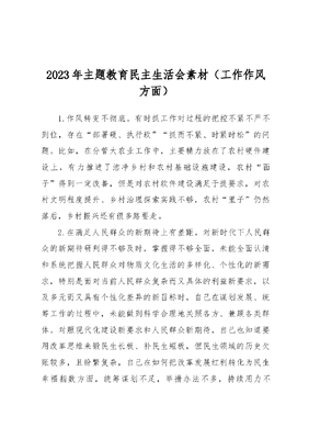 2023年主题教育民主生活会素材(工作作风方面)1.作风转变不彻底。有时抓工作对过程的把控不紧不严不到位,存在部署硬、执行软抓而不紧、时紧时松的问题。比如,在分管大农业工作中,主要精力放在了农村硬件建设上,有力推进了洁净乡村和农村基础设施建设,农村面子得到一定改善,但是对农村软件建设满足于提要求,对农村文明程度提升、乡村治理探索实践不够,农村里子仍然落后,乡村振兴还有很多路要走。2.在满足人民群众的新期待上有差距。对新时代下人民群众的新期待研判得不够及时,掌握得不够全面,未能全面认清和系统把握人民群众对物质文化生活的多样化、个性化的新需求,特别是面对当前人民群众复杂而又具体的利益新要求,以及多元而又具有个性化差异的新目标时,自己在谋划发展、统筹工作的过程中,未能做到科学合理地关照各方、兼顾各类群体。对照现代化建设新要求和人民群众新期待,自己也知道要用改革思维来锻民生长板、补民生短板,但民生领域的历史欠账较多,且纷繁复杂,自己在如何把改革发展红利转化为民生幸福指数方面,统筹谋划不足,举措办法不多,持续用力不强,成效还不够明显。3.在满足人民群众的精神文化需求上有差距。在日常工作和生活中,对干部群众的物质文化生活方面考虑得多一些,关注点常常放在如何加强和改善硬件上,认为这样见效快、反响好,能够快速增强干部群众的获得感幸福感安全感,但对干部群众多样化、多层次、多方面的精神文化需求方面关注不足、调研不多、了解不够,没有充分发挥出社会主义核心价值观引领精神文化需求的重要作用,一些干部群众在智力、健康、道德、素养、个性等方面的全方位协调发展上的短板日渐显现,在会前征求意见时,一些干部群众提出了虽然现在物质文化生活改善了,但精神还不够富足的问题,这是我们的责任,还没有真正打通人民群众对美好生活的向往的最后一公里。4.践行以人民为中心的理念不够严实。主观上有时会认为以人民为中心的发展理念比较抽象玄奥,自己又在业务部门,与以人民为中心的关系不是特别直接和紧密,因此,存在着做好本职工作就是践行了以人民为中心理念的片面认识,在思考谋划如何将本职工作更好地服务于以人民为中心理念方面,缺少积极性和主动性,有一些好想法也常常停留在口头上、止步于思想中,未能将以人民为中心的理念完全体现在谋发展、做决策、促改革的各环节和全过程,对照协心协力推动共同富裕取得实质性进展的要求,自己并没有真正画好最大同心圆。5.听取干部群众的意见建议不够充分。与一些同志相比,自己在摆正位置,放下架子,扑下身子,拜干部群众为师方面,还存在一定差距,虽然能够做到问需于民、问情于民,但在问计于民、问政于民方面责任压得不实,忽视了人民群众的主体地位和首创精神,特别是在制定一些单位内部的政策方案时,听取干部群众的意见不够多,导致干部群众参与单位发展的积极性不够高,导致一些出台的工作措施未能完全契合单位发展的需要,也没有贴近日常实际需求,一些干部群众对此有意见。6.我为群众办实事实践活动推进不够均衡。在实践活动推进的过程中,对干部群众的实际需求考虑得不够全面系统,集中表现在对干部群众关心的重点问题关注得比较多,热点问题解决得比较快,但在涉及历史遗留的难点问题上,用力不足,效能不高,推进缓慢,解决问题不够彻底。虽然制定了考核督导方案,但综合运用跟踪督办、重点督办、挂牌督办的力度不够,有时只是注重下督办件,跟踪督办却持续用力不足,导致各部门在分工协作解决问题上,缺乏广度、深度、力度,使一些工作的效果打了折扣。7.推进我为群众办实事实践活动的方法不够科学。我为群众办实事和党史学习教育结合不够紧密,注重解决干部群众的操心事、烦心事、揪心事,但在解民忧的过程中,对宣传新时代党的创新理论思考不足、形式不新,方法不多,虽然为干部群众办了好事实事,但在借力打力,传递党和政府声音,让新时代党的创新理论走进干部群众心坎方面成效还不够明显,发动干部群众、组织干部群众、引导干部群众还未真正形成工作态势,班子带着党员干、党员带着干部群众干、干部群众之间比着干的干事创业浓厚氛围也尚未根本形成。8.我为群众办实事实践活动的成效优势不强。对分管干部的教育、引导、纠正不够及时有力,干部为群众服务的内生动力不足,导致有的干部将为群众办实事作为形象工程、政绩工程,把做做样子、拍拍照片、写写材料当成主要任务,落实成效却成了次要目标,群众反映的问题清单没有完全转变成为群众办实事的履职清单,有的干部也未能通过我为群众办实事实践活动,真正树立以人民为中心的服务意识。对实践活动中形成的做法经验总结提炼宣传得不够及时有效,在实践活动中形成的走访反馈、跟踪督导、效果评估、激励约束等先进做法,没有及时固化为针对性和可操作性强的长效机制,一些重点工作跨越式赶超的思想优势和发展后劲稍显