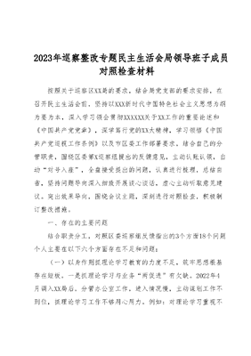 2023年巡察整改专题民主生活会局领导班子成员对照检查材料按照关于巡察区XX局的要求,结合局党支部的要求安排,在召开民主生活会前,坚持以XXX新时代中国特色社会主义思想为纲为要为本,深入学习领会贯彻XXXXXX关于XX工作的重要论述和《中国共产党党章》,深学笃行党的XX大精神,学习领悟《中国共产党巡视工作条例》以及市区委工作部署要求,结合自己的分管职责,围绕区委第X巡察组提出的反馈意见,主动认账认领,自动对号入座,全盘接受提出的问题,认真进行梳理,总结自省,坚持问题导向深入细致开展谈心谈话,虚心主动听取意见建议。突出效果导向,围绕会议主题,深刻进行对照检查,积极制订整改措施。一、存在的主要问题结合职责分工,对照区委巡察组反馈指出的3个方面18个问题个人主要在以下六个方面存在不足和问题:(一)以身作则抓理论学习教育的力度不足,筑牢思想根基存在短板。一是抓理论学习与业务两促进有欠缺。2022年4月调入XX局后,分管办公室工作,进入情况慢,主动谋划工作不到位,抓理论学习工作不够用心用力。例如:对理论学习重视不够,读原著悟原理不够深刻,交流研讨未能入脑入心。二是推进落实意识形态工作责任制不到位。在意识形态工作如何结合XX工作实际,理直气壮推进意识形态建设,筑牢意识形态思想防线方面,思路不清晰、目标不具体,导致落实意识形态责任制不到位压紧压实力度不够。例如:区XX局落实意识形态责任制不到位,压紧压实力度不够。(二)把握两个大局与新时代要求有差距,处理棘手复杂问题的魄力不强。一是履职尽责有差距。自从分管XX科后,没有深入推进爱国主义展厅建设工作,主动作为的意识不强。例如未能通过深挖馆藏资源、创新宣传途径等招法开展爱国主义教育工作多局限在微信公众号发文等形式。未对爱国主义教育基地展厅建设进行深入研究加快推动,项目仍停留在研究设计方案阶段二是XX安全意识树的不牢。未能深刻理解XX安全是XX工作的生命线,作为分管安全的领导没有迎难而上,攻坚克难守住底线、消除隐患不及时、不彻底。例如:巡察期间夜间实地走访发现区XX局所在大楼大门敞开,人员随意进出无人值守管理,存在XX管理安全隐患。(三)履行管党治党政治责任不到位,作风建设用力不足。一是管党治党责任落实不扎实。层层传导责任压力不及时,在亲自谋划部署、亲自检查推动上做得不到位。有时认为全面从严治党工作有办公室在落实,自己做好统筹谋划就可以,没有亲历亲为进行督促检查,对分管科室落实主体责任、遵守廉洁纪律情况进行监督不经常。比如:区XX局对全面从严治党主体责任重视不够、发现研判问题不主动。二是廉政风险排查工作没有走深走实没有从提高政治站位、强化履责担当意识、树立廉洁用权观念的高度去做好廉政风险排查工作,存在着学习领会不到位、贯彻落实有差距、组织领导待加强等问题。例如:2020至2022年未开展干部个人廉政风险排查。三是推进履职、廉政谈话有差距。没有真正把履职谈话和廉政谈话作为加强党风廉政建设的重要手段,作为分管领导,在细管理、重落实、强督导上做的不到位。比如履职谈话和廉政谈话记录中存在内容雷同的问题。(四)党建工作落实有偏差,支部功能发挥不充分。一是履行支部委员职责不到位。自己抓支部工作标准立得不高,在营造风清气正的良好环境、淬炼忠诚担当的党性修养上与上级要求还有差距,落实政治三力标准不高,没有牢固树立抓好党建是最大政绩的理念,对如何促进支部建设思考不够。例如:领导班子会均未针对党员教育、支部计划总结、党日活动等进行研究讨论。二是对党规党纪把握不精准。作为支部委员,学习运用《党支部工作条例(试行)》不到位,对党规党纪的深刻内涵理解有差距,导致推进党支部议事决策科学化、民主化、制度化不严谨例如:支委会记录中发现研究签订合同、支付经费、干部考核晋升等事项,与领导班子会研究内容重合混淆。(五)坚持正确用人导向用力不足,干部队伍建设存在薄弱环节一是抓干部队伍建设精准度不高。没有真正树立起建设一支素质高、作风优、能力强的干部队伍的意识,在工作中对《干部选拔任用工作条例》及相关制度规定落实不到位。比如:提拔动议环节不规范,讨论决定干部任免事项不充分,执行选任程序不严格。作为分管领导把关不严,对规程了解不深,对条例制度、规定把握不准确。二是对干部日常管理不严格。存在思想懈怠情况,落实《区XX局请销假管理制度》不到位,对干部请销假手续把关不严,未能从严管理好干部队伍。例如:个别干部未履行请假审批程序,请销假制度执行不规范,作为分管领导,缺乏对干部请销假的监督。三是对干部长远发展考虑不足。作为分管领导,没有在顶层设计上下功夫,日常开展干部业务培训的质量不高、次数较少,干部招录时对招考的专业考虑不周、思虑不详,未能招录到XX专业人才。例如:区XX局对干部业务培训不充分不及时,难以适应新时代XX工作发展要
