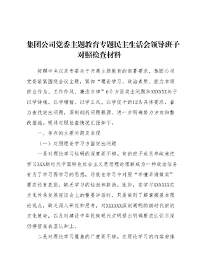 集团公司党委主题教育专题民主生活会领导班子对照检查材料按照中央以及市委关于开展主题教育的部署要求,集团公司党委紧紧围绕会议主题,紧扣理论学习、政治素质、能力本领担当作为、工作作风、廉洁自律6个方面突出问题和XXXXXX关于以学铸魂、以学增智、以学正凤、以学促干的12条具体要求,着力查找突出问题,深刻剖析问题根源,进一步明确努力方向和整改措施。现将对照检查情况汇报如下。一、存在的主要问题及表现(一)对照理论学习方面突出问题一是对理论学习钻研的深度还不够。有的班子成员单纯地把学习XXX新时代中国特色社会主义思想理论理解成为一种政治任务有为了学习而学习的思想,导致在学习中对照学懂弄通做实要求还有差距,缺乏学习的钻劲和挤劲。比如,在学习XXXXXX在文化传承发展座谈会上的重要讲话时,只是做到了解掌握基本理论观点,缺乏深入研究和思考,对XXXXXX深刻阐明的新时代新的文化使命,以及对建设中华民族现代文明提出明确要求认识不深仍停留在表层认知上。二是对理论学习覆盖的广度还不够。在理论学习的内容安排上,缺乏全面性系统性思考,主要以中央和市委规定的必学篇目为主,与集团自身担负的职能和工作实际结合还不紧密,学习内容涉及治水思想、经济发展、营商环境等方面还不够多,对新思想、新理论全面理解把握不到位。三是对理论学习转化的力度还不够。贯彻落实学思用贯通知信行统一要求还有差距,工作中仍然存在惯性思维、路径依赖心理,运用党的创新理论指导实践、推动工作的新举措、好招法还不多。比如,如何将六个坚持这一重要思想蕴含的世界观和方法论运用到高质量发展实践中,集团党委没未能提出具体的办法措施,推动理论学习成果与实际工作对接还不够紧密。(二)对照政治素质方面突出问题一是政治站位还不够高。班子成员习惯于从分管领域或者集团的角度来考虑问题、谋划工作,还不善于站在全市发展大局的高度找准集团定位坐标,明晰发展目标,胸怀国之大者,心系市之大计,积极服务和融入我市新发展格局还不到位。比如,今年在落实关于××资产划转工作中,个别班子成员认为资产划转对集团年度经济指标完成影响冲击很大,而且涉及多方面利益,有思想顾虑,工作主动性积极性不高,虽然在集团党委统筹推动下,按时完成了工作,但也说明班子成员从政治和大局高度思考问题还有欠缺。二是政治领悟力还要不断增强。虽然能够通过集体领学、个人自学、专家导学、交流研学等方式加强领导班子对XXX新时代中国特色社会主义思想的学习理解,但深层次领悟重要思想的科学体系、精髓要义和实践要求还不够,特别是对标XXXXXX关于××××重要讲话和指示批示精神,结合生产经营中心工作开展研究还未能做到学深悟透,对推动水务事业发展建设性的意见建议提得还不多。三是政治敏感性还要不断强化。对当前各种社会思潮交织,多元文化碰撞给职工思想政治工作带来的挑战在思想上有清晰的认识,也能主动加强分析研究,有针对性的提出解决措施,旗帜鲜明维护党和国家的权威,但与时俱进适应新形势发展需要提出新思路、拿出新办法做的还不够,思想政治工作及时性、实效性不强,工作质量和效果打了折扣,这也是政治敏感性不强的具体表现。(三)对照能力本领方面突出问题一是推动高质量发展的能力还要增强。完整、准确、全面新发展理念,综合运用创新、协调、绿色、开放、共享思想理论,破解发展难题、增强发展动力、厚植发展优势,推动集团高质量发展还有差距。比如,当前集团聚焦××发展目标,正全力城市供水保障能力优化提升,推动供排一体发展、调整产业结构,加快布局新兴战略产、打造多元支撑新经济增长点,在如何保证各项工作齐头并进,相互促进方面,集团党委统筹谋划、前瞻思考还不到位。二是破解服务群众难题的能力还要增强。能够自觉树立和践行以人民为中心发展思想,努力提高服务群众的能力水平,但对照市委市政府的要求和市民企业的期盼还有较大差距。比如,在用户抄表维修方面,一直是群众诉求较多急难愁盼问题,集团虽然在规范服务流程、健全规章制度、严明工作纪律下了功夫有了一定的工作成效,但省市热线投诉占例仍然较高。三是防范化解风险挑战的能力还要增强。有的班子成员如履薄冰的危机意识还不强,凝心聚力坚决打好防范化解风险攻坚战有效化解各类风险挑战的意识还要进一步提高。比如,在抓安全生产风险防范方面,能够针对当前国内安全生产形势严峻的实际结合水务行业特点,开展安全隐患排查整治等专项工作,但有的单位覆盖不全面,有的工作抓的不深入,导致一些风险隐患没有及时发现解决,被市安全督导组检查发现并给予通报,进一步说明集团党委在风险防范的底线思维树的不牢。(四)对照担当作为方面突出问题一是善于斗争能力不够强。敢于涉险滩、啃骨头的闯劲、拼劲、冲劲有所缺乏,没能把较真碰硬的精神体现到每个领域,每项工作当中。比如,在应收账款清收工作中,集团党委虽然下达了