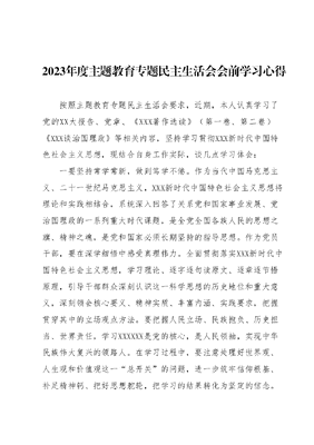 2023年度主题教育专题民主生活会会前学习心得按照主题教育专题民主生活会要求,近期,本人认真学习了党的XX大报告、党章、《XXX著作选读》(第一卷、第二卷)《XXX谈治国理政》等相关内容,坚持学习贯彻XXX新时代中国特色社会主义思想,现结合自身工作实际,谈几点学习体会:一要坚持常学常新,做到笃学不倦。作为当代中国马克思主义、二十一世纪马克思主义,XXX新时代中国特色社会主义思想将理论和实践相结合,系统深入回答了关系党和国家事业发展、党治国理政的一系列重大时代课题,是全党全国各族人民的思想之旗、精神之魂,是党和国家必须长期坚持的指导思想。作为党员干部,要在深学细悟中感受真理伟力。全面贯彻落实XXX新时代中国特色社会主义思想,学习理论、逐字逐句读原文、逐章逐节悟原理,引导干部群众深刻认识这一科学思想的历史地位和重大意义,深刻领会核心要义、精神实质、丰富内涵、实践要求,把握贯穿其中的立场观点方法。要把握人民立场、民族抱负、历史担当、世界责任,学习XXXXXX是党的核心,是人民领袖,实现中华民族伟大复兴的领路人。在学习过程中,要注意处理好世界观、人生观和价值观这一总开关的问题,进一步筑牢信仰根基、补足精神钙、把好思想舵轮,把学习的结果转化为坚定的信念。二要坚持深学深悟,做到知行合一。XXXXXX关于坚持和发展中国特色社会主义的重要论述为我们党的发展指明了方向,提供了根本遵循,我们要充分领会其精神实质,不断用创新理论武装头脑、指导实践、推动工作。要讲规矩、守纪律。树立群众观念深入基层调查研究,带着责任和担当、带着追求和思索,联系实际,探究本质、解析机理,在思考中把握规律,在思考中抽丝剥茧、洞悉内涵,重实际、说实话、办实事、求实效,不断研究提出解决问题的可行思路、有效办法和管用措施,不断提高敢于斗争、善于斗争的能力本领。要讲道德、有品行。继承和发扬党的优良传统和作风,结合中华优秀传统文化、社会管理、群众服务业务知识,全面了解蕴含中华优秀传统文化和现代文明中的思想精华,多学新理论、新知识、新技术,不断弥补知识弱项、能力短板、信息盲区,以社会公德、职业道德最基本、最朴素、有底线的方法和人格魅力,建立健康的生活情趣。明辨是非,克己慎行,讲操守,重品行。带领群众、组织群众,把各项工作落实在日常。要讲奉献、有作为。牢记党的根本宗旨,履职尽责,服务群众、奉献社会,始终保持干事创业、开拓进取的精气神,始终把群众利益放在第一位,坚持把个人追求融入党的事业之中,始终做到学而充电、思而蓄电、践而放电、悟而发电,在面对矛盾危机和困难坎坷中,善于客观分析、冷静对待,善于独立观察、认真思考,善于全面平衡、准确识别,在服务基层、服务群众的过程中进一步增强宗旨意识和群众观念,密切党群、干群关系,树立党员干部可亲、可信、可敬的形象。三要坚持实学实干,做到作风务实。实学不是死记硬背,而是要实实在在学懂弄通XXX新时代中国特色社会主义思想,深刻理解、化为信念。实干不是生搬硬套,而是要抓铁留痕、久久为功从人民群众所急所盼所愁出发为民解难题、办实事、出实效常言道:空谈误国,实干兴邦。实干是新时代党员干部的基本要求和价值引领。从革命时期内忧外患、百业待兴,到综合国力稳步提高、社会事业全面进步,靠的就是实干精神。这份实干,体现在英雄们勇挑重担、舍己为人中;这份实干,体现在党政军民学,8万余人风餐露宿、饱经风沙的植树造林、防风固沙的战场上;这份实干,体现在XXX艰难困苦的七年梁家河知青岁月中。作为党员干部,要脚踏实地地干好本职工作,高标准、严要求地开展工作,确保把平凡的事情做到极致。在做实做好的基础上,学会巧干,尝试摸着石头过河,敢于冒险打破常规,敢于进行思想碰撞,利用多元化思维拓展新思路,开创工作新局面,为建设美丽xx贡献自己的力量。