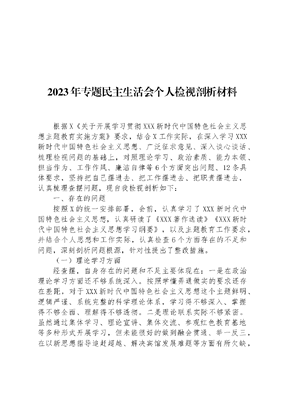 2023年专题民主生活会个人检视剖析材料根据X《关于开展学习贯彻XXX新时代中国特色社会主义思想主题教育实施方案》要求,结合X工作实际,在深入学习XXX新时代中国特色社会主义思想、广泛征求意见、深入谈心谈话、梳理检视问题的基础上,对照理论学习、政治素质、能力本领、担当作为、工作作风、廉洁自律等6个方面突出问题、12条具体要求,坚持把自己摆进去、把工作摆进去、把职责摆进去,认真梳理查摆问题,现自我检视剖析如下:一、存在的问题按照X的统一安排部署,会前,认真学习了XXX新时代中国特色社会主义思想,认真研读了《XXX著作选读》《XXX新时代中国特色社会主义思想学习纲要》,以及主题教育工作要求,并结合个人思想和工作实际,认真检查6个方面存在的不足和问题,深刻剖析问题根源,针对性提出了整改措施。(一)理论学习方面经查摆,自身存在的问题和不足主要体现在:一是在政治理论学习方面还不够系统深入。按照学懂弄通做实的要求还存在差距,对于XXX新时代中国特色社会主义思想这个主题鲜明、逻辑严谨、系统完整的科学理论体系,学习得不够深入、掌握得不够全面、理解得不够透彻。二是理论联系实际不够紧密。虽然通过集体学习、理论宣讲、集体交流、参观红色教育基地等多种形式开展学习,但未能很好的做到融会贯通、举一反三,在以新思想指导追赶超越、解决宾馆发展难题等方面有所欠缺,没有很好的同X工作结合起来。三是融合转化的力度不够。在运用XXX新时代中国特色社会主义思想指导工作、推动发展上做得还不够,理论学习和实践运用结合不够紧密,不能灵活转化为破解疑难、化解问题的思路办法,在解决工程遗留问题时,思维不够开阔,招数办法还不多,解决老问题没有体现新思路。(二)在思想政治方面经查摆,自身存在的问题和不足主要体现在:一是全面从严治党主体责任落实不到位。作为X,把党建工作与X经营业务工作同部署、同落实、同检查,结合的不够紧密,多措并举抓党建,抓好党建促发展的工作思路没有完全贯彻始终。二是对干部管理监督力度还不够。对党员干部教育管理制度坚持得还不够,还缺乏行之有效、切合实际的创新性活动载体,党员干部政治纪律、组织纪律、工作纪律、工作作风和工作效率还有差距,政策学习不到位,警示教育作用不够明显。三是廉政建设意识不够强。组织和参加单位党风廉政教育活动主动性不够,党风廉政教育知识和相关法律法规学习不够,理解不深,对作风整顿管理有待加强。(三)在能力本领方面。经查摆,自身存在的问题和不足主要体现在:一是啃硬骨头的精神不足。比如:由于X条件,人员流动非常大,尤其管理人员的招聘就更加困难。面对此现象,在培养管理人员方面没有深层次的去挖掘现有人才,没有广泛调动优秀员工的积极性,发挥出他们各自的优势,进而更好的充实管理干部队伍。二是较真碰硬措施不强。深入基层,深入一线,深入班组不多,了解掌握情况不深不细,倾听一线员工的意见建议少,缺乏在工作时逢山开路、遇水架桥的魄力。有时抓工作停留在简单的安排部署上,缺乏一竿子插到底的毅力。三是党员意识还有差距。安排得多,督促得少,比如对部署工作上要求的多,教方法的少;宏观指导的多,扑下身子抓落实的少;表面上做的多,深入基层一线少;听中层管理人员汇报的多,倾听一线员工心声的少。作为党员领导干部,没能很好的带动其他的同志。(四)在担当作为方面。经查摆,自身存在的问题和不足主要体现在:一是对从严治党执行制度有差距。存在抓经常性的思想政治建设不够的问题,对身边的党员干部在遵守政治纪律、严守政治规矩方面的约束和管理还有待加强。有时在工作中,对一些小的问题,有时认为没有必要,也就独自去执行了。二是对工作标准要求不够高,性格比较急躁,接到任务后,在一些事情上容易因为工作的态度问题与员工们产生矛盾,有时对待工作想的是怎样尽快完成,而不是怎样做到最好。(五)在工作作风方面。经查摆,自身存在的问题和不足主要体现在:一是宗旨意识不够牢。基层调研或检查工作时不够深入,调研安排时间短、走点多、蹲点少,对职工群众反映的困难和问题收集得多,过问得少,了解面上情况多,找深层次原因少,要求相关部门解决多,直面群众少。二是调查研究不够深入。与分管部门干部员工交流多,与其他干部员工交流少,也与宾馆老员工进行了座谈,但在调研时,没能很好引导谈话人把想说的想反映的情况说出来,没有把情况吃准、摸透、搞准,在围绕宾馆发展建设上做的还不够好。三是解决实际问题招数少。工作中,能较好地贯彻领导的意图,完成上级组织和领导交给的各项任务,但是,对于职工和群众反映的情况却是解决的不够及时,不够彻底,在办难事解决问题上缺硬招实招,还没有真正达到让领导放心、让群众满意。(六)在廉洁自律方面经查摆,自身存在的问题和不足主要体现在:一是一岗双责落实仍有差距。安排任务多督促落实少,布置工作多注重实效少,没有真正把党风廉
