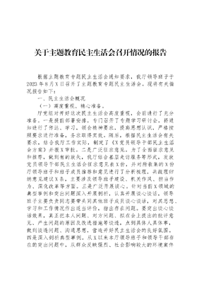 关于主题教育民主生活会召开情况的报告根据主题教育专题民主生活会通知要求,我厅领导班子于2023年8月X日召开了主题教育专题民主生活会。现将有关情况报告如下:一、民主生活会概况(一)高度重视、精心准备。厅党组对开好这次民主生活会高度重视,会前进行了充分准备。一是提前部署安排。专门召开了专题学习研讨会,将通知进行了传达、学习,领会精神要求,提高思想认识,严格按照要求进行准备,务求取得实效。随后,根据民主生活会有关要求,结合我厅工作实际,制定了《X党员领导干部民主生活会方案》并报X审批。二是广泛征求意见。为了全面征求意见和推荐,做到有的放矢,我厅结合基层走访服务等形式,发放党员领导干部民主生活会征求意见表X份,并对所收集的X份厅领导班子和班子成员推荐和意见进行了分析梳理,共疏理归纳意见建议X条,主要涉及领导班子建设、机关作风、担当作为、深化改革等方面。三是广泛开展谈心。针对当前X领域的典型事例和突出问题深入开展剖析,认真开展谈心谈话,领导班子主要负责同志要带头同其他班子成员谈心谈话,对其思想、学习和工作情况作出适当评价,指出存在问题。要突出谈心谈话效果,真正把本人问题、对方问题、拟在会上提出的批评意见、产生问题的原因及改进措施等谈透,点到具体人具体事,做到谈透问题、沟通思想,营造开好民主生活会的良好氛围。四是深入剖析典型事例。从X以来本厅领导班子和领导干部存在的突出问题中,从群众反映强烈、社会影响较大的环境案件中,筛选若干典型事例进行深刻分析。领导班子和领导班子成员自觉把自己摆进去,紧扣民主生活会主题,深入剖析典型事例产生的根源,做到分清责任、认领任务、边查边改,为撰写发言提纲、开展批评和自我批评做好铺垫。五是认真撰写班子对照检查材料和个人发言提纲。领导班子和班子成员紧扣民主生活会主题,对照X的初心和使命,坚持问题导向,强化问题意识,把自己摆进去,把思想摆进去,把工作摆进去,认真反思近年来上级查处的典型环境案例,特别要将我市近年来严重违纪违法案例作为民主生活会的反面教材,深入具体地进行党性分析,做到落细落小、见人见事见思想。在此基础上,厅党组书记主持研究起草领导班子对照检查材料,班子成员自己动手撰写个人发言提纲。(二)严格纪律,确保实效。根据通知要求,报请X联系领导同意后,邀请X督导组副组长、X组织部部务委员X同志,督导组X同志参加,我厅在8月X日召开了党员领导干部民主生活会;按照团结——批评——团结的方式,采取先自我批评、再相互批评的办法,逐个进行。班子成员认真领会X下发的《通知》精神,充分认识开展批评与自我批评的重要意义,结合自身联系和分管的工作,深刻检查个人在学习贯彻XXX新时代中国特色社会主义思想等6方面存在的不足。会议听取了领导班子对照检查情况汇报,严肃认真地开展批评与自我批评。与会同志一致感到领导班子群众能够做到团结大局、民主集中、廉洁奉公,有战斗力,带领全体干部职工充分发挥职能作用。但大多数同志也感到自己还存在对学习还不够,忙于具体事务多,专门抓学习少,以会代学多,有针对性进行学习少,重经验,轻理论,理论与实际联系不紧密;工作有成绩但离上级要求和人民群众的期望还有差距等问题和不足。大家敞开思想,诚恳对待,自我检查开诚布公、襟怀坦白,相互批评开门见山、坦诚磊落,敢于正视自身问题,做到了见人见事见思想,并对班子和其他班子成员实事求是地提出了合理的意见和建议,达到了坦诚相见、加深了解、增进团结的目的。对待同志们的批评能够端正态度,虚心理解。到达了消除误解、交流感情、增进团结、构成合力的良好效果。会上,X同志对本次会议提出了具体要求,充分肯定我厅民主生活会准备充分,剖析透彻,达到了解决问题、增进团结的效果,并强调领导班子要追求卓越,领导干部要追求成功;要善于学习,增强道德修养;要踏实肯干,增强职责感;要勤于思考,增强开拓创新意识。(三)通报状况,强化落实。民主生活会后,根据X文件要求,我厅召开全体干部职工会议,对群众意见和民主生活会上发现的班子、个人存在的主要问题进行了通报,认真分析原因,寻找对策。领导班子成员针对自身存在问题和不足,制定了整改措施,明确了具体时限,确保征求意见件件有着落,存在问题事事有回音。二、会议的总体成效此次党员领导干部民主生活会开得较为成功,主要体现在四个方面:(一)思想认识深刻。厅党组、领导班子成员充分认识到开展批评和自我批评的重要性。能够端正态度对待批评与自我批评,自觉开展批评和自我批评。(二)会前准备充分。会前,班子成员在广泛征求意见和深入调查研究的基础上,认真进行了自我剖析和自我反思,对班子其他成员在党性党风、遵守《廉政准则》等方面存在的不足也进行了分析思考,并且在班子成员间开展了广泛的谈心活动,每位班子成员都认真撰写了发言材,这为开好民主生活会带给有力保证。(三)严于自我剖析。班子成员敢于