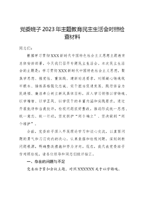 党委班子2023年主题教育民主生活会对照检查材料同志们:根据学习贯彻XXX新时代中国特色社会主义思想主题教育总体安排部署,今天我们召开专题民主生活会。本次民主生活会的主题是:学习贯彻XXX新时代中国特色社会主义思想,聚焦学思想、强党性、重实践、建新功总要求,对照凝心铸魂筑牢根本、锤炼品格强化忠诚、实干担当促进发展、践行宗旨为民造福、廉洁奉公树立新风具体目标,深入学习领悟以学铸魂、以学增智、以学正风、以学促干的丰富内涵和实践要求,通过开展批评和自我批评,检视问题抓好整改,推动形成统一思想、统一意志、统一行动,坚定拥护两个确立、坚决做到两个维护。会前,党委班子深入开展理论学习和谈心交流,以直面问题的勇气和刀刃向内的决心,认真查摆和检视问题,深刻剖析问题根源,明确整改措施和努力方向。现在,我代表党委班子作对照检视,请各位领导和同志们批评指正。一、存在的问题与不足党委班子紧扣会议主题,对照XXXXXX关于以学铸魂、以学增智、以学正风、以学促干重要论述,对照党章党规党纪,对标对表工作部署,紧密联系工作实际,深入查摆问题。(一)《中共中央关于在全党深入开展学习贯彻XXX新时代中国特色社会主义思想主题教育的意见》明确的6个方面1.理论学习方面理论学习深度不够,深学细研思悟不充分、不平衡,把学习当成一种态度、一种责任、一种追求的自觉性还不强,学习的系统性、全面性还有差距。理论指导实践能力有待提升,世界观、人生观、价值观的纯粹性与党员领导干部的要求还有差距,学以致用、学用结合存在短板,化理论为方法、化思想为思路上仍有欠缺。2.政治素质方面政治三力有待进一步提升,政治上的自由主义现象一定程度地存在,把讲政治内化为党员干部基本标准,外化为干事敬业行动标尺的党性锻炼仍需加强。结合工作实际对照自省,在厚植理想、升华境界、纯粹思想上需进一步锤炼。政治意识不够、政治能力不足、政治定力不强依然存在。意识形态工作责任制抓在经常、严在平常、融入日常还有不足。3.能力本领方面面对事业发展出现的各类新情况、新问题、新挑战,惯性思维、僵化思想一定程度上存在,习惯于用老办法解决新问题。在把提升干事创业的能力本领,作为一种政治责任、人生境界、终身追求方面,还有一定差距。对各种斗争的长期性、复杂性和艰巨性的认识还停留在概念、感知层面,教育引导单位上下居安思危的政治清醒、坚如磐石的战略定力还不够,如履薄冰的谨慎、见叶知秋的敏锐仍有不足。4.担当作为方面主动斗争的精神不足,斗争本领有待提升,老好人思想,见怪不怪、事不关己的思想一定程度上存在。面对前进道路上遇到的矛盾和问题,担当作为的魄力、攻坚克难的韧劲和革故鼎新的勇气还有欠缺,在敢想敢为、敢闯敢试上下的功夫还不够。争先创优的意识不强,把基础差、底子薄、起步晚当成工作落后的借口,不求有功、但求无过不同程度存在,勇争一流、有旗必扛的胆气还需持续强化。5.工作作风方面宗旨意识、为民情怀有待加强,在掌握群众所思所想所盼身体力行攻坚克难指导、用心用情用力解决问题等方面仍有差距。落实上级决策部署照搬照抄、上下一般粗的现象,不同形式不同程度地存在。工作作风效能、服务意识还有所欠缺,缺乏躬身入局的自觉。调查研究工作还存在不深不透的现象。6.廉洁自律方面内部巡察功效有待提升,两个责任落实存在时松时紧的现象。廉政建设压力传导不够,纪律规矩意识有待提升,在精益求精还有一定差距。对一体推进三不腐机制建设,还存在薄弱环节,对待四风隐形变异等新变化新表现,警惕性和鉴别力有待提升。对履行一岗双责重视程度不够,重业务轻党建的倾向一定程度存在。监督制约的笼子扎得还不够紧,对重点领域、重点环节、重点事项的监督还存在盲区和漏洞。(二)XXXXXX关于以学铸魂、以学增智、以学正风、以学促干的12条具体要求1.以学铸魂方面自觉用XXX新时代中国特色社会主义思想改造主观世界还不够,全面把握这一重要思想的世界观、方法论和贯穿其中的立场观点方法,还有一定差距。坚定崇高理想信念、构筑共产党人的精神家园,还需持续持久用力。党性修养与党的事业要求和人民群众期盼存在差距。全心全意为民服务宗旨,有待进一步强化。2.以学增智方面政治能力需进一步提升,对两个确立理论体系和思想精髓、丰富内涵理解把握还不深刻,在坚持增强忧患意识和保持战略定力相统一、坚持战略判断和战术决断相统一、坚持斗争过程和斗争实效相统一方面还有欠缺。实践能力需进一步巩固,理论联系实际并在做好理论与实践良性互动的后半篇文章上,仍需下苦功。3.以学正风方面务实之风有短板,调查研究不够深入全面,教条主义、僵化思想、条条框框、本本主义还不同程度地存在,有时存在把说的当做了、把做的当做成了的现象,调研成果转化运用不够充分,持续跟踪问效需进一步用力。在坚持不懈落实中央八项规定精神上,第一责任