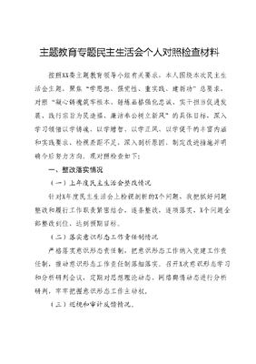 主题教育专题民主生活会个人对照检查材料按照XX委主题教育领导小组有关要求,本人围绕本次民主生活会主题,聚焦学思想、强党性、重实践、建新功总要求,对照凝心铸魂筑牢根本、锤炼品格强化忠诚、实干担当促进发展、践行宗旨为民造福、廉洁奉公树立新风的具体目标,深入学习领悟以学铸魂、以学增智、以学正风、以学促干的丰富内涵和实践要求,检视差距不足,深入剖析原因,制定改进措施并明确今后努力方向。现对照检查如下:一、整改落实情况(一)上年度民主生活会整改情况针对X年度民主生活会上检视剖析的X个问题,我把抓好问题整改和履行工作职责紧密结合,逐条整改,逐项落实,X个问题全部整改到位,达到预期目标。(二)落实意识形态工作责任制情况严格落实意识形态责任制,把意识形态工作纳入党建工作责任制,推动意识形态工作责任制落细落实。召开X次意识形态学习和分析研判会议,定期对思想理论动态、网络舆情动态进行分析研判,牢牢把握意识形态工作主动权。(三)巡视和审计反馈情况。上年度没有巡视和审计反馈问题。(四)组织约谈函询情况上年度本人没收到巡视反馈、组织约谈函询等问题通知。(五)清廉学校建设情况围绕X、X、X、X、XX大体系X条测评内容及标准,突出清廉主题、学校主体、制度主线,深入推进创建工作,成效显著,我校各项工作特别是教学质量显著提高,办学声誉连上台阶。二、存在的主要问题(一)学习贯彻XXX新时代中国特色社会主义思想方面。一是认识理解还不到位。比如,对XXX新时代中国特色社会主义思想这一重要思想的学习有时停留在理论知识方面,并没有上升到理论武装层次,往往只注重理论知识是什么、为什么,主动思考怎么看、怎么办时比较少;常常只看到理论中的过河的任务,深入找寻如何解决问题的桥或船时比较少;二是内容还不系统。有时只注重用党的创新理论思想武装头脑,未能有效地将其与强化政治领导、丰富战略支撑、拓展实践路径、破解发展难题、激发动力活力等方面融会贯通、有效结合。学习时候有偏科现象、看得多、想得多,但对与自己工作无关的一些理论阐述就掌握得不够深、认识得不够透。(二)维护党中央权威和集中统一领导方面。一是在实现与党中央同频共振上尚存时间差。学习中能够确保向党中央看齐,遵循党的理论及路线方针政策,对标党中央的决策部署,但在实际落实过程中,从领会到内化再到行动执行,需经历一段时间和过程,有时导致对党中央认识和执行上不够即时和准确。二是在履行服务大局、维护中心工作方面存在偏差。在执行党中央的路线方针政策及上级决策部署时,策划工作有限于本职工作以及学校的内部范围,经常从学校的角度出发推动工作,致力于实现学校的任务目标,缺少从战略层面、用辩证思维的角度,从整个区域的中心工作和发展大局出发去统筹兼顾和推动任务。(三)践行宗旨、服务人民方面。一是在深刻理解群众心声需求方面尚显浅显和粗糙。在推进教育教学质量的过程中,过于注重完成任务指标和关注有效分数的达线率、增长率,一些数据虽有所增长,但对后进生的关注不够,后进生综合发展有限。二是在解决实际问题上,思路和办法尚不丰富。比如对学生的纪律教育、德育教育有所提升,举办了各种形式的教育活动,但成效未达到预期效果,特别是对部分经常违纪学生的教育引导上办法不多。(四)求真务实、狠抓落实方面。一是调研的能力有待加强对标主题教育和XXXXXX要求,能够深入到各处室、年级组、学科组,但在调研过程中,接触教师多,接触学生少,发现问题不全面、不深入,解决问题不彻底。二是较真碰硬还有差距。遇到困难棘手的问题、处理盘根错节的问题、解决长期存在的老大难问题不够有力,存在绕着走找捷径等心理。例如:针对干部履职不到位,仅仅是提醒提醒,点到为止。(五)以身作则、廉洁自律方面。一是主动接受监督有待加强。接受监督的自觉性还有待加强,对没有监督的权力必然导致腐败的道理是认同的,但有时片面地认为自我约束重于外部监督,对外部监督、社会监督的认识不到位,自觉接受监督的习惯没有养成。二是以身作则还需加强。平时对家人在工作生活监督等方面,还有不到位的地方,经常性的教育、提醒做得还不够好,偶尔有亲戚来访,碍于面子也存在大手大脚的情况,虽然花的是自己的钱,但事后想想也是不应该。(六)履行全面从严治党政治责任方面。一是在严管所辖上还有差距。对党员干部教育、监督、管理还需进一步严明,通过召开会议、谈心谈话部署教育得多,深入开展廉政谈话、廉政提醒不够经常。如:以违纪违法案件为镜鉴,推进以案示警、以案促改还需持续深化。二是创新工作上有待提高。当前正是学校高质量发展的关键期,面对机遇和挑战,有时仅停留在确保高效完成各项重点工作任务和分管的日常工作上,对如何把业务工作与全面从严治党,与党风廉政建设结合起来,进一步增强工作的针对性和有效性,缺乏创新的工作思路和办法。(七)
