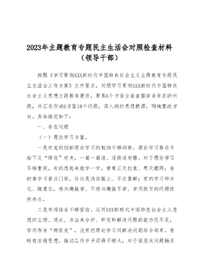 2023年主题教育专题民主生活会对照检查材料(领导干部)按照《学习贯彻XXX新时代中国特色社会主义主题教育专题民主生活会工作方案》文件要求,对照学习贯彻XXX新时代中国特色社会主义思想主题教育要求,聚焦6个方面全面查摆自身存在的问题,共汇总形成6方面18个问题,深入剖析思想根源,明确整改方向。具体情况如下:一、存在问题(一)理论学习方面。一是对党的创新理论学习的韧劲不够均衡。理论学习存在开始下足绣花功夫,一篇一篇读、逐段逐句悟。对于理论学习不够重视,有的想起来就学一学,常常三天打鱼、两天晒网;有的拿学习装点门面,往往是浅尝辄止、不求甚解;有的学习碎片化、随意化,感兴趣就学、不感兴趣就不学,学用脱节的问题依然存在。二是学用结合不够紧密。运用XXX新时代中国特色社会主义思想的立场、观点、方法来分析、研究和解决问题的能力还不足,学用存在两张皮,没有把理论学习同解决问题结合起来。有时有求稳思想,推动工作步子迈得不够大,对于深层次问题触及得不够多,与从严治党要求还有差距。三是宣传党的创新理论缺少创新性。在做好新思想的传播者方面存在差距,在学习宣传党的创新理论过程中缺乏创新思想。在学习安排上往往只局限于发布学习计划,在学习模式上未开展分类编组、分级指导的差异化学习,在学习激励上没有措施,在学习方法上缺乏要求,对于广大党员的思想理论水平的提高缺乏指导。(二)政治素养方面。一是全面强化从严治党,综合施策力度不大。面对日益复杂的外部环境和风险挑战,如何有效强化全面从严治党的新思路不多。聚焦当前党员干部存在的突出问题,统筹谋划、综合施策还不到位,在制度执行上效果还不明显。二是防范政治风险的责任扛得不牢。自己的政治洞察力、政治鉴别力存在短板,缺少从纷繁复杂相互交织的社会关系中抓住政治关系。对于防范化解重大风险缺乏明确认识,有时不能鸵鸟心态、讳疾忌医;有时遮遮掩掩、避重就轻;只盯着自己的一亩三分地,对外部的风险隐患缺乏敏感和警觉。强行动自觉还需加强,在重大斗争中去真刀真枪干还有不足,在大风大浪中还不能培养出大智大勇。三是对干部的政治素质考察不够严实。对干部政治素质的隐蔽性和迷惑性认识不够深刻,平时功夫下得不到位,全方位、多角度、立体式了解干部存在短板和不足,缺乏完备的制度保障,导致干部在工作生活中是否出现的不恰当行为没有具体标准,没有确定的定性标准,在自评以及他评时皆可能出现个人主观因素导致的不正确结果。有时碍于面子不愿说实话,导致考察结果与实际情况有出入,对考察结果运用不够到位,导致考察结果的运用出现错误,未能发挥考核应有的风向标示范作用。(三)能力本领方面。一是锤炼政治能力存在成效还不够明显。对锤炼政治能力理解有偏差,主观认为政治能力偏虚偏空,在日常锤炼中找不到有效的抓手。在学思践悟中还做不到思想淬炼、精神洗礼,锤炼出忠诚干净担当的政治品格还有差距,真正做这一思想的坚定信仰者、积极传播者、忠实践行者还需时间。对XXX新时代中国特色社会主义思想掌握还不牢靠、领悟不透彻,政治站位还不高,政治品格还不硬,政治判断力、政治领悟力、政治执行力不强,观察时势、谋划发展、防范化解风险不够主动。二是斗争本领养成持续用力不足。在新时代的重大挑战、重大风险、重大阻力、重大矛盾的伟大斗争中的本领练就不到位。对加强实践锻炼、专业训练还有欠缺,在重大斗争中磨砺、推动高质量发展本领、服务群众本领、防范化解风险本领还需下功夫在重大风险、强大对手面前,有时总想过太平日子、不想斗争,缺乏担当精神,斗争本领不强,实干精神不足。三是应对风险挑战的本领有待提高。对战略机遇与风险挑战并存的客观现状认识不够深刻,安全风险治理理论知识学习不够全面。面对新形势,新发展理念树得不牢,推动高质量发展、做好群众工作、应对风险挑战的本领不够强,对熟练掌握XXX新时代中国特色社会主义思想其中蕴含的领导方法、思想方法、工作方法,缺乏有机融合,履职尽责的能力和水平,还需提高。(四)担当作为方面。一是斗争精神缺乏。干事创业精气神不足,缺乏斗争精神,不敢动真碰硬,不敢攻坚克难,瞻前顾后、畏首畏尾,务好群众作为斗争总目标。没有认识到发扬斗争精神作为实现既定目标、推动任务落实的重要抓手的重要性,遇到矛盾冲突时还不能敢于上,以不到长城非好汉的韧劲、不破楼兰终不还的拼劲和明知山有虎、偏向虎山行的气魄去挑最重的担子、啃最硬的骨头、接最烫的山芋。二是党员传帮带作用发挥不够到位。自己作为老党员,有时只顾提升自身的党性修养,对青年党员关注度不够,未能有效发挥出老党员的传帮带作用。特别是在开展党性分析、党性体检和党性教育的过程中,对于青年党员在言行和工作中的缺点,缺少帮助他们了解、改正错误的思想自觉和行动自觉,对于他们身上存在的苗头性、倾向性的问题,有时担心批评过重会影响他们的身心和成