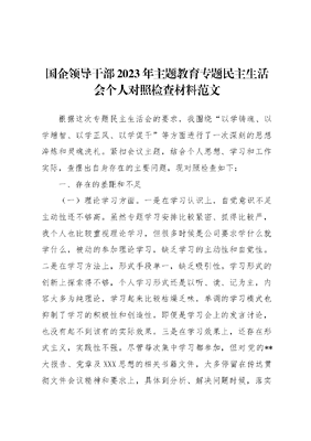 国企领导干部2023年主题教育专题民主生活会个人对照检查材料范文根据这次专题民主生活会的要求,我围绕以学铸魂、以学增智、以学正风、以学促干等方面进行了一次深刻的思想淬炼和灵魂洗礼。紧扣会议主题,结合个人思想、学习和工作实际,查摆出自身存在的主要问题,现对照检查如下:一、存在的差距和不足(一)理论学习方面。一是在学习认识上,自觉意识不足主动性还不够高。虽然专题学习安排比较紧密、抓得比较严,我个人也比较重视理论学习,但很多时候是公司要求学什么就学什么,被动的参加理论学习,缺乏学习的主动性和自觉性。二是在学习方法上,形式手段单一,缺乏吸引性。学习形式的创新上探索得不够,个人学习形式还是以听、读、记为主,内容大多为纯理论,学习起来比较枯燥乏味,单调的学习模式也抑制了学习的积极性和创造性。即便是学习会上的发言讨论,也没有起不到该有的实际效果。三是在学习效果上,还存在形式主义,实践性不强。尽管每次集中学习都参加,但对党的**大报告、党章及XXX思想的相关书籍文件,大多停留在传达贯彻文件会议精神和要求上,具体到分析、解决问题时候,落实还不够深、不够实,存在理论联系实际、学以致用不够的问题。(二)政治素质方面。一是政治素养还需进一步锤炼。虽然自己能够牢固树立四个意识,坚定四个自信,坚决做到两个维护,在思想上政治上行动上能以XXX为核心的党中央保持高度一致。但对标对表,在一些方面,做得还不够,从政治上把大局、看问题、想事情的能力还不足,还有提升的空间。二是政治敏锐性需进一步加强。对意识形态领域的复杂性还缺乏一定的警惕性和鉴别力,对社会上个别消极议论或负面言论抵制还不力,有时认为只要自己不附和、不转发就行了,没有以一个党员的身份去力所能及的进行抵制或弘扬正能量。三是政治引领作用还不够到位。虽能够在重大是非问题上做到信仰不动摇、立场不含糊、方向不偏移。但有时候在一些具体工作中还不善于从政治的高度、全局的角度、战略的维度出发去看待问题、分析问题、解决问题,对政治意义、政治要求、政治影响等想得还不多,不够深入,党建引领作用还不明显。(三)能力本领方面。一是理论武装还不扎实。虽然经常参加联组和支部组织的集体学习研讨、主题党日活动等,对党的**大精神、XXX著作论述进行了全面、系统的学习,但仍存在学习不及时、开展研讨交流不扎实、不深刻的问题,在学懂弄通上还有差距。二是工作标准还不够高。大局意识还不够强,对自己分管的工作考虑多,对公司整体和全局发展工作考虑得相对少,有时候存在小进则满的心态,例如人才配置机制缺乏科学的、系统的、有效的入职测评或考试机制,离更高标准、更严要求,打造优秀的公司服务队伍要求还有一定差距。三是创新探索程度还不足。在公司交办的工作中,虽能主动以改革的思路、创新的办法推动工作,但创新的系统集成还不够完善,人力资源管理有时还停留在传统人事管理阶段,工作中还有求稳、怕犯错误的心态以及不敢突破惯例的想法。(四)担当作为方面。一是担当意识不够强烈。面对一些艰巨繁重的工作,未能及时想尽一切办法去解决,没有去全力发动大家,集合众人的智慧和力量去解决问题,迎难而上的工作精神还不足。二是思想解放还不够彻底。自分管公司人力资源部以来,大部分延用以前的运行模式,虽然在管理制度、用工形式、薪酬绩效、员工福利等具体工作方面,突破性的做出了一些亮点工作,但对如何创新工作思路、如何提升服务等方面还缺乏全面系统深入的研究,缺乏探索创新的及时性、主动性。三是攻坚克难的精神还不够足。在景区酒店行业竞争激烈的背景下,对于公司人才队伍服务能力参差不齐、人员流动性大、旺季用工紧缺等一些复杂棘手的难题,虽然提出了一些有效的解决措施,但不能从根本上解决问题,攻坚克难的拼劲和闯劲还不足。(五)工作作风方面。一是调研的实效性仍需加强。调研的形式相对单一,对一线的工作情况和问题缺少深入的了解和思考。走访调研中,与下属直接交流不够多,在倾听职工呼声、了解需求上仍有不足,调研成果推动问题解决的效果还不明显。二是宗旨意识还不够强。自己日常虽然注重工作的方式方法,认真了解职工述求,结合分管工作实际也研究制定了一些措施,但在办公室里听汇报、下指示较多,沉身问计方面做得还不够好,形式主义、官僚主义的作风在自己身上不同程度地存在,宗旨意识还需进一步增强。三是工作落实的细致性仍需加强。有些工作推进过程中还存在抓而不紧、抓而不细的现象,跟踪问效还不足。对人力资源部提要求、下任务、压担子较多,对其在公司高质量发展中如何更好发挥作用指导不足,指导解决实际困难不够多。(六)廉洁自律方面。一是思想认识还不到位。有时认为自己做到抗腐防变、洁身自好就够了,满足于自己不违法、不违规、不违纪、不触线,存在把自己当成一名普通职工群众的现象,没有以一名班子成员、一名优秀党员的标准严格要求自己。二是教育警示
