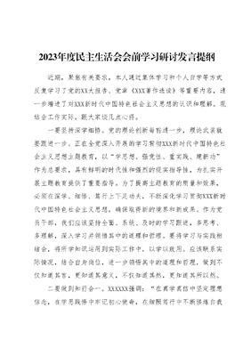 2023年度主题教育专题民主生活会会前学习研讨发言提纲近期,按照学习贯彻XXX新时代中国特色社会主义思想主题教育组织生活会要求,本人通过自学重温了党的XX大报告、党章等有关内容,对新思想有了新的理解和认识,下面结合个人实际,跟大家做个交流。一是学出责任,要坚守一线,对党忠诚。XXXXXX指出:党的事业,人民的事业,是靠千千万万党员的忠诚奉献而不断铸就的。近年来,在以XXX同志为核心的党中央坚强领导下,xx市牢牢把握高质量发展首要任务,全力以赴拼经济、扩开放、惠民生优生态、促团结、保安全、强党建,切实把坚定拥护两个确立、坚决做到两个维护体现到各项工作成效上,经济社会发展稳中有进、稳中提质。下一步,xx的党员干部要坚定信仰,始终坚定共产主义远大理想和中国特色社会主义共同理想,坚持不懈用马克思列宁主义、毛泽东思想、邓小平理论、三个代表重要思想、科学发展观和XXXXXX系列重要讲话精神武装头脑指导实践、推动工作;要站稳立场,坚持党的基本理论、基本路线和基本纲领不动摇,坚决维护党的权威,在思想上行动上始终与党中央保持高度一致;要严守纪律,模范遵守党的政治纪律、组织纪律、工作纪律和群众纪律,始终以共产党员的标准严格要求自己。二是悟好精神,要守土有责,担当实干。4月3日,XXXXXX在学习贯彻XXX新时代中国特色社会主义思想主题教育工作会议上指出,唯有始终保持锐意进取、敢为人先、迎难而上的奋斗姿态,积极担当作为、敢于善于斗争,才能胜利推进强国建设、民族复兴的历史伟业。今年是全面贯彻落实党的XX大精神的开局之年,是落实省委1243战略发展目标、市委631工作思路的起步之年。全市经济增长面临着不少压力和挑战:在产业发展、项目建设、乡村振兴、基本公共服务等方面还存在不少短板,在改革开放、科技创新、医疗、人才等方面还存在不少弱项,在安全发展、意识形态、社会治理、党的建设等方面还存在不少挑战。作为领导一方领导干部,必须坚持把解放思想作为推动一切工作的总开关,以强烈的事业心、责任感,干事创业的精气神,做到守土有责、守土尽责。当前xxx市面临xxxx协同发展、建设乡村振兴示范区两大机遇,这为xxx加速绿色发展带来了新的动力。推动xxx加快发展,要求我们必须高扬改革创新精神,在干事中见状态、见担当、见成效。三是干出激情,要心系百姓,牢记宗旨。XXXXXX在党的XX大报告中指出:人民性是马克思主义的本质属性,党的理论是来自人民、为了人民、造福人民的理论,人民的创造性实践是理论创新的不竭源泉。深入学习领会XXX新时代中国特色社会主义思想蕴含的人民观,是新时代坚持以人民为中心重大实践的基础和前提。中国共产党自成立以来,始终坚持一切为了人民、一切依靠人民,永远保持对人民的赤子之心,永远同人民站在一起,始终代表中国最广大人民根本利益,没有任何自己特殊的利益,从来不代表任何利益集团、任何权势团体、任何特权阶层的利益。人心向背关系党的生死存亡,赢得人民信任,得到人民支持,党就能够克服任何困难,就能够无往而不胜。让人民过上好日子,是我们一切工作的出发点和落脚点。新征程上,要始终把满足人民对美好生活的新期待作为发展的出发点和落脚点,更好满足人民日益增长的美好生活需要,把促进全体人民共同富裕作为为人民谋幸福的着力点。作为领导干部,必须始终坚守为民情怀,把全市人民对美好生活的向往牢记于心,自觉践行以人民为中心的发展思想,时刻心系老百姓生活疾苦,聚焦最广大人民群众的现实需要和最弱势群体的生活保障,切实解决急难愁盼问题,强力推进乡村振兴,持续提升生态环境质量,着力维护社会安全稳定,加快推动教育、医疗两项最根本的民生事业,让更多的人有更多的获得感、幸福感、安全感。